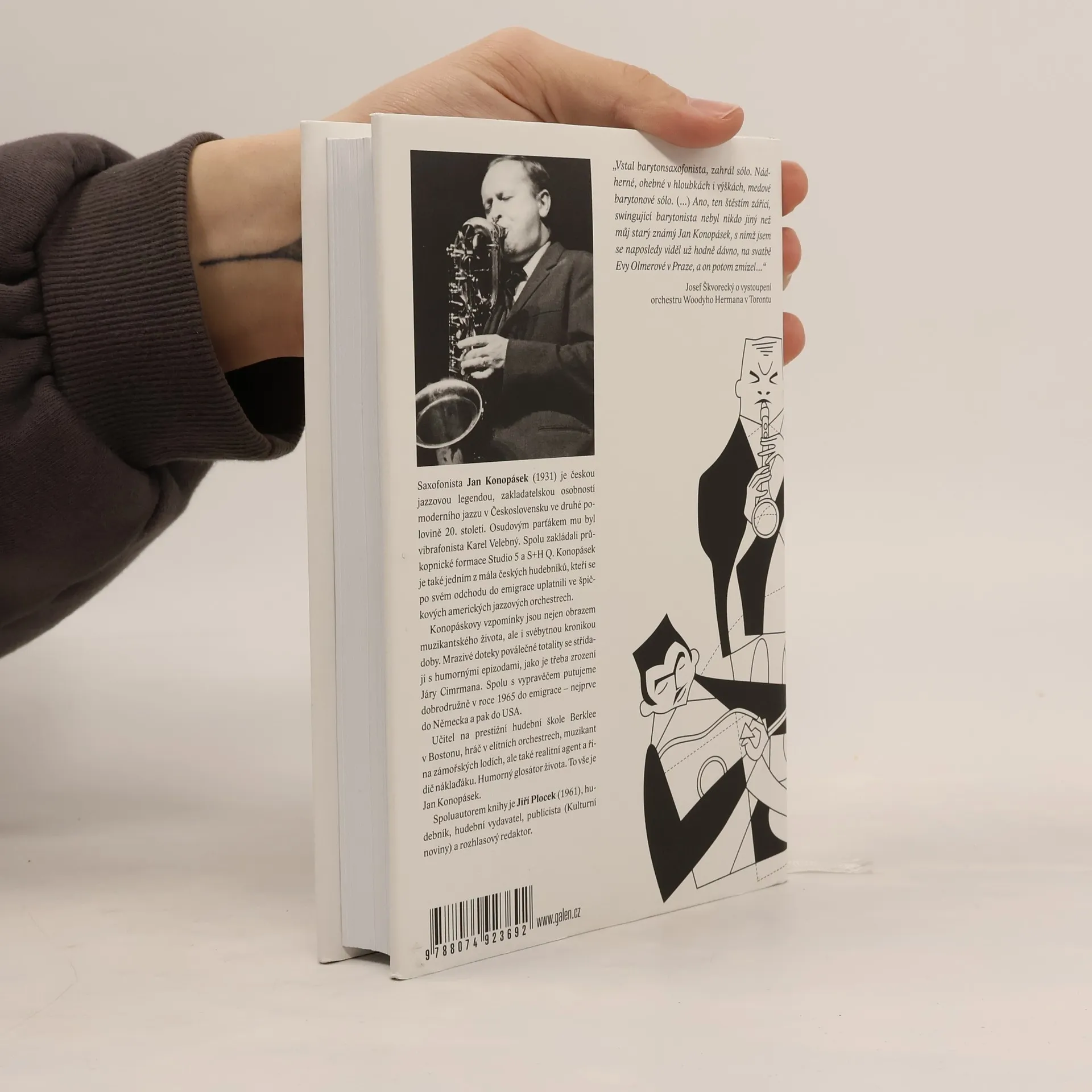 Saxofonista Jan Konopásek (1931) je českou jazzovou legendou, zakladatelskou osobností moderního jazzu v Československu ve druhé polovině 20. století. Osudovým parťákem mu byl vibrafonista Karel Velebný. Spolu zakládali průkopnické formace Studio 5 a S+ H Q. Konopásek je také jedním z mála českých hudebníků, kteří se po svém odchodu do emigrace uplatnili ve špičkových amerických jazzových orchestrech. Konopáskovy vzpomínky jsou nejen obrazem muzikantského života, ale i svébytnou kronikou doby. Mrazivé doteky poválečné totality se střídají s humornými epizodami, jako je třeba zrození Járy Cimrmana. Spolu s vypravěčem putujeme dobrodružně v roce 1965 do emigrace – nejprve do Německa a pak do USA. Učitel na prestižní hudební škole Berklee v Bostonu, hráč v elitních orchestrech, muzikant na zámořských lodích, ale také realitní agent a řidič náklaďáku. Humorný glosátor života. To vše je Jan Konopásek. Spoluautorem knihy je Jiří Plocek (1961), hudebník, hudební vydavatel, publicista (Kulturní noviny) a rozhlasový redaktor.