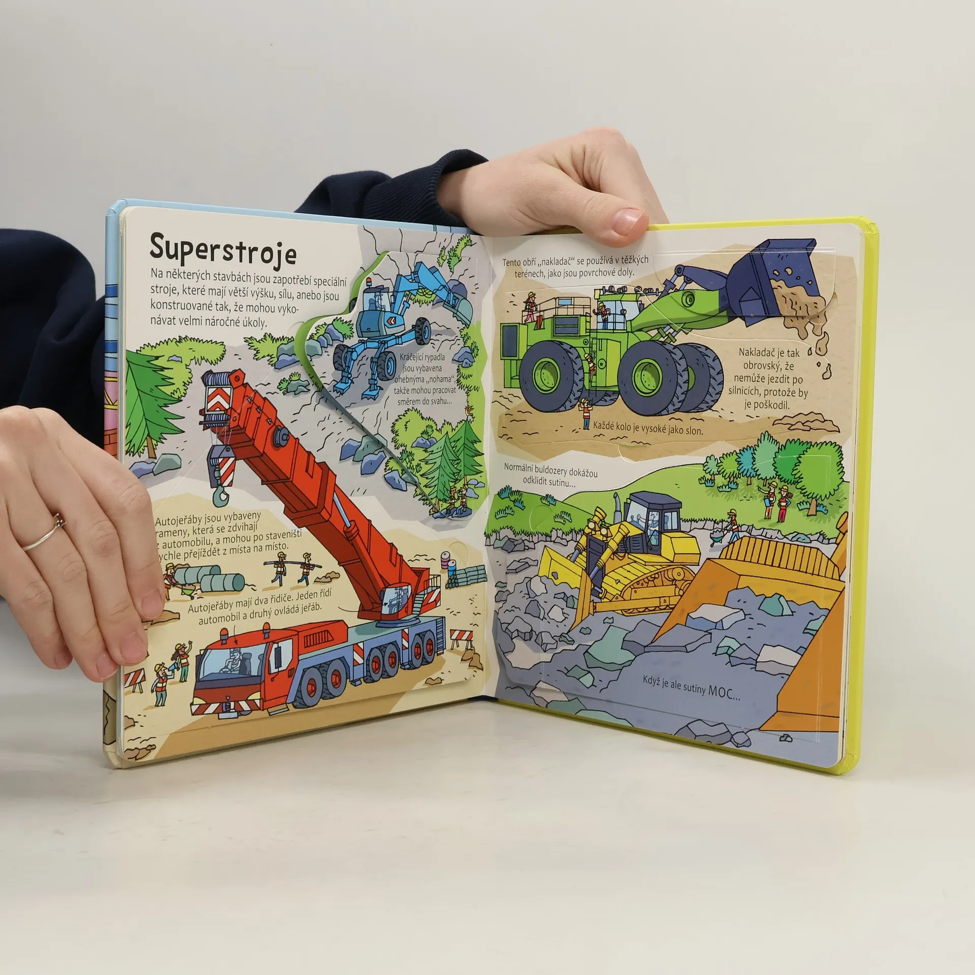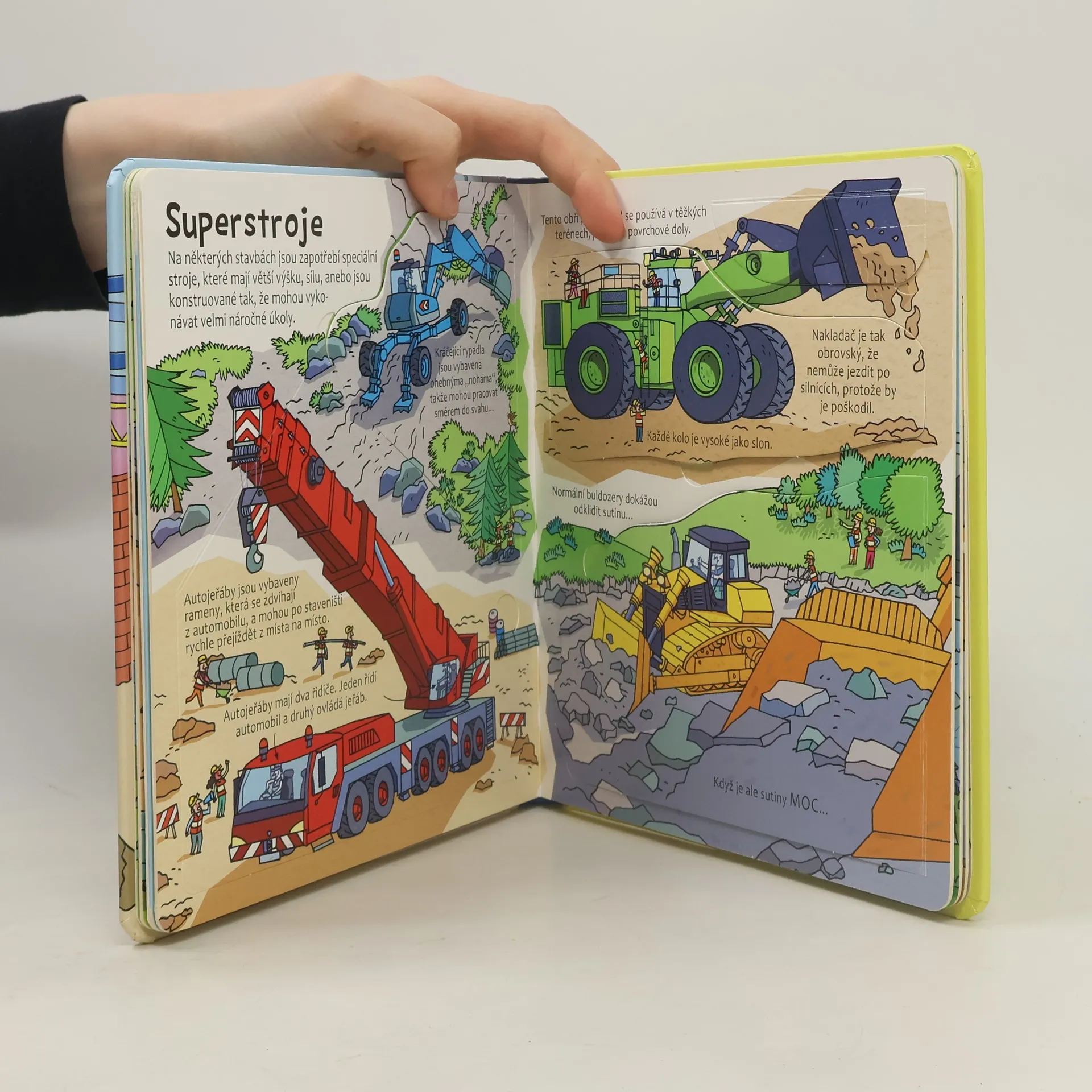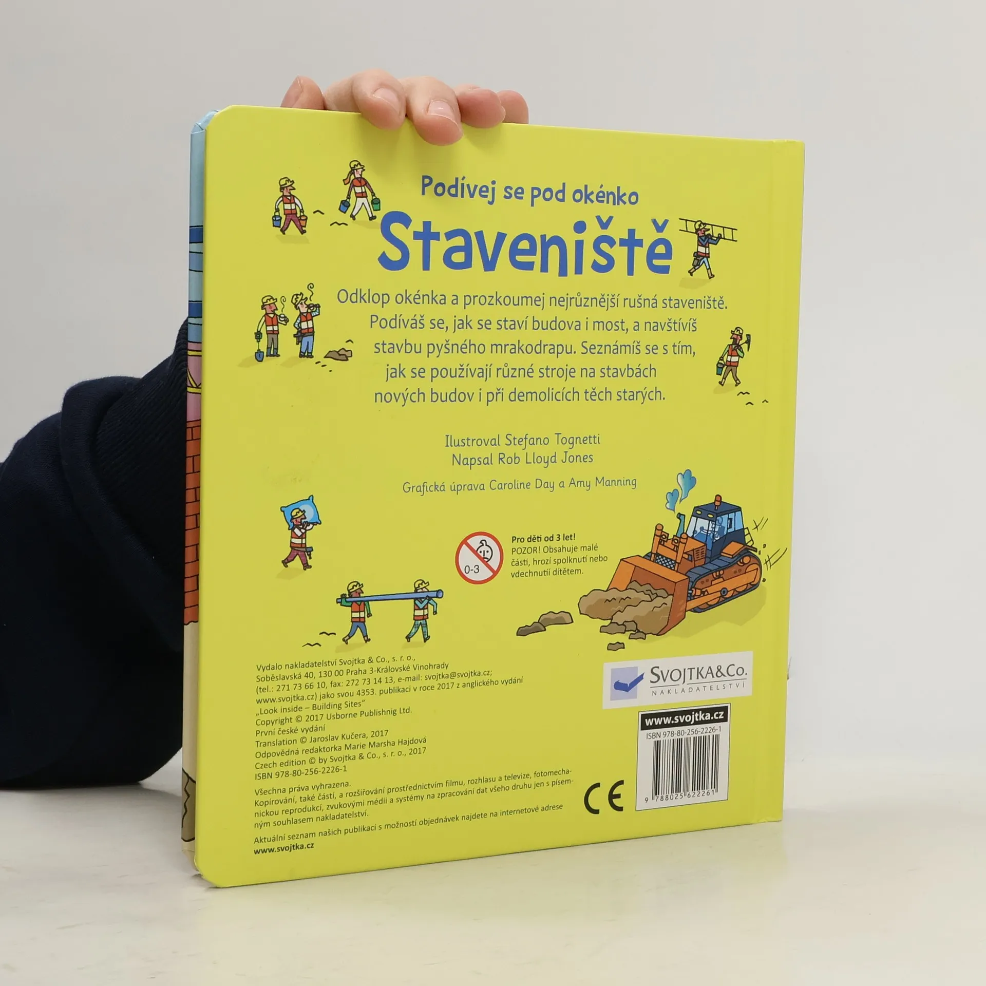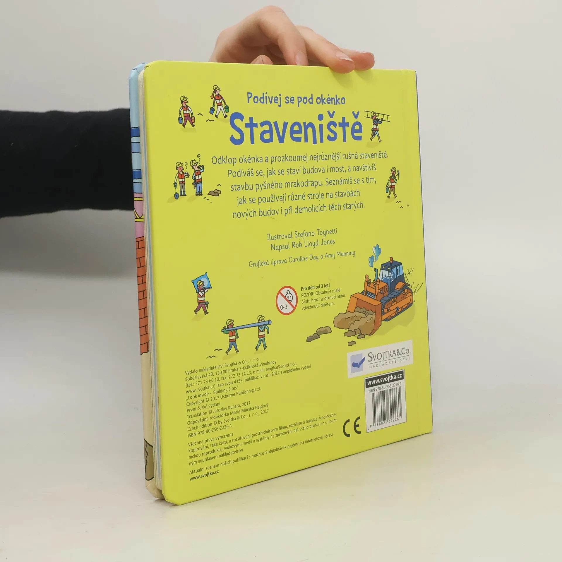 Byl jsi někdy na staveništi? Víš, k čemu slouží všechny ty obrovské stroje, jak se staví dům, mosty či mrakodrapy? Někdy je ovšem třeba domy nejprve zbourat, než se postaví nové. To všechno se dozvíš z této úžasné knížky s více než 40 odklápěcími okénky. Podíváš se na stavby nejrůznějších budov, mostů i silnic a uvidíš, jak se staví základy domu nebo jak se staré domy bourají. Tak odklop okénka, všechny zajímavé informace ze staveniště už na tebe čekají! České vydání publikace nakladatelství Usborne.