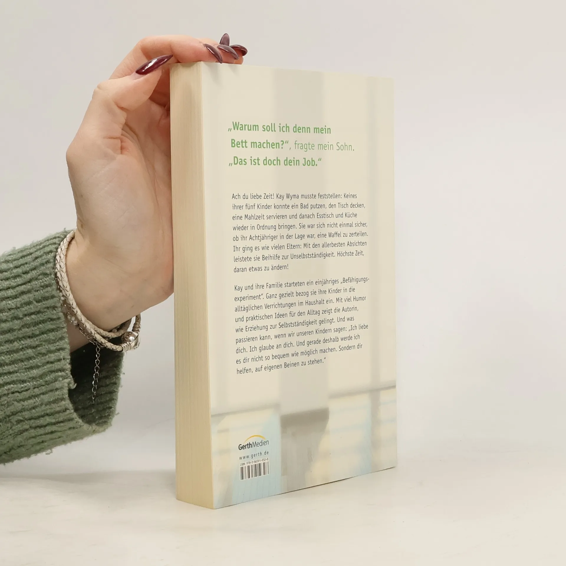 Ach du liebe Zeit! Kay Wyma musste feststellen: Keines ihrer fünf Kinder konnte ein Bad putzen, den Tisch decken, eine Mahlzeit servieren und danach Esstisch und Küche wieder in Ordnung bringen. Sie war sich nicht einmal sicher, ob ihr Achtjähriger in der Lage war, eine Waffel zu zerteilen. Ihr ging es wie vielen Eltern: Mit den allerbesten Absichten leistete sie Beihilfe zur Unselbstständigkeit. Höchste Zeit, daran etwas zu ändern! Kay und ihre Familie starteten ein einjähriges „Befähigungsexperiment“. Ganz gezielt bezog sie ihre Kinder in die alltäglichen Verrichtungen im Haushalt ein. Mit viel Humor und praktischen Ideen für den Alltag zeigt die Autorin, wie Erziehung zur Selbstständigkeit gelingt. Und was passieren kann, wenn wir unseren Kindern sagen: „Ich liebe dich, ich glaube an dich, und genau deshalb werde ich es dir nicht so bequem wie möglich machen, sondern dich an dem beteiligen, was den Alltag und das Leben ausmacht.“