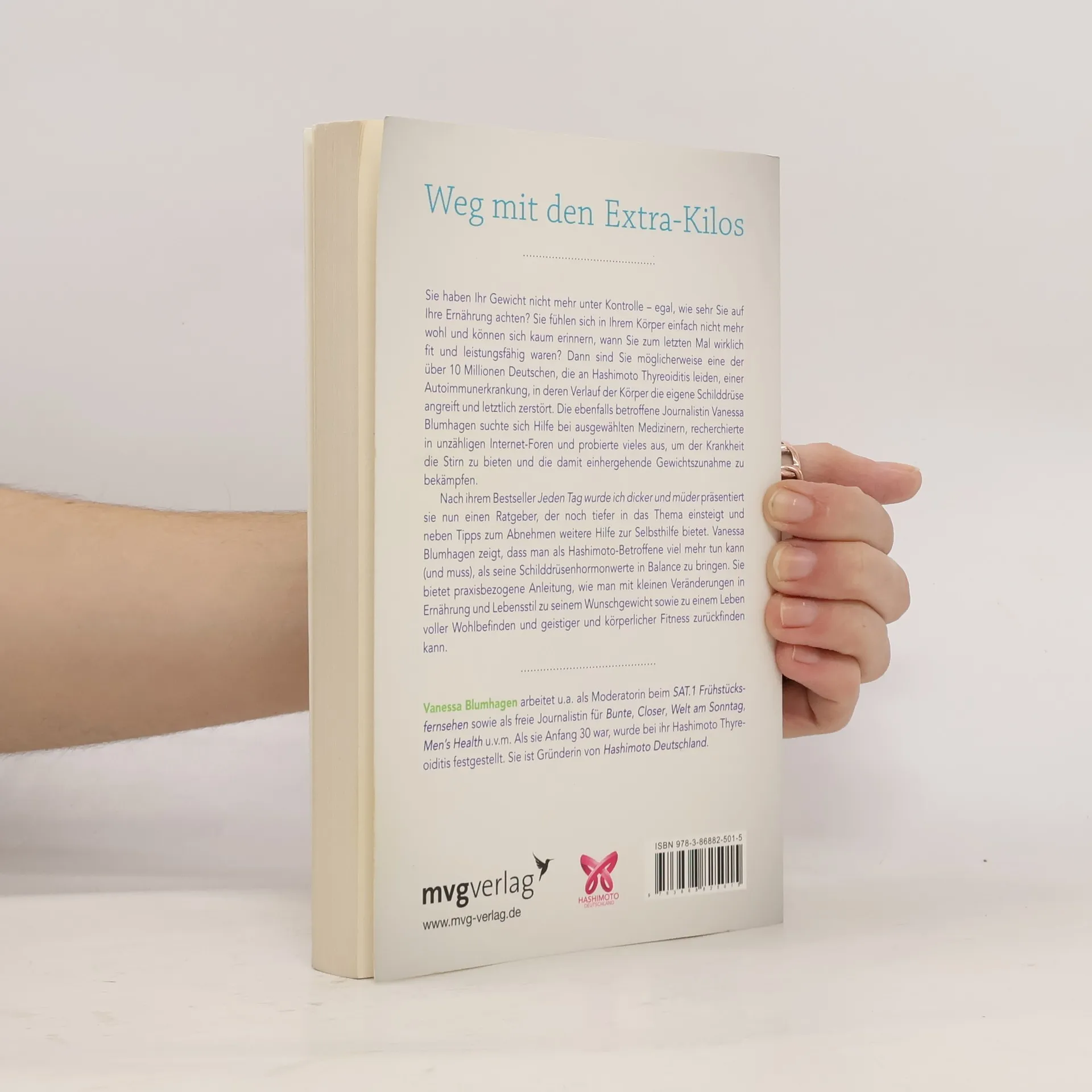 Hashimoto Thyreoiditis ist eine Autoimmunerkrankung, in deren Verlauf der Körper die eigene Schilddrüse angreift und letzten Endes zerstört. Über zehn Millionen Menschen in Deutschland, v. a. Frauen, leiden daran. Zu den Symptomen gehören Schlafstörungen, Depressionen, Zyklusveränderungen, Haarausfall, plötzlich auftretende Nahrungsmittelunverträglichkeiten und vor allem unkontrollierte Gewichtszunahme. Zu allem Überdruss wird man die zusätzlichen Kilos nur schwer wieder los, es genügt nicht, ein paar Kalorien einzusparen und sich ein bisschen mehr zu bewegen. Vanessa Blumhagen liefert einen umfassenden und detailliert recherchierten Ratgeber, in dem sie anhand ihrer eigenen Erfahrungen beschreibt, wie sie die elf Kilo, die sie ungewollt zugenommen hatte, wieder loswurde und zu ihrem Wohlfühlgewicht zurückfand. Sie erläutert alle Bausteine, von Medikamenteneinnahme über spezielle Ernährung bis hin zur nachhaltigen Veränderung von Gewohnheiten, die wirksam gegen die überflüssigen Kilos sind, und klärt auf, was die absoluten Abnehm-Verhinderer sind. Sie zeigt einen Weg, sich auch mit Hashimoto wieder dauerhaft wohl in seiner Haut zu fühlen.