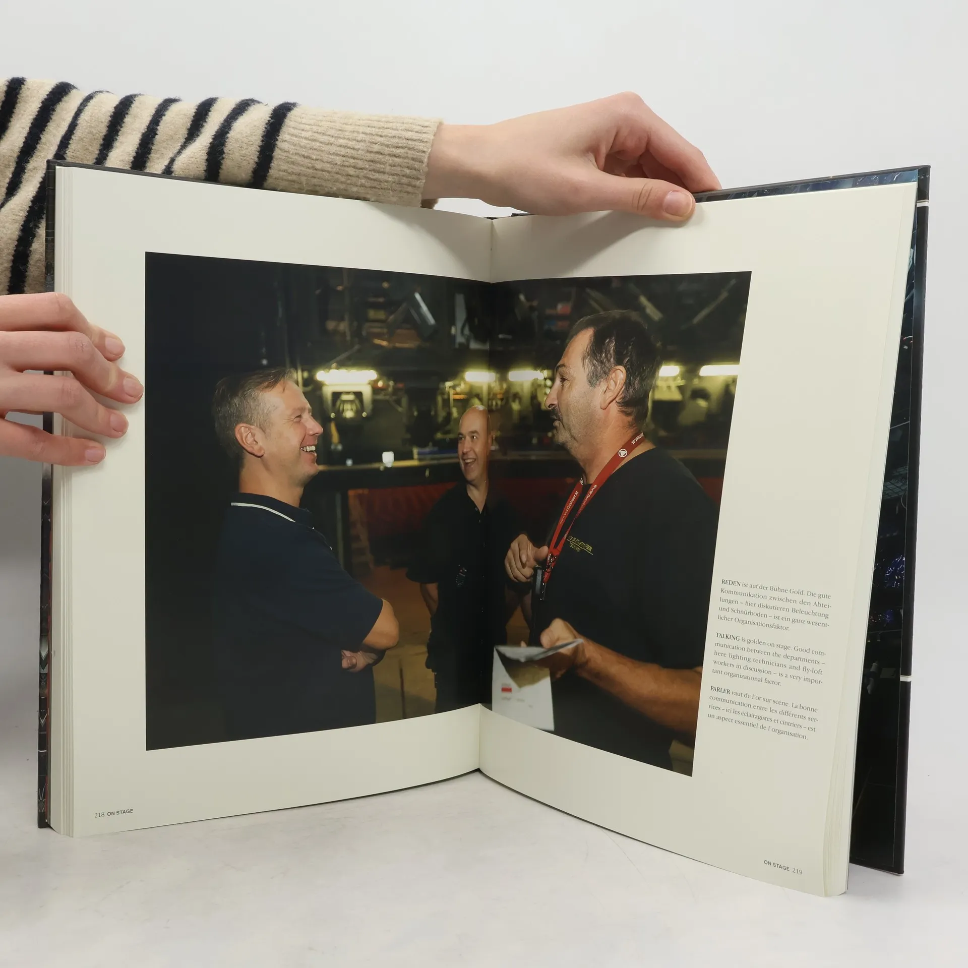 ON STAGE zeigt alles was geschehen muss, damit sich am Abend der Bühnenvorhang über den vorbereiteten Dekorationen eines Opernhauses heben kann. Es zeigt das Zusammenwirken von hunderten Menschen in höchst qualifizierten Berufen, die man nur zum Teil oder gar nicht lernen kann – außer man übt sie aus: Schnürboden, Versenkung, Requisite,. und es zeigt wie im wahrsten Sinn des Wortes jeder Griff sitzen muss, um gigantische Bühnentechnik in kürzester Zeit umzusetzen. Allegorisch gesagt: Wer wissen will, mit welchen Methoden die Pyramiden erbaut wurden, der schaue den Bühnenarbeitern genau auf die Finger. “On Stage” erlaubt den Blick nicht nur hinter die Bühne sondern auf, unter und neben die Bühne zu den geheimnisvollen Orten einer vorbereitenden Dramaturgie, die genauso dramatisch ist wie das Stück selbst.