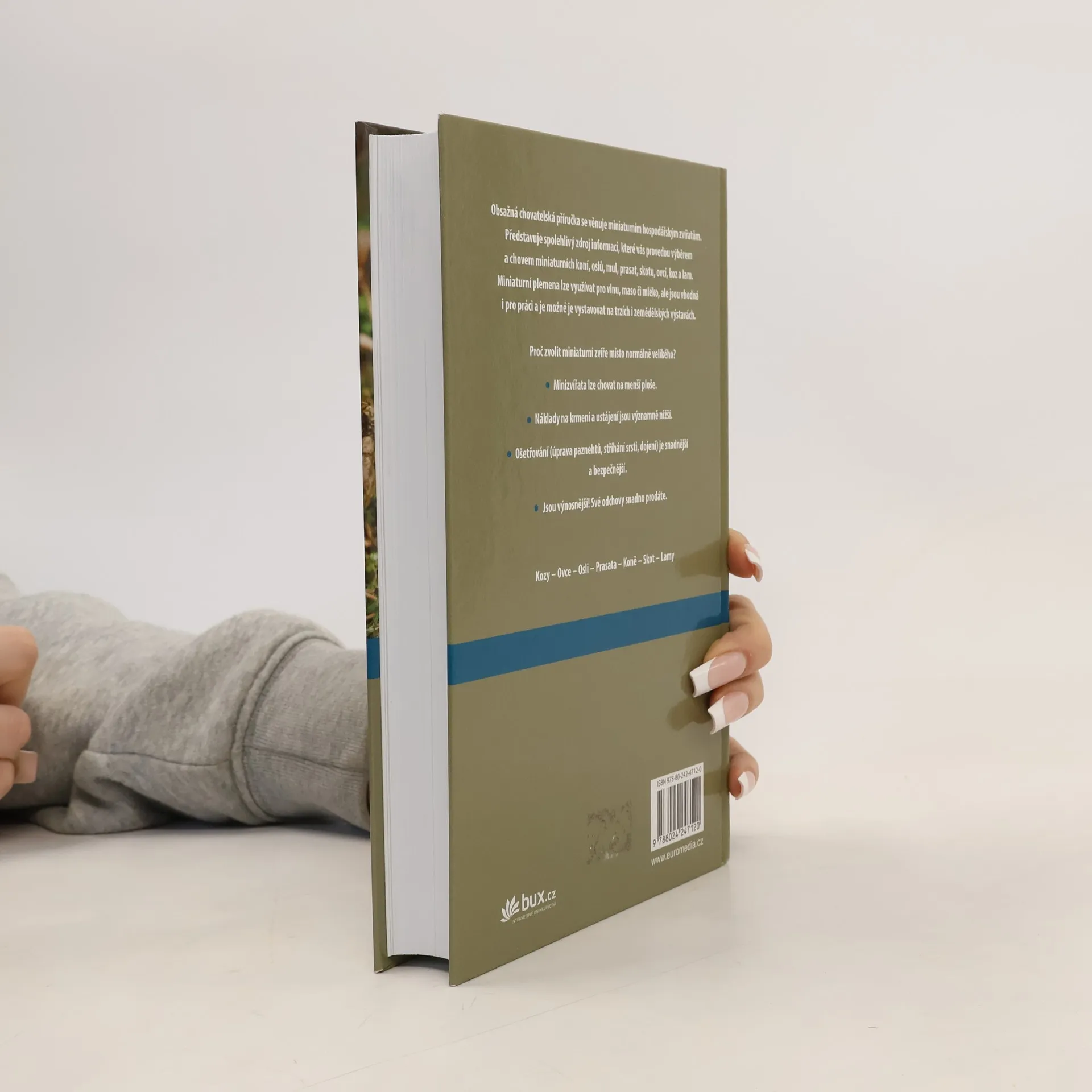 Praktická černobílá publikace nabízí podrobné informace o všem, co je potřeba při chovu vědět: výběr zvířete, ochrana před predátory, ustájení, krmení, označování, zdraví, mléko, jednotlivé druhy (skot, koně, kozy, lamy, prasata, ovce). Chov miniaturních zvířat je celosvětový trend.