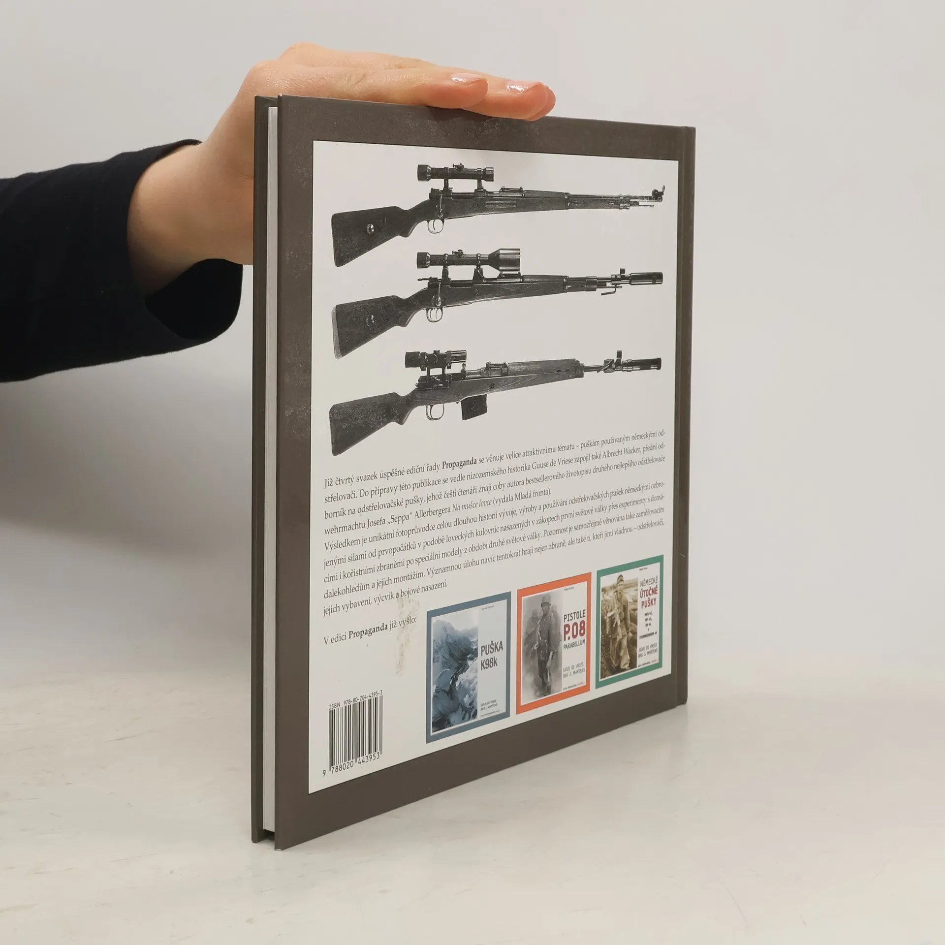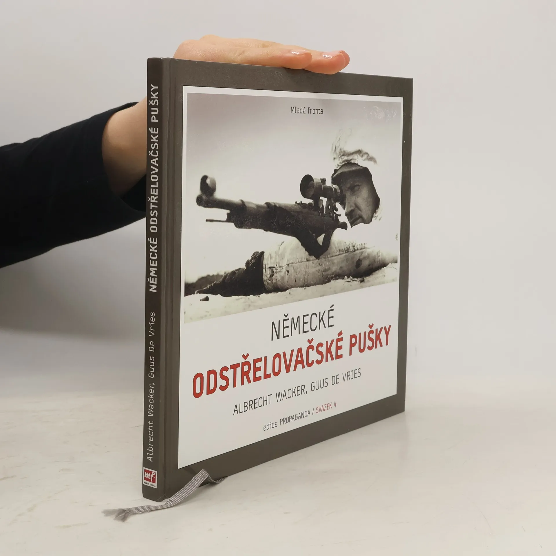 Již čtvrtý svazek úspěšné ediční řady Propaganda se věnuje velice atraktivnímu tématu – puškám používaným německými odstřelovači. Do přípravy této publikace se vedle nizozemského historika Guuse de Vriese zapojil také Albrecht Wacker, přední odborník na odstřelovačské pušky, jehož čeští čtenáři znají coby autora bestsellerového životopisu druhého nejlepšího odstřelovače wehrmachtu Josefa „Seppa“ Allerbergera Na mušce lovce (Mladá fronta 2013). Výsledkem je unikátní fotoprůvodce celou dlouhou historií vývoje, výroby a používání odstřelovačských pušek německými ozbrojenými silami od prvopočátků v podobě loveckých kulovnic nasazených v zákopech první světové války přes experimenty s domácími i kořistními zbraněmi po speciální modely z období druhé světové války. Pozornost je samozřejmě věnována rovněž zaměřovacím dalekohledům a jejich montážím. Významnou úlohu navíc tentokrát hrají nejen zbraně, ale také ti, kteří jimi vládnou – odstřelovači, jejich vybavení, výcvik a bojové nasazení.