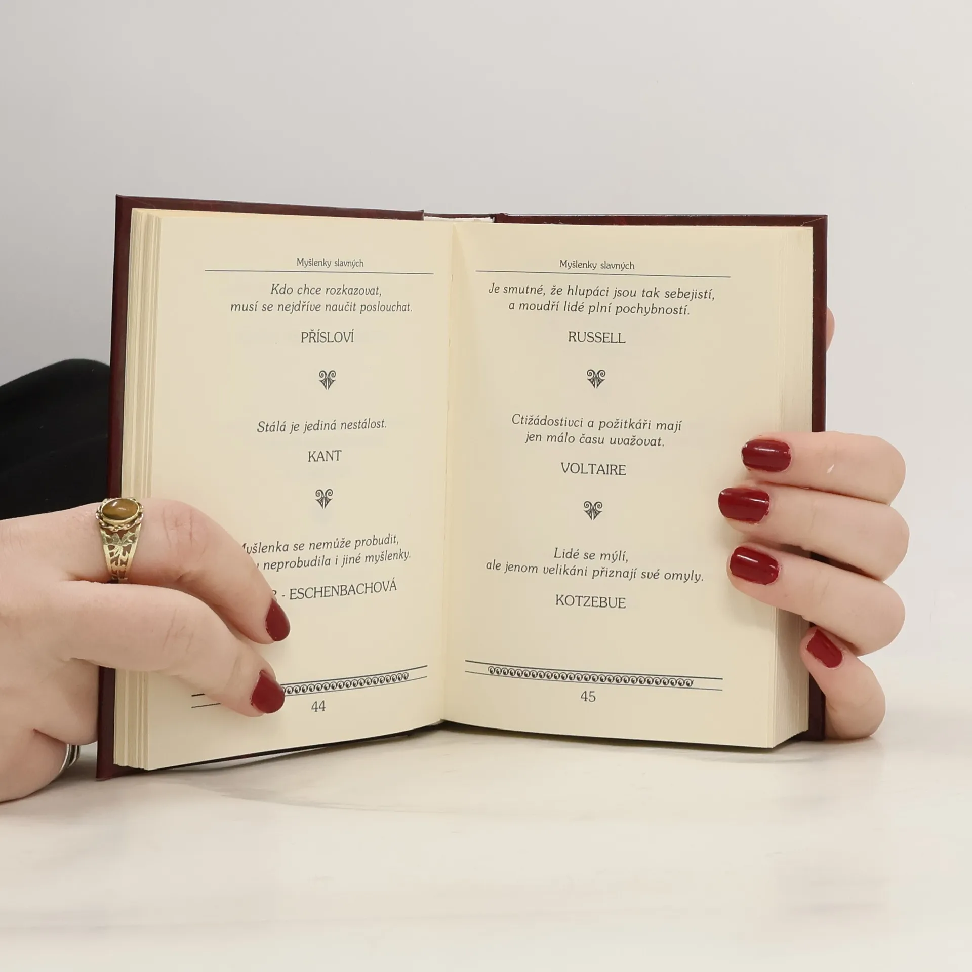 Citáty známých osobností a několik cizích přísloví. Mezi jinými Balzaca, Marie von Ebner-Eschenbachové, Goetha, Heineho, Lichtenberga, La Rochefoucalda, Nietzscheho, Schillera, Oscara Wilda a celé řady dalších slavných osobností. Vybrala a sestavila Žofia Lenčová.