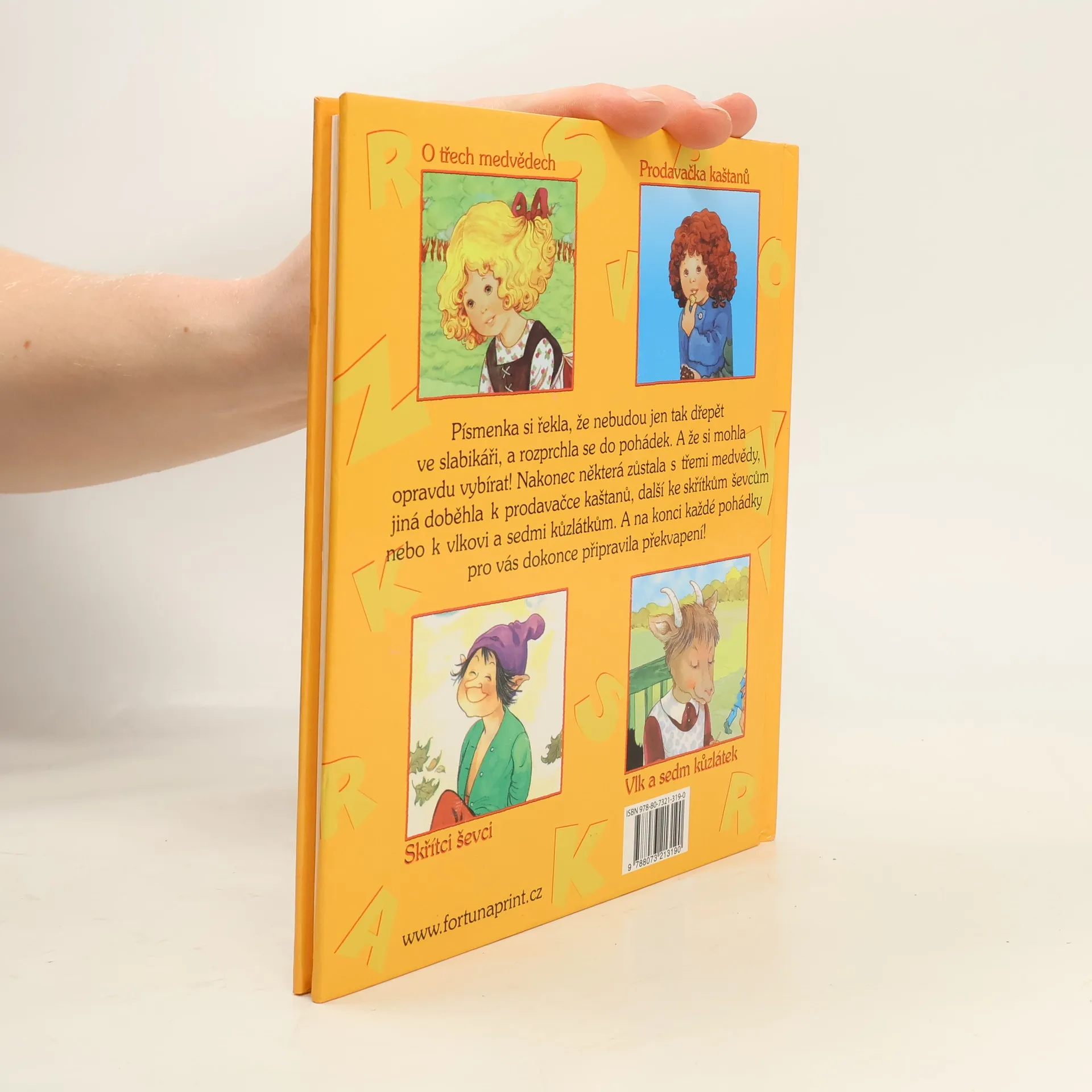 Písmenka si řekla, že nebudou jen tak dřepět ve slabikáři, a rozprchla se do pohádek. Některá zůstala s třemi medvědy, jiná doběhla k prodavačce kaštanů, další ke skřítkům ševcům nebo k vlkovi a sedmi kůzlátkům. A na konci každé pohádky pro vás dokonce připravila překvapení!