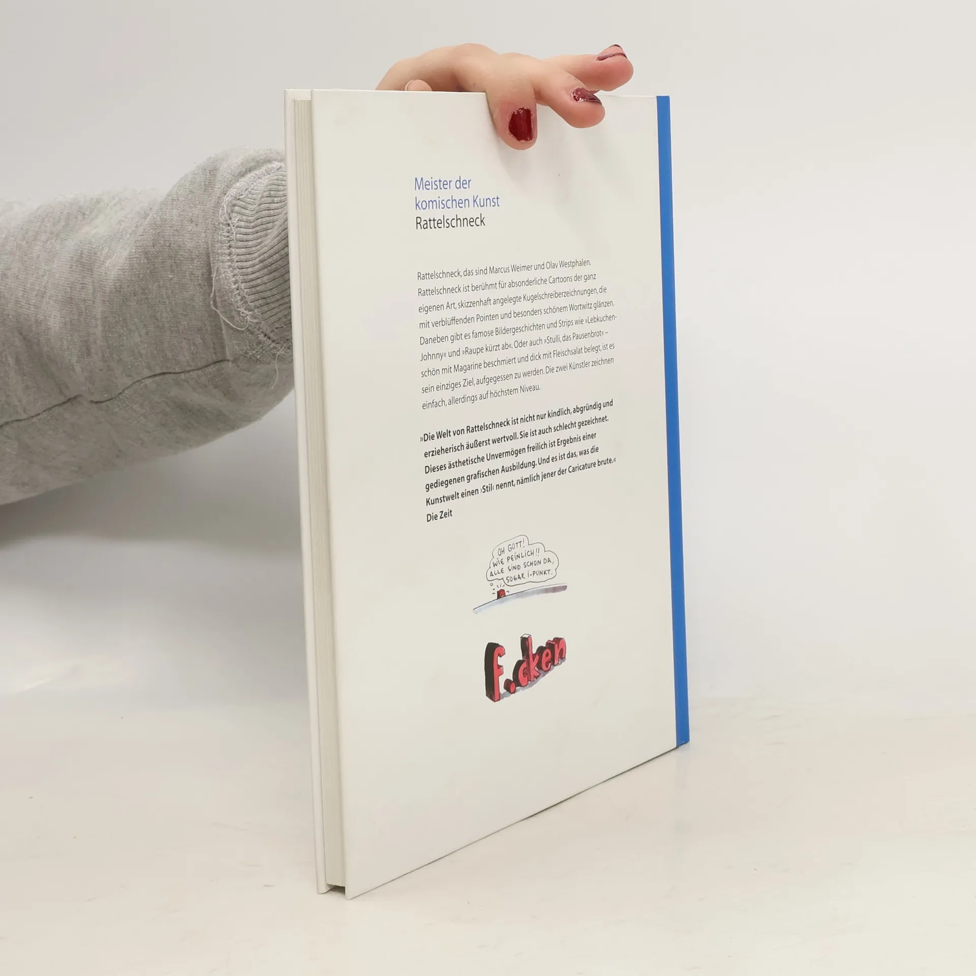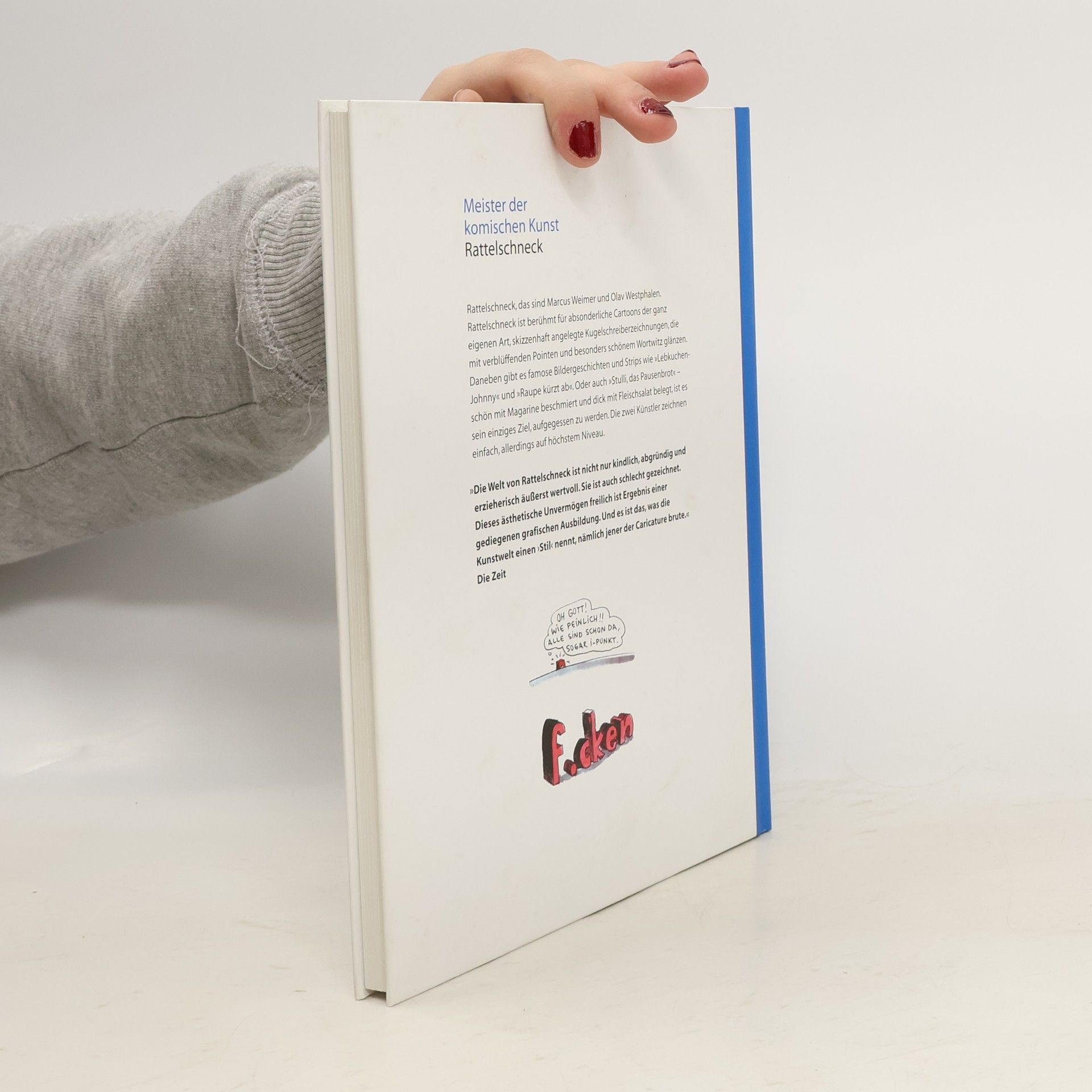 Rattelschneck ist ein meisterhaftes Zeichnerdoppel, das den absurden Humor in Deutschland nachhaltig geprägt hat. Rattelschneck, das sind Marcus Weimer und Olav Westphalen. Rattelschneck ist berühmt für absonderliche Cartoons der ganz eigenen Art, skizzenhaft angelegte Kugelschreiberzeichnungen, die mit verblüffenden Pointen und besonders schönem Wortwitz glänzen. Daneben gibt es famose Bildergeschichten und Strips wie „Bubu & Baba“, „Mein und Meine“ und „Raupe kürzt ab“. Oder auch „Stulli, das Pausenbrot“ – schön mit Magarine beschmiert und dick mit Fleischsalat belegt, ist es sein einziges Ziel, aufgegessen zu werden. Die zwei Künstler zeichnen einfach, allerdings auf höchstem Niveau.