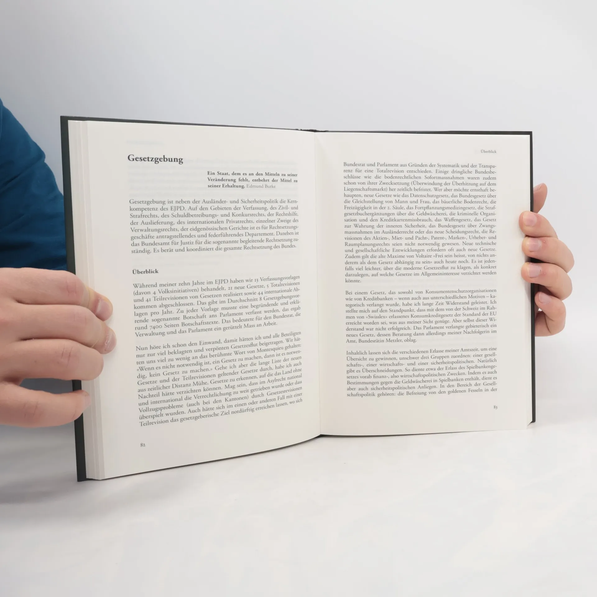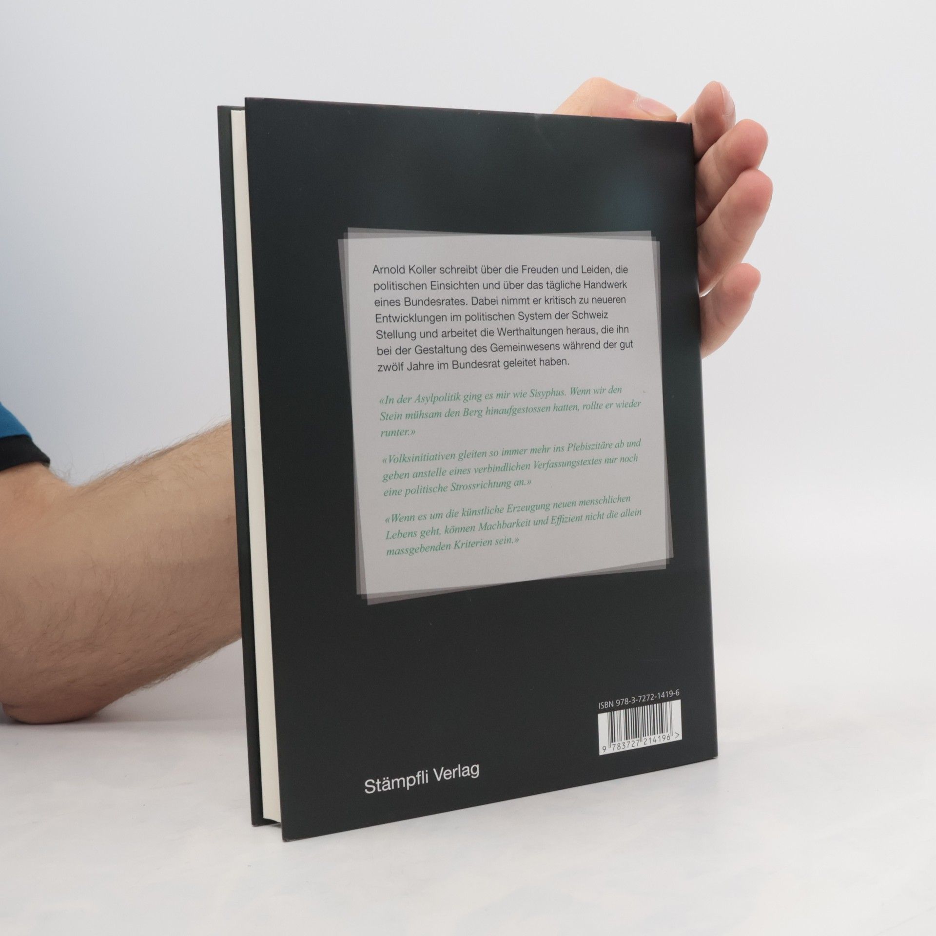 Mit diesem Werkstattbericht wird den Lesenden der Beruf des Bundesrates am konkreten Fall nähergebracht. Arnold Koller schreibt über die Freuden und Leiden, die politischen Einsichten und Schlussfolgerungen, aber auch über das tägliche Handwerk. Besondere Kapitel sind der Arbeit im Bundesrat und den Aufgaben als Bundespräsident gewidmet. Berichtet wird auch über den Einfluss, den die Medien auf das Verhalten eines Bundesrates haben. Natürlich gibt es im Leben eines Bundesrates Höhepunkte. Den grössten Teil seiner Zeit verbringt er jedoch wie jedermann in seiner Werkstatt, das heisst bei Besprechungen mit Politikern und Mitarbeitern, Bundesrats- und parlamentarischen Kommissionssitzungen, Gesetzesberatungen im National- und Ständerat, Abstimmungskämpfen und immer mehr auch bei Treffen mit Regierungskollegen im Ausland. Der Autor arbeitet, neben dem Handwerklichen, auch die politischen Werthaltungen heraus, die ihn bei der Gestaltung des Gemeinwesens während seiner gut zwölf Jahre im Bundesrat geleitet haben.