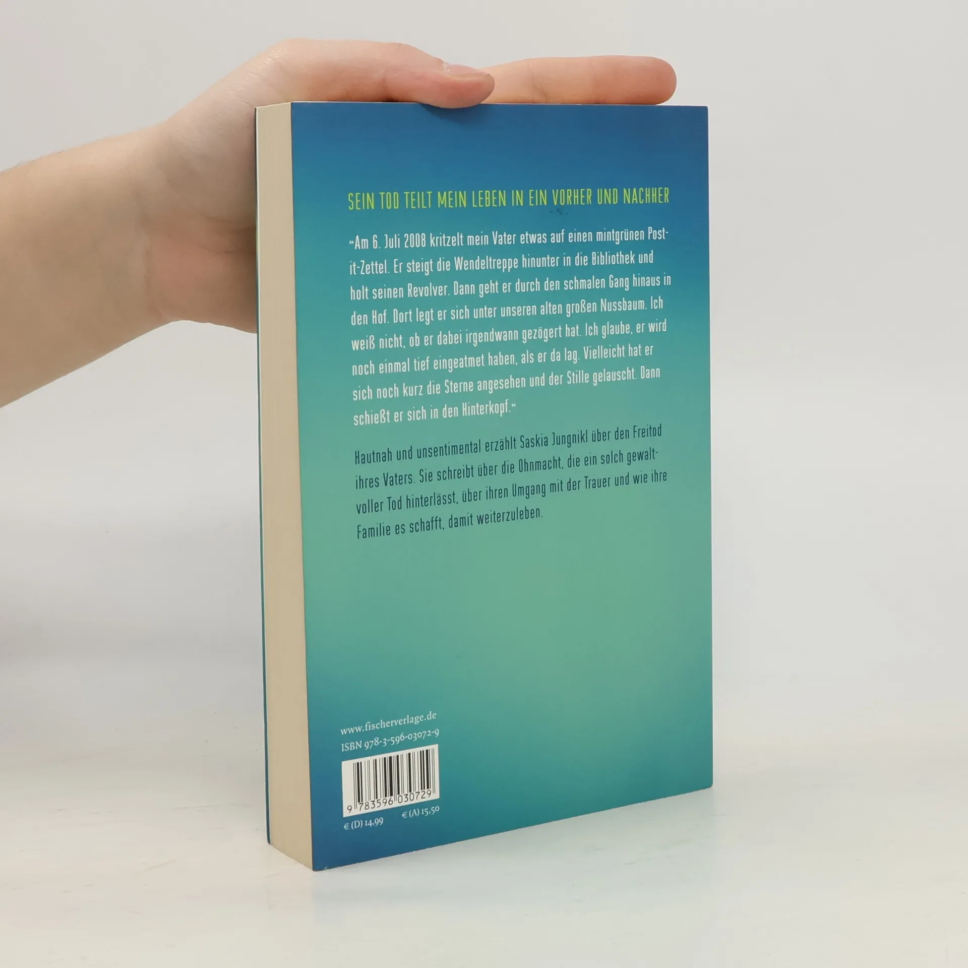 SEIN TOD TEILT MEIN LEBEN IN EIN VORHER UND NACHHER »Am 6. Juli 2008 kritzelt mein Vater etwas auf einen mintgrünen Post-it-Zettel. Er steigt die Wendeltreppe hinunter in die Bibliothek und holt seinen Revolver. Dann geht er durch den schmalen Gang hinaus aus unserem Haus in den Hof. Dort legt er sich unter unseren alten großen Nussbaum. Ich weiß nicht, ob er dabei irgendwann gezögert hat. Ich glaube, er wird noch einmal tief eingeatmet haben, als er da lag. Vielleicht hat er sich noch kurz die Sterne angesehen und der Stille gelauscht. Dann schießt er sich in den Hinterkopf. Sein Tod teilt mein Leben in ein Vorher und Nachher.« Hautnah und unsentimental erzählt Saskia Jungnikl über den Freitod ihres Vaters. Sie schreibt über die Ohnmacht, die ein solch gewaltvoller Tod hinterlässt und wie ihre Familie es schafft, damit umzugehen, über Schuldgefühle, Wut und das Entsetzen, das nachlässt, aber nie verschwindet.
