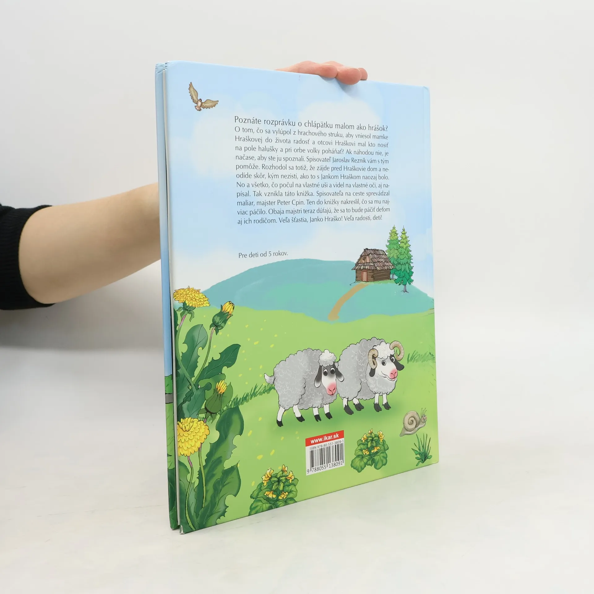 Poznáte rozprávku o chlápätku malom ako hrášok? O tom, čo sa z hrachového struku vylúpol, aby vniesol mamke Hraškovej do života radosť a otcovi Hraškovi mal kto nosiť na pole halušky a pri orbe volky poháňať? Ak náhodou nie, je načase, aby ste ju spoznali. Spisovateľ Jaroslav Rezník vám s tým pomôže. Rozhodol sa totiž, že zájde pred Hraškovie dom a neodíde skôr, kým nezistí, ako to s Jankom Hraškom naozaj bolo. No a všetko, čo počul na vlastné uši a videl na vlastné oči, aj napísal. Tak vznikla táto knižka. Spisovateľa na ceste sprevádzal aj maliar, majster Peter Cpin. Ten do knižky nakreslil, čo sa mu najviac páčilo. Obaja majstri teraz dúfajú, že sa to bude páčiť deťom aj ich rodičom. Veľa šťastia, Janko Hraško! Veľa radosti, deti!