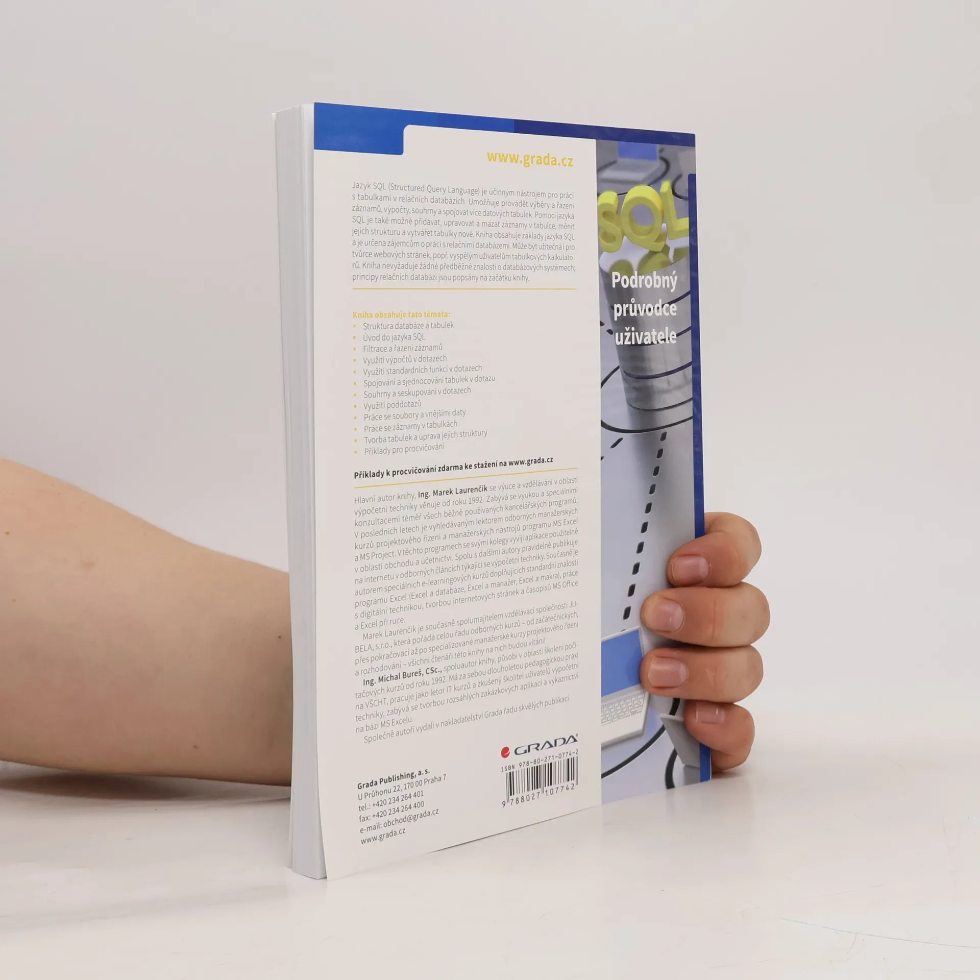 Jazyk SQL (Structured Query Language) je účinným nástrojem pro práci s tabulkami v relačních databázích. Umožňuje provádět výběry a řazení záznamů, výpočty, souhrny a spojovat více datových tabulek. Pomocí jazyka SQL je také možné přidávat, upravovat a mazat záznamy v tabulce, měnit jejich strukturu a vytvářet tabulky nové. Z jazyka SQL jsou v knize zařazeny běžně používané základní partie, společné pro všechny databázové systémy. Kniha zahrnuje odchylky běžných systémů od standardu SQL tak, aby byla univerzálně použitelná (není orientována na určitý databázový systém). Běžné systémy zahrnují Access, MS SQL Server, MySQL, Postgre, příp. Visual Fox Pro). Pozornost je věnována i objektově relačnímu mapování. Jednotlivé kapitoly jsou vždy doplněny sérií příkladů pro samostatná řešení. Soubory, potřebné pro vypracování příkladů v databázích SQL Serveru a MySQL, naleznete na webových stránkách nakladatelství Grada. Po zvládnutí knihy bude každý schopen získávat z databáze jednoduché přehledy, třídit je podle různých kritérií a omezovat podle jednoduchých podmínek. Publikace může být užitečná i pro tvůrce webových stránek, popř. vyspělým uživatelům tabulkových kalkulátorů. Nevyžaduje žádné předběžné znalosti o databázových systémech; principy relačních databází jsou popsány na začátku knihy.