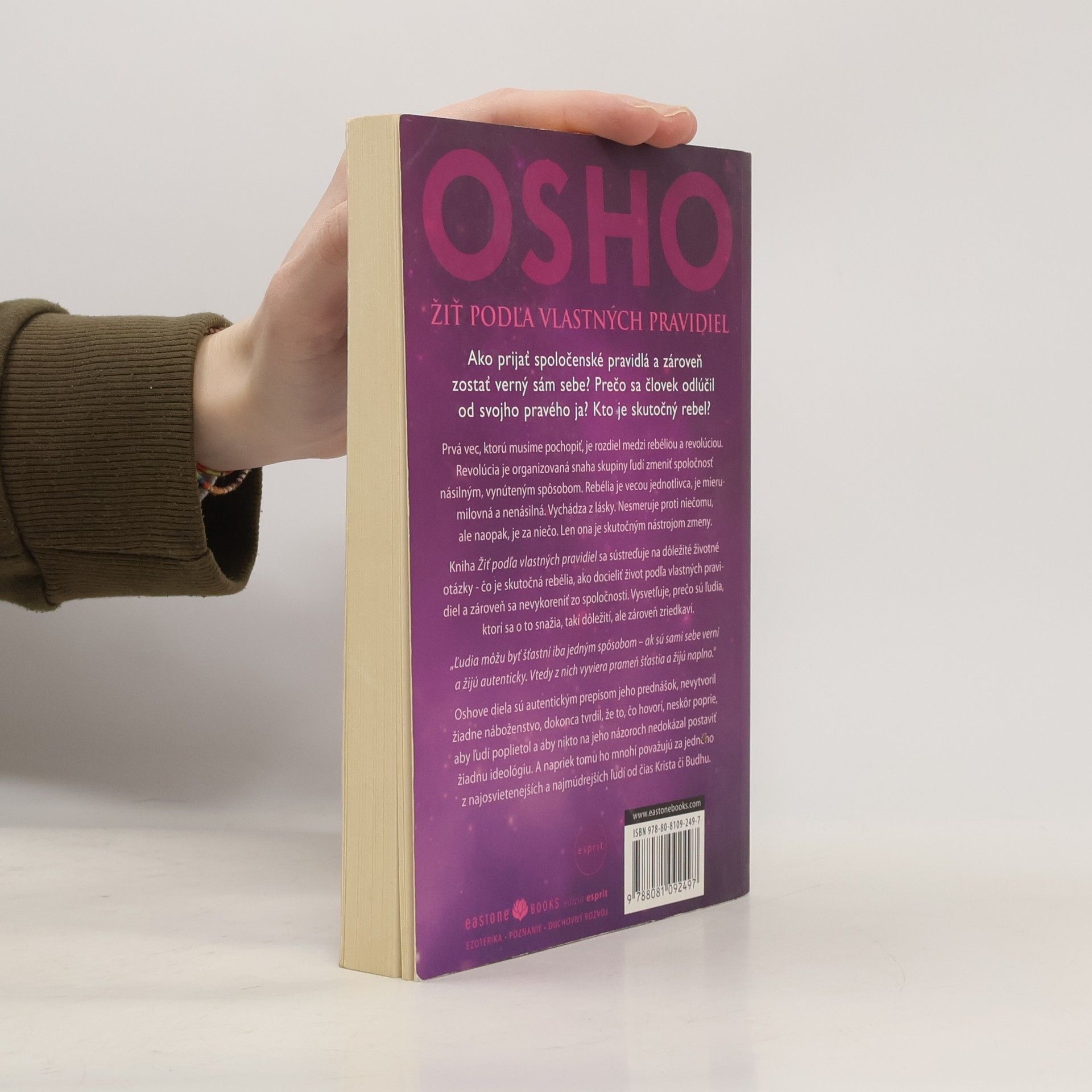 Ako prijať spoločenské pravidlá a zároveň zostať verný sám sebe? Prečo sa človek tak často vzdiali od svojho skutočného ja a čo s tým? Ako sa vyhnúť ľuďom so zlou energiou? Kniha Žiť podľa vlastných pravidiel sa sústreďuje na najdôležitejšie životné otázky každého človeka. Prostredníctvom praktických príkladov, vtipných porovnaní a diskusie s poslucháčmi nás Osho citlivo zoznamuje s odpoveďami, ktoré sa týkajú kvality nášho vnútorného sveta a našej existencie. Zrozumiteľne a jednoznačne ukazuje, aké sú prednosti života podľa vlastných pravidiel, ako ho docieliť a zároveň sa nevykoreniť zo spoločnosti a prečo sú ľudia, ktorí sa o to snažia, takí dôležití, ale zároveň zriedkaví.
