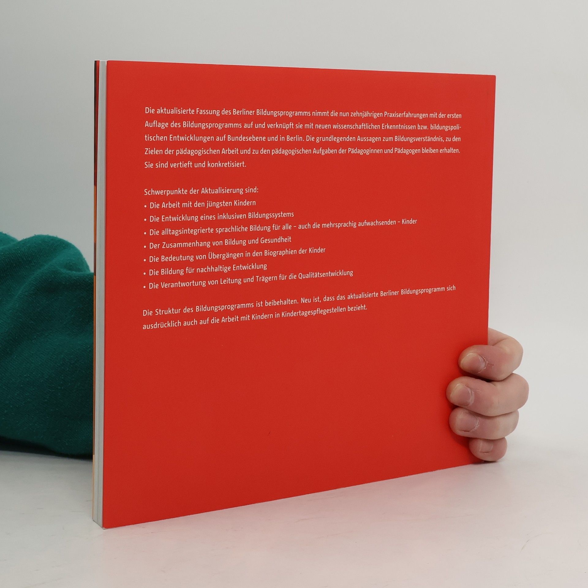 Alle Kinder haben ein Recht auf Bildung – von Anfang an. Das aktualisierte Berliner Bildungsprogramm legt dar, welche grundlegenden Kenntnisse und Fähigkeiten Kinder in ihren ersten sechs Lebensjahren benötigen, um ihren Lebensweg erfolgreich zu gestalten. Es bietet einen wissenschaftlich fundierten Orientierungsrahmen für alle Berliner Kindertageseinrichtungen und hat auch bundesweit sowie international große Zustimmung gefunden. Die neue Fassung integriert zehn Jahre Praxiserfahrungen mit der ersten Auflage und verknüpft diese mit aktuellen wissenschaftlichen Erkenntnissen sowie bildungspolitischen Entwicklungen. Die grundlegenden Aussagen zum Bildungsverständnis, den Zielen der pädagogischen Arbeit und den Aufgaben der Pädagoginnen und Pädagogen bleiben bestehen, werden jedoch vertieft und konkretisiert. Schwerpunkte der Aktualisierung sind die Arbeit mit den jüngsten Kindern, die Entwicklung eines inklusiven Bildungssystems, alltagsintegrierte sprachliche Bildung für mehrsprachige Kinder, der Zusammenhang von Bildung und Gesundheit, die Bedeutung von Übergängen in den Biografien der Kinder, Bildung für nachhaltige Entwicklung sowie die Verantwortung von Leitung und Trägern für Qualitätsentwicklung. Neu ist, dass das Programm sich auch auf die Arbeit mit Kindern in Kindertagespflegestellen bezieht.