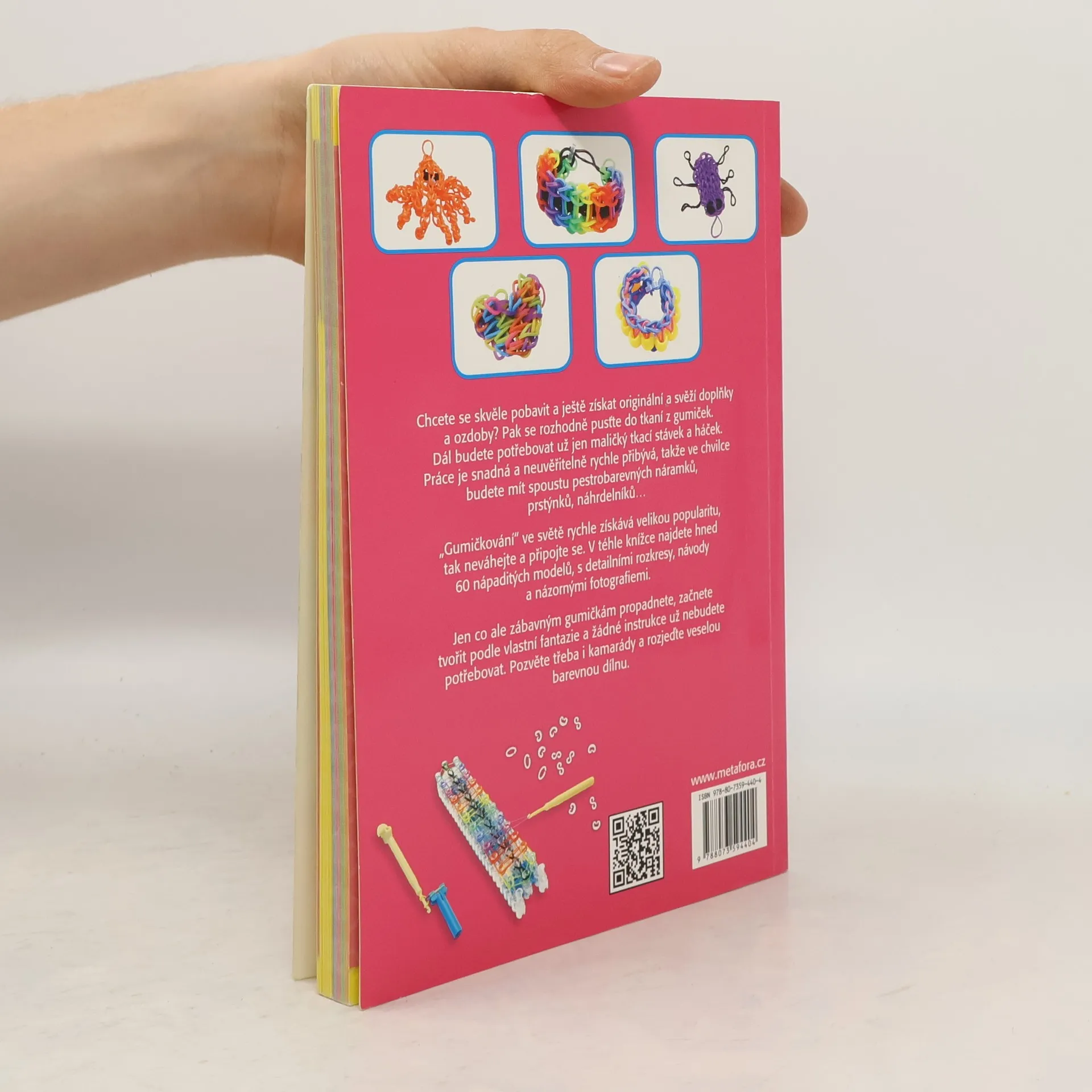 Chcete se skvěle pobavit a ještě získat originální a svěží doplňky a ozdoby? Pak se rozhodně pusťte do tkaní z gumiček. Dál budete potřebovat už jen maličký tkací stávek a háček. Práce je snadná a neuvěřitelně rychle přibývá, takže ve chvilce budete mít spoustu pestrobarevných náramků, prstýnků, náhrdelníků... „Gumičkování" rychle získává velikou popularitu, tak neváhejte a připojte se. V téhle knížce najdete hned šedesát úžasných modelů, s detailními rozkresy, návody a názornými fotografiemi. Jen co ale zábavným gumičkám propadnete, začnete tvořit podle vlastní fantazie a žádné instrukce už nebudete potřebovat. Pozvěte třeba i kamarády a rozjeďte veselou barevnou dílnu.