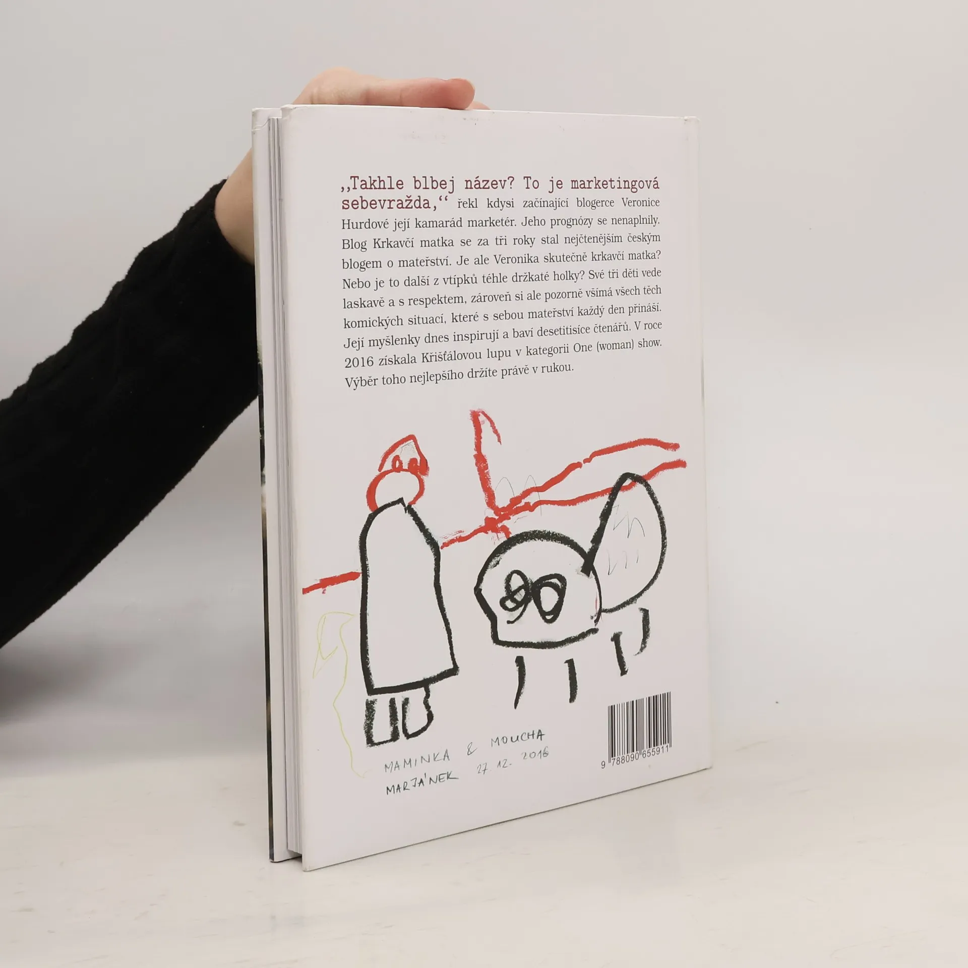 „Takhle blbej název? To je marketingová sebevražda,“ řekl kdysi začínající blogerce Veronice Hurdové její kamarád marketér. Jeho prognózy se nenaplnily. Blog Krkavčí matka se za tři roky stal nejčtenějším českým blogem o mateřství. Je ale Veronika skutečně krkavčí matka? Nebo je to další z vtípků téhle držkaté holky? Své tři děti vede laskavě a s respektem, zároveň si ale pozorně všímá všech těch komických situací, které s sebou mateřství každý den přináší. Její myšlenky dnes inspirují a baví desetitisíce čtenářů. V roce 2016 získala Křišťálovou lupu v kategorii One (woman) show. Výběr toho nejlepšího držíte právě v rukou. Aniž by v tom byl záměr, jdu celý život mimo hlavní proud. Na rozdíl od svého patnáctiletého já se za to dnes už nestydím. Mám víc dětí než rukou. Gréta, Marján a Janek se jmenují. Ty děti, ne ruce. Když děti spí, píšu blog a FB Krkavčí matka. Miluju les, nohy v teple a svého muže Honzu, který na mě čeká v nebi. Děsí mě pobytové zájezdy, snahy o škatulkování a nesmířliví lidé se zavřenými hlavami.