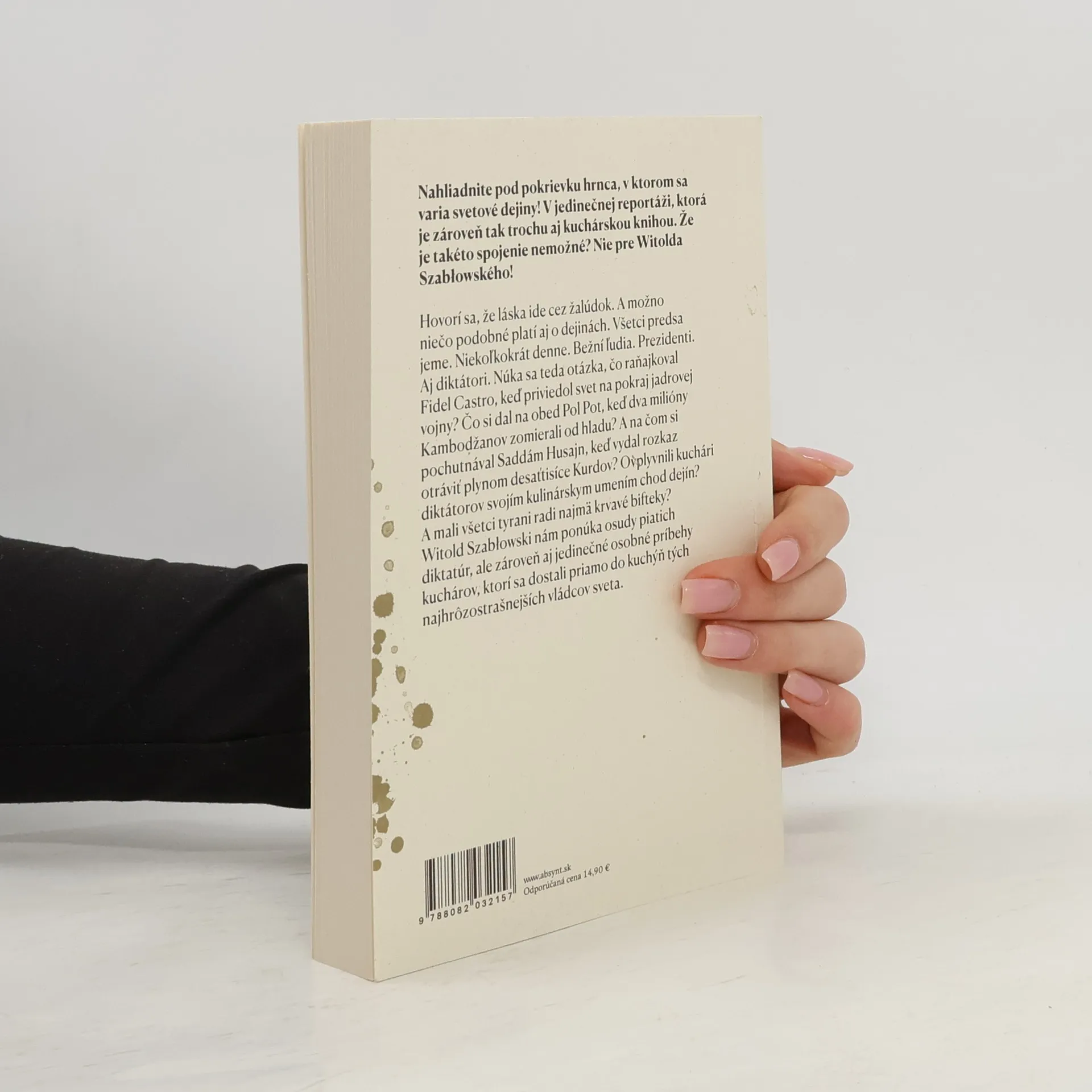 Hovorí sa, že láska ide cez žalúdok. A možno niečo podobné platí aj o dejinách. Všetci predsa jeme. Niekoľkokrát denne. Bežní ľudia. Prezidenti. Aj diktátori. Núka sa teda otázka, čo raňajkoval Fidel Castro, keď priviedol svet na pokraj jadrovej vojny? Čo si dal na obed Pol Pot, keď dva milióny Kambodžanov zomierali od hladu? A na čom si pochutnával Saddám Husajn, keď vydal rozkaz otráviť plynom desaťtisíce Kurdov? Ovplyvnili kuchári diktátorov svojim kuchárskym umením chod dejín? A mali všetci radi najmä krvavé bifteky? Ani v okamihoch, keď sa rozhoduje o osude sveta, o vojne či o mieri, nesmú byť žalúdky prázdne. Uvedomil si to aj poľský reportér Witold Szabłowski, ktorý vyhľadal kuchárov najväčších diktátorov 20. storočia, aby sa prostredníctvom ich príbehov pozrel na moderné dejiny z celkom nového uhla. Irak Saddáma Husajna, Kuba Fidela Castra, Albánsko Envera Hodžu, Uganda Idiho Amina či Pol Potova Kambodža. Čo meno, to iná diktatúra, čo krajina, to iná zaujímavá kuchyňa. Witold Szabłowski nám ponúka osudy piatich diktatúr, ale zároveň aj jedinečné osobné príbehy kuchárov, ktorí sa dostali celkom blízko tým najhrôzostrašnejším vládcom sveta – priamo do ich kuchýň.