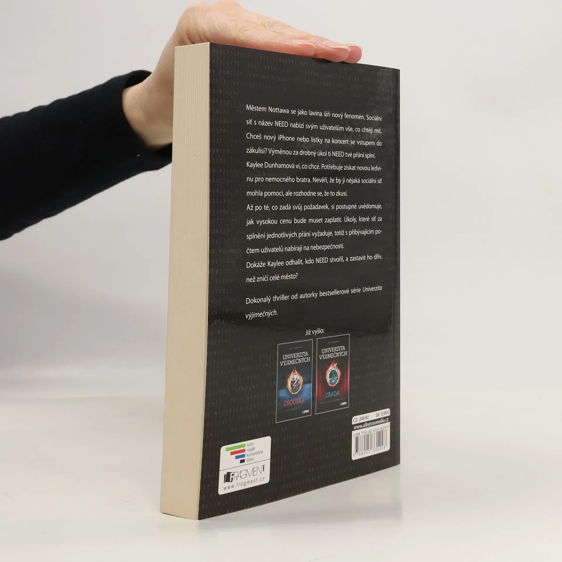 Městem Nottawa se jako lavina šíří nový fenomén. Sociální síť s názvem NEED nabízí svým uživatelům vše, co chtějí mít. Chceš nový iPhone nebo lístky na koncert se vstupem do zákulisí? Výměnou za drobný úkol ti NEED tvé přání splní. Kaylee Dunhamová ví, co chce. Potřebuje získat novou ledvinu pro nemocného bratra. Nevěří, že by jí nějaká sociální síť mohla pomoci, ale rozhodne se, že to zkusí. Až po té, co zadá svůj požadavek, si uvědomuje, jak vysokou cenu bude muset zaplatit. Úkoly, které síť za splnění jednotlivých přání vyžaduje, totiž s přibývajícím počtem uživatelů nabírají na nebezpečnosti. Dokáže Kaylee odhalit, kdo NEED stvořil, a zastavit ho dřív, než zničí celé město? Dokonalý thriller od autorky bestsellerové série Univerzita Výjimečných.