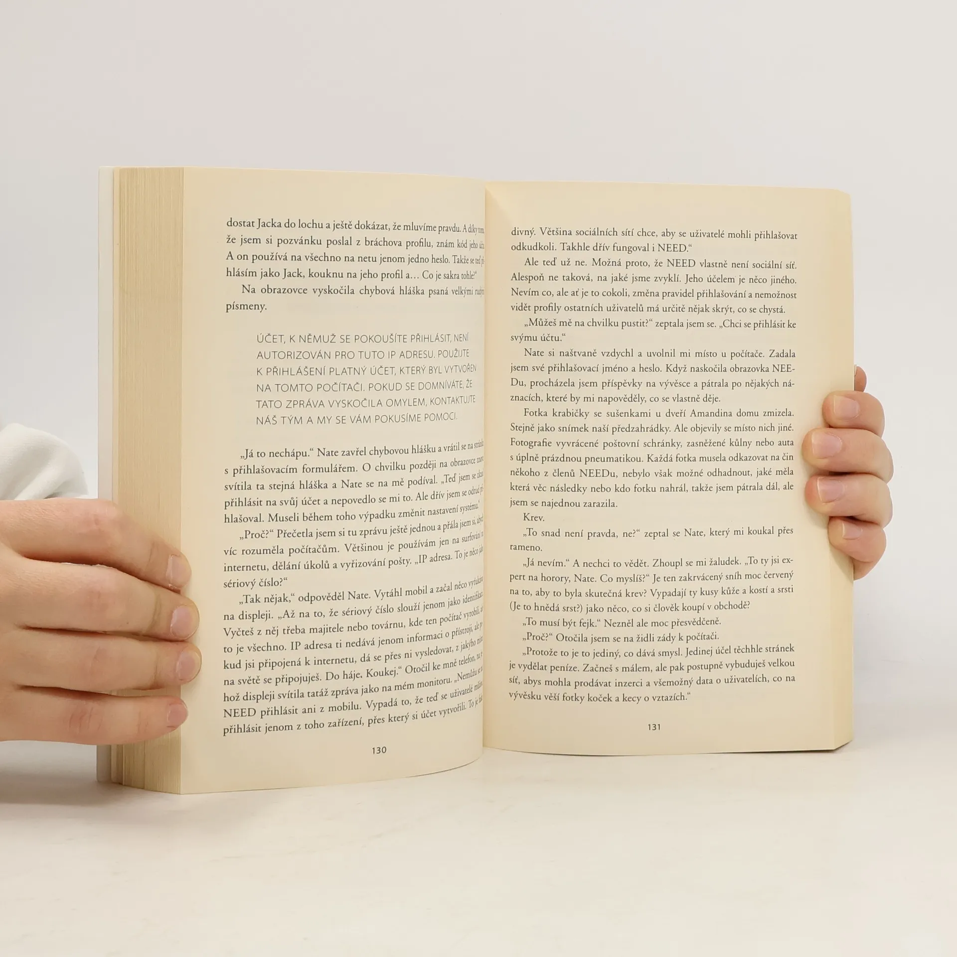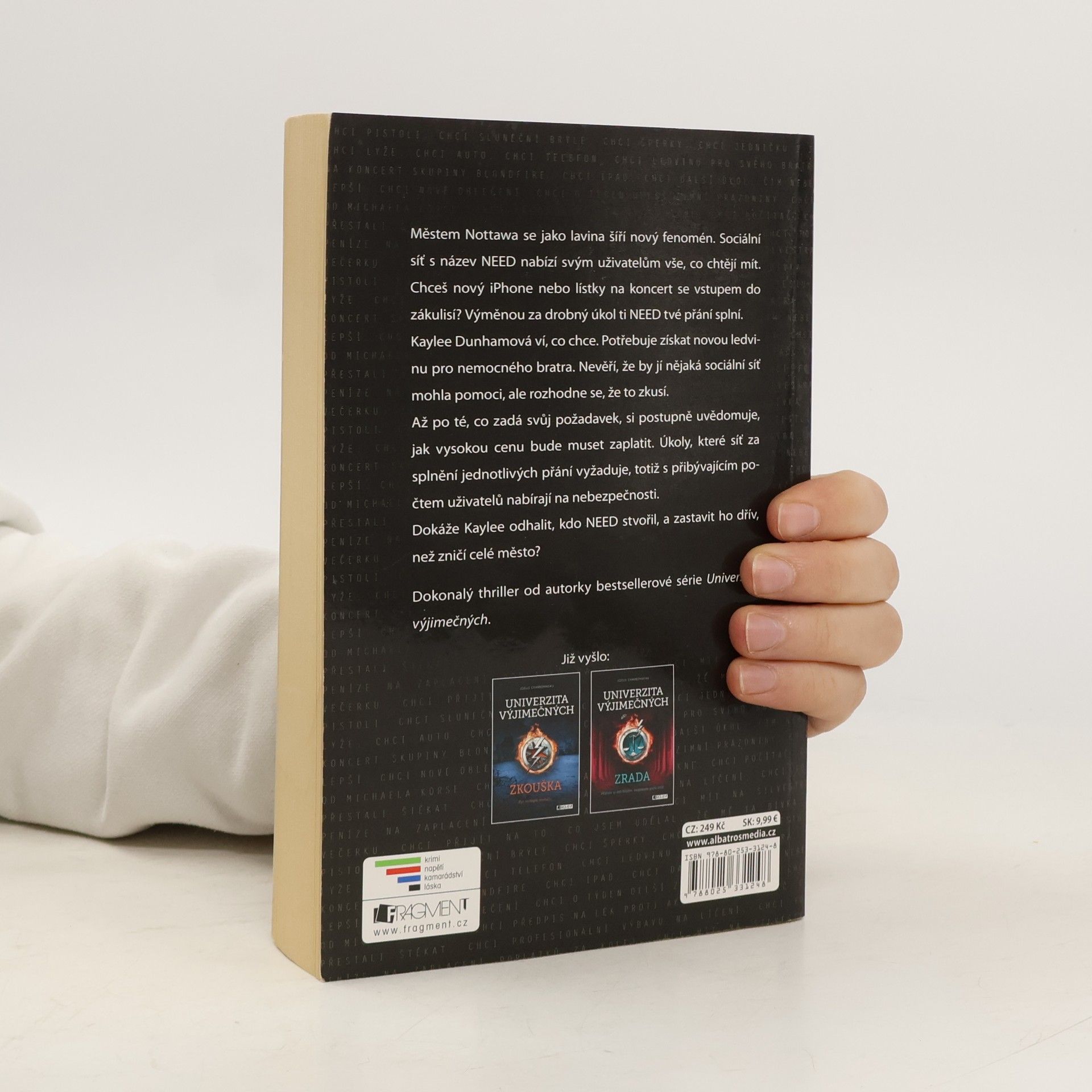 Městem Nottawa se jako lavina šíří nový fenomén. Sociální síť s názvem NEED nabízí svým uživatelům vše, co chtějí mít. Chceš nový iPhone nebo lístky na koncert se vstupem do zákulisí? Výměnou za drobný úkol ti NEED tvé přání splní. Kaylee Dunhamová ví, co chce. Potřebuje získat novou ledvinu pro nemocného bratra. Nevěří, že by jí nějaká sociální síť mohla pomoci, ale rozhodne se, že to zkusí. Až po té, co zadá svůj požadavek, si uvědomuje, jak vysokou cenu bude muset zaplatit. Úkoly, které síť za splnění jednotlivých přání vyžaduje, totiž s přibývajícím počtem uživatelů nabírají na nebezpečnosti. Dokáže Kaylee odhalit, kdo NEED stvořil, a zastavit ho dřív, než zničí celé město? Dokonalý thriller od autorky bestsellerové série Univerzita Výjimečných.