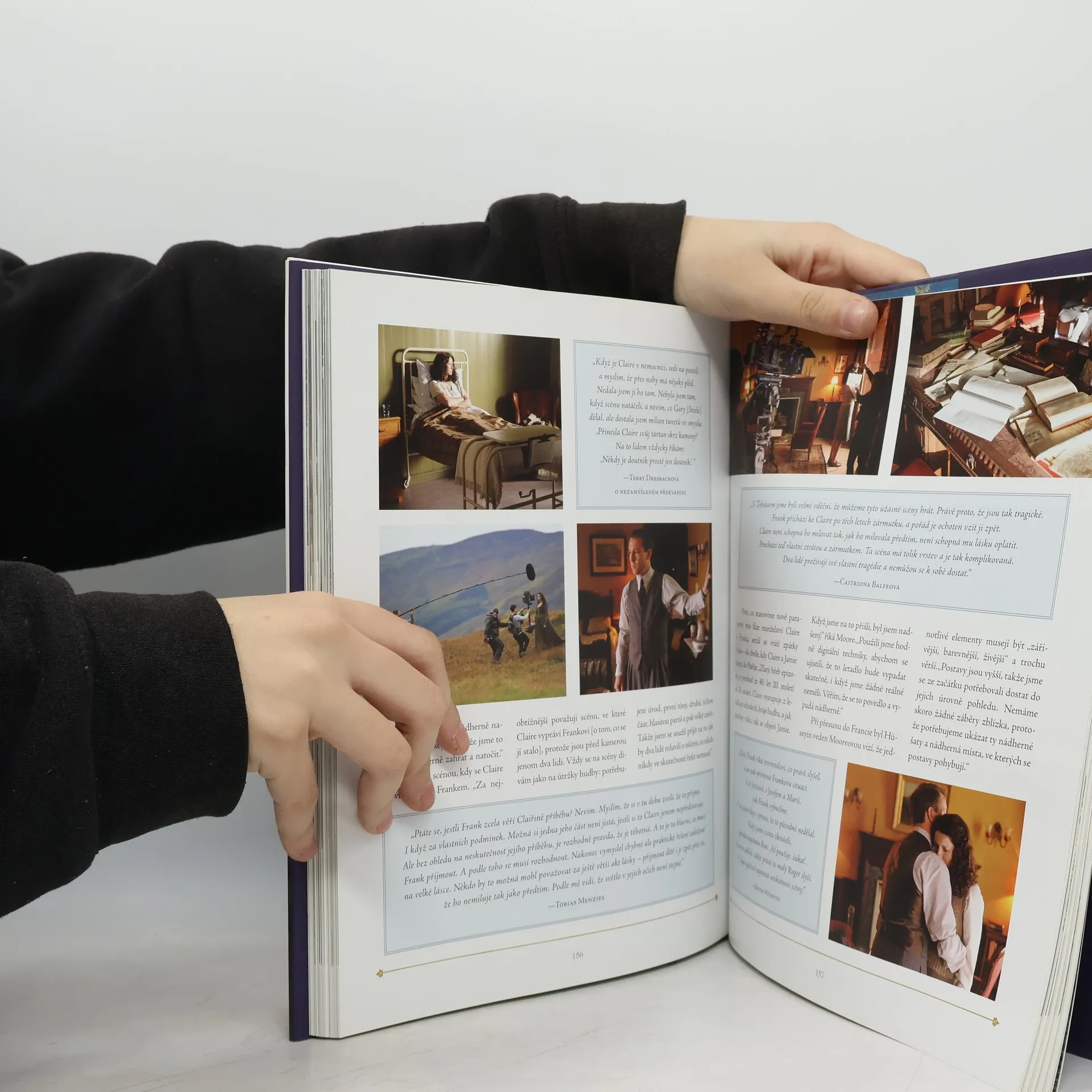 Kniha vás zavede jak do zákulisí, tak přímo do děje. Herci, scénáristé, producenti, hudebníci, kostýmní výtvarníci, technici a mnozí další se s vámi podělí a své zážitky a výzvy, kterým čelili, než se tato vzrušující sága objevila na obrazovce. V exkluzivních rozhovorech, včetně Caitriony Balfe (Claire), Sama Heughana (Jamie) a Tobiase Menziese (Frank Randall / Black Jack Randall), se dočtete o jejich o nelehkém úkolu věrně ztělesnit nejoblíbenější postavy románů. Výkonný producent a Ronald D. Moore se svěří s tím, jak pracoval tým scénáristů, jak objížděli vytipované lokality pro natáčení i kolik energie stála výroba kostýmů a staveb, aby vše bylo dokonalé. Kniha také zkoumá všechny epizody seriálu prostřednictvím exkluzivních rozhovorů s jejími autory a režiséry, kteří se s vámi podělí o fascinující fakta z natáčení díl po dílu.