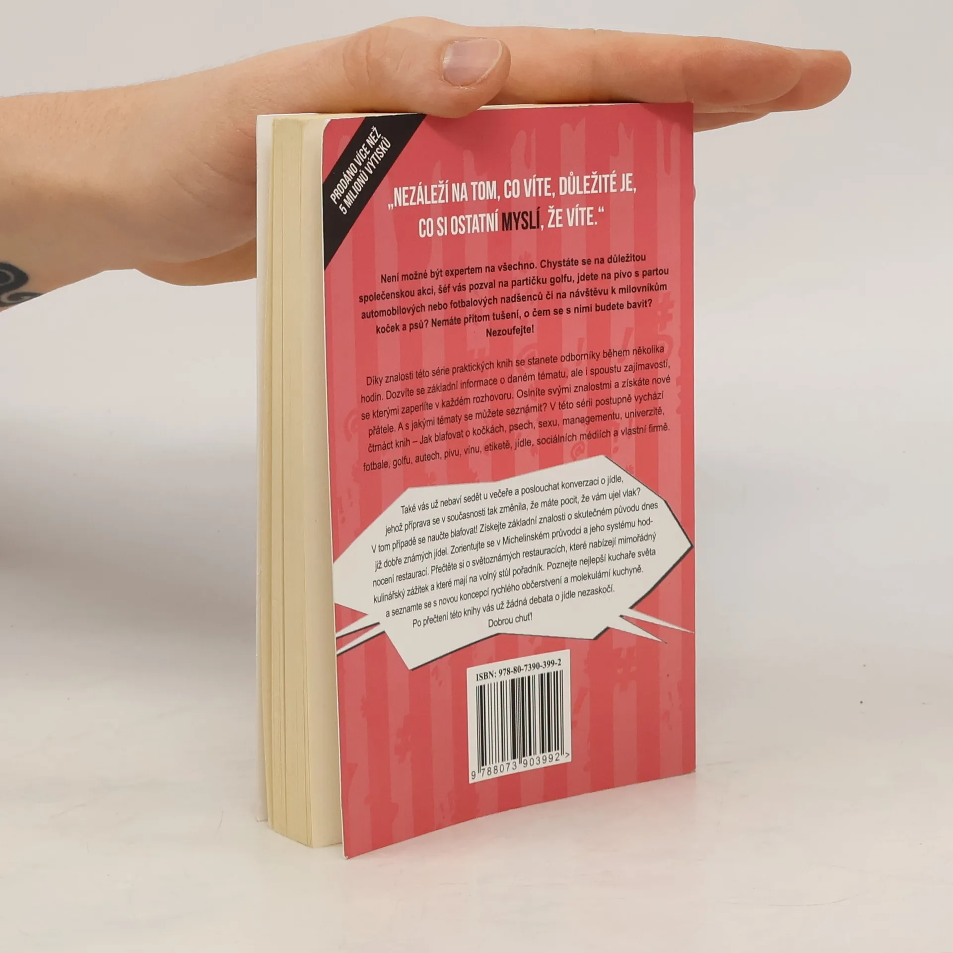 Také vás už nebaví sedět s přáteli u večeře a muset poslouchat jejich konverzaci o jídle, jehož příprava se v současnosti tak změnila, že máte pocit, že vám ujel vlak? V tom případě se naučte blafovat! Získejte základní znalosti o skutečném původu dnes již dobře známých jídel. Zorientujte se v Michelinském průvodci a jeho systému hodnocení restaurací. Přečtěte si o světoznámých restauracích, které nabízejí mimořádný kulinářský zážitek a které mají na volný stůl pořadník. Poznejte nejlepší kuchaře světa a seznamte se s novou koncepcí rychlého občerstvení a molekulární kuchyně. Po přečtení této knihy vás už žádná debata o jídle nezaskočí. Dobrou chuť!