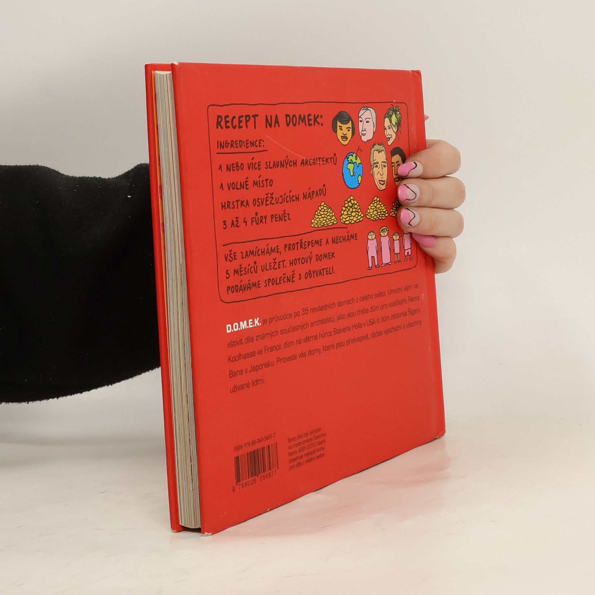 Knížka D.O.M.E.K. důvtipná obrázková mozaika efektních konstrukcí je průvodcem po 35 současných domech z celého světa. Domy v knížce zobrazené slouží různým účelům: v některých můžete bydlet, v některých jen přespat, v některých se pracuje a v některých pije čaj. Dozvíte se, kde ten který dům stojí, proč byl vymyšlený a postavený tak, jak byl, a kteří architekti ho navrhli. Všechno v knížce je kreslené. A kromě domů v ní uvidíte také spoustu zvířat, lidí, ufonů a příšerek a procestujete skoro celý svět. Knížka D.O.M.E.K. je určená dětem, jejich rodičům a prarodičům, kamarádům a kamarádkám.