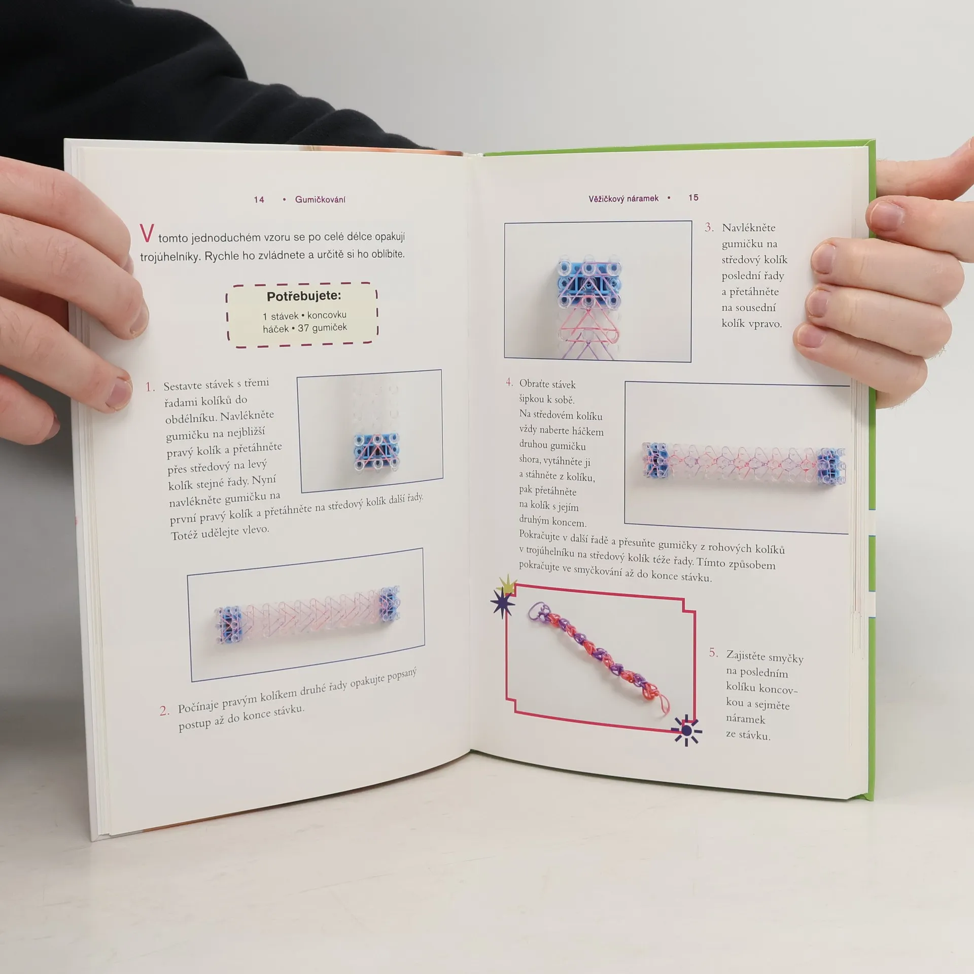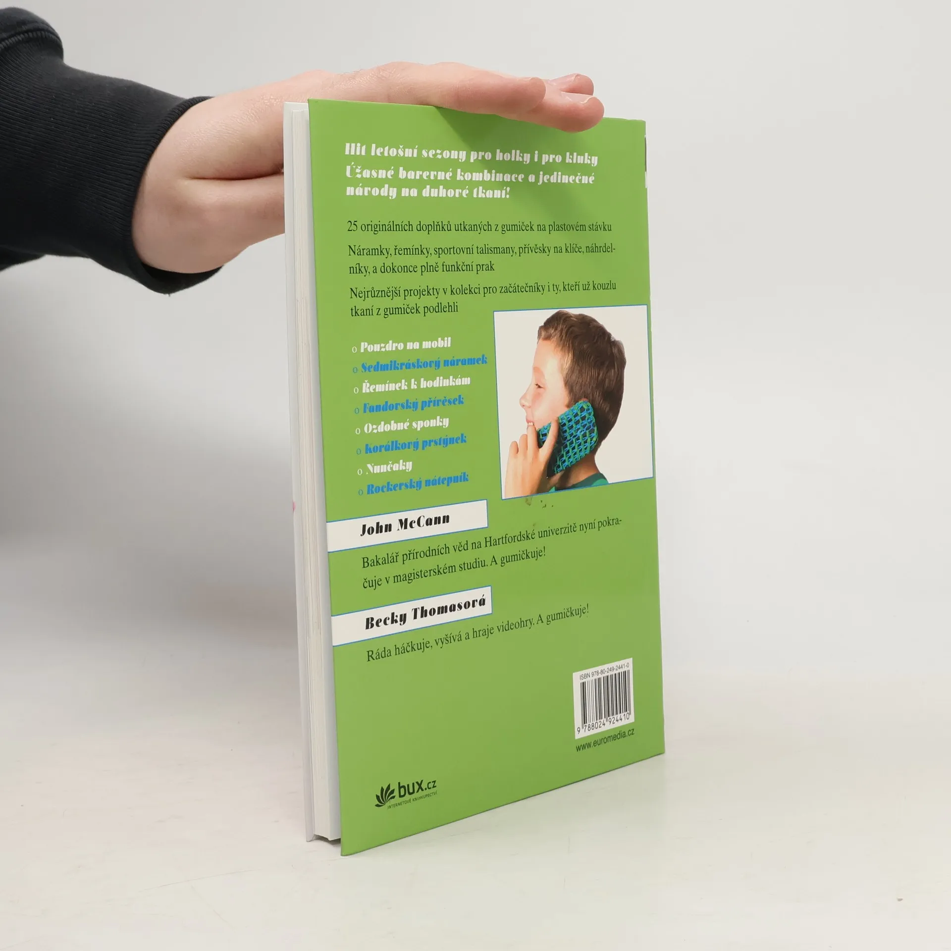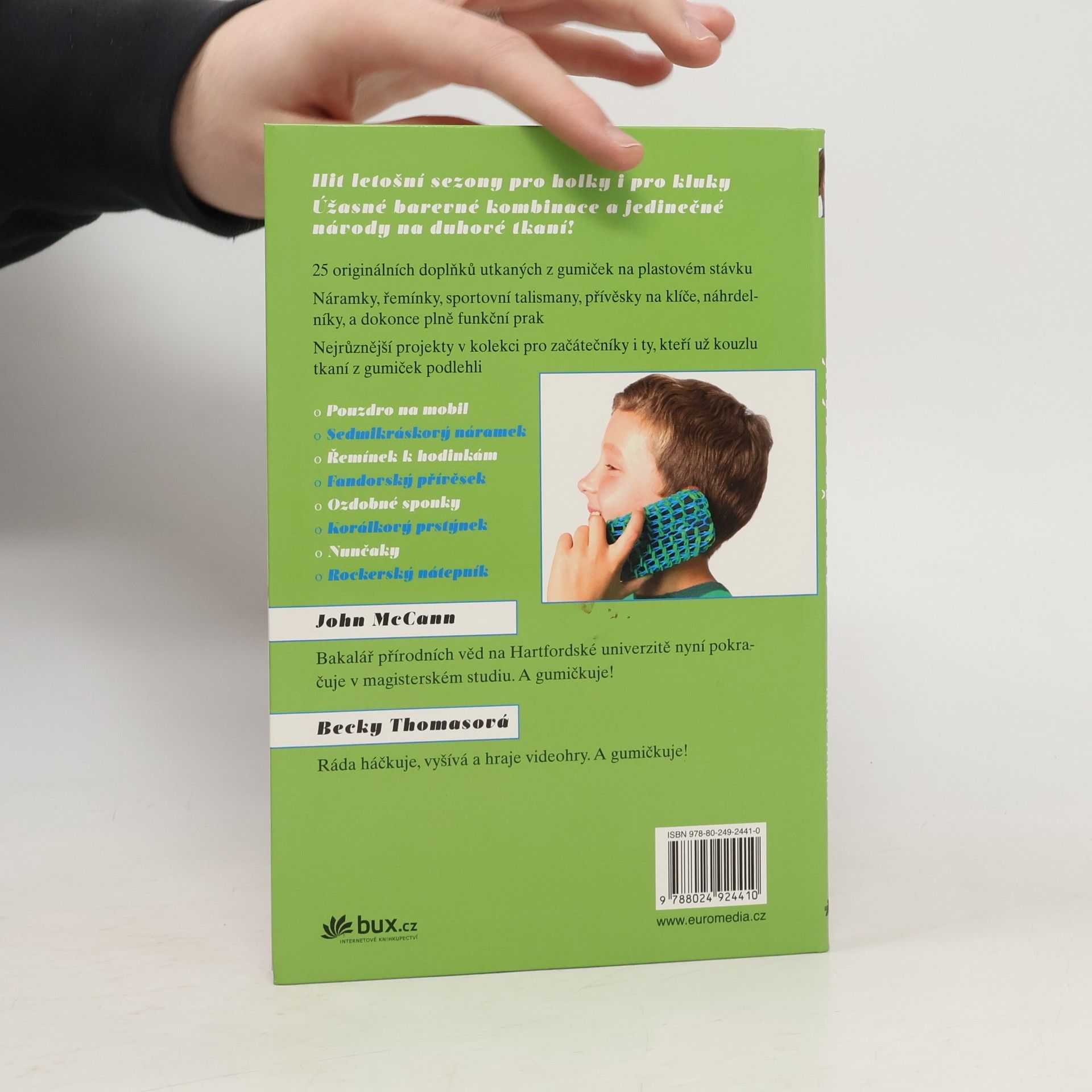 25 senzačních návrhů na duhové tkaní z gumiček Hit letošní sezony pro holky i pro kluky! Budete potřebovat jen stávek, kupu barevných gumiček, háček, trochu zručnosti a hodně fantazie. Pak se můžete pustit do zábavného duhového tkaní! Vyberte si z 25 nápaditých projektů: jsou mezi nimi náramky, sportovní talismany, přívěsky na klíče, náhrdelníky, pouzdro na mobil, rockerský nátepník, a dokonce i plně funkční prak. Podlehněte kouzlu tkaní z gumiček a přidejte nové výrazné doplňky ke svému outfitu!