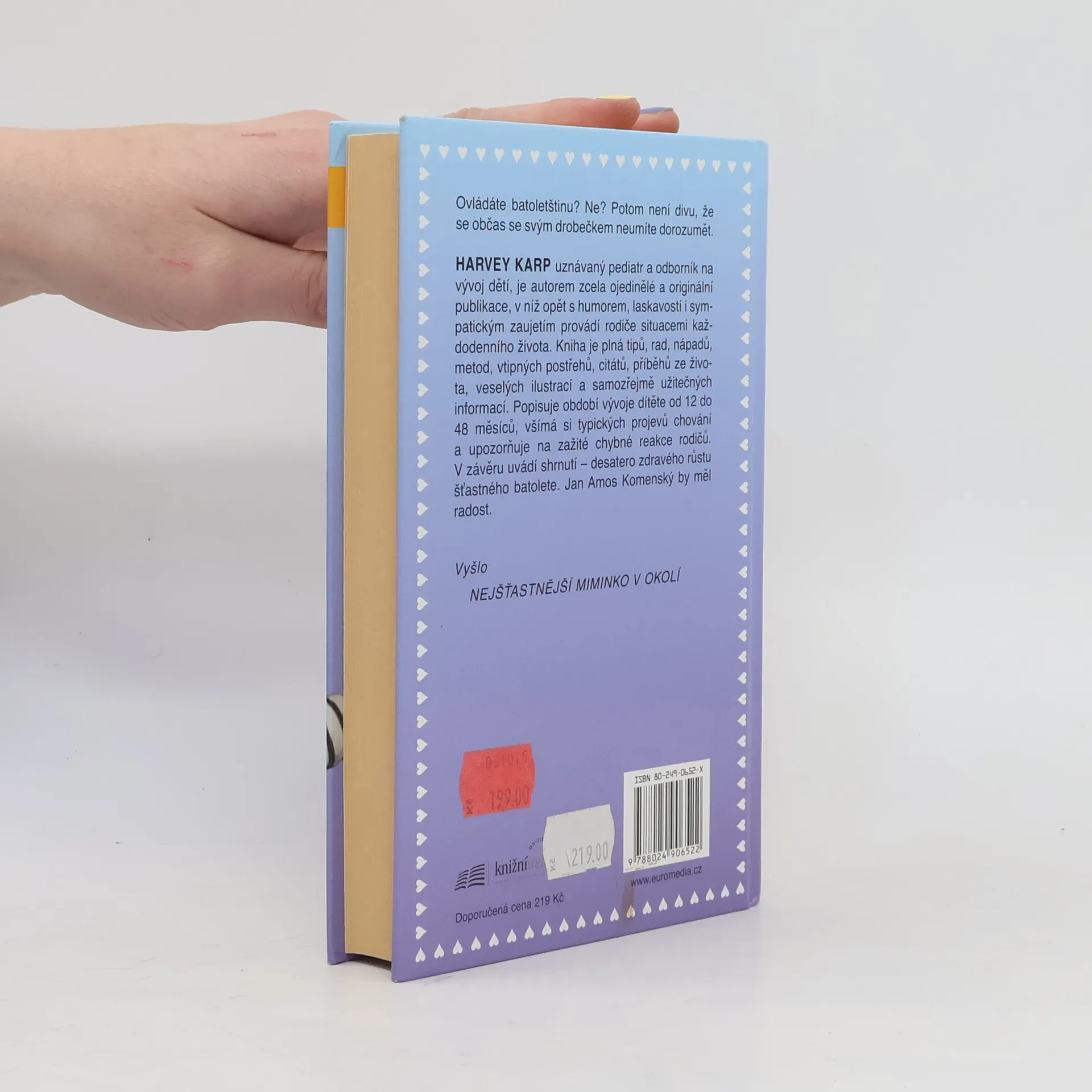 Harvey Karp, uznávaný pediatr a odborník na vývoj dětí, je autorem zcela ojedinělé a originální publikace, v níž opět s humorem, laskavostí i sympatickým zaujetím provádí rodiče situacemi každodenního života. Kniha je plná tipů, rad, nápadů, metod, vtipných postřehů, citátů, příběhů ze života, veselých ilustrací a samozřejmě užitečných informací. Popisuje období vývoje dítěte od 12 do 48 měsíců, všímá si typických projevů chování a upozorňuje na zažité chybné reakce rodičů. V závěru uvádí shrnutí - desatero zdravého růstu šťastného batolete. Jan Amos Komenský by měl radost.