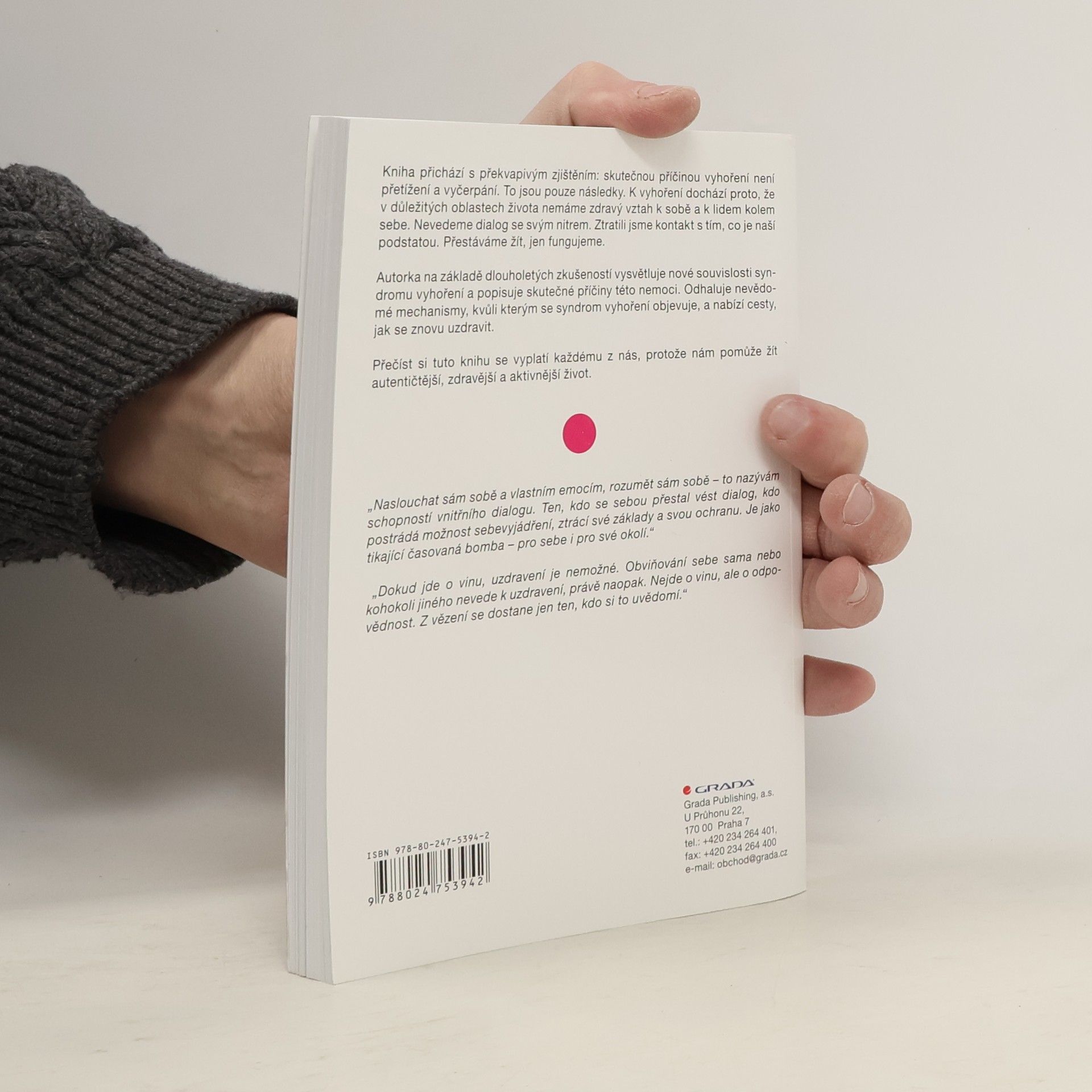 Kniha přichází s překvapivým zjištěním: skutečnou příčinou vyhoření není přetížení a vyčerpání. To jsou pouze následky. K vyhoření dochází proto, že v důležitých oblastech života nemáme zdravý vztah k sobě a k lidem kolem sebe. Nevedeme dialog se svým nitrem. Ztratili jsme kontakt s tím, co je naší podstatou. Přestáváme žít, jen fungujeme. Autorka na základě dlouholetých zkušeností vysvětluje nové souvislosti syndromu vyhoření a popisuje skutečné příčiny této nemoci. Odhaluje nevědomé mechanismy, kvůli kterým se syndrom vyhoření objevuje, a nabízí cesty, jak se znovu uzdravit. Přečíst si tuto knihu se vyplatí každému z nás, protože nám pomůže žít autentičtější, zdravější a aktivnější život.