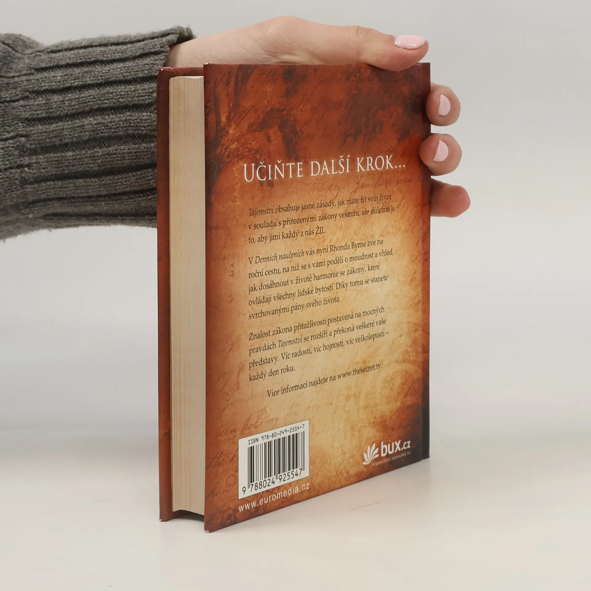 Tajemství obsahuje jasné zásady, jak vést život v souladu s přirozenými zákony vesmíru, ale hlavně jimi musíte skutečně ŽÍT. S Denním naučením vás Rhonda Byrne provede rokem učení a podělí se s vámi o moudrost i vhled, jak dosáhnout harmonie se zákony, které ovládají všechny lidské bytosti. Stanete se pány svého osudu. Mocné pravdy Tajemství tvoří pevné základy, na nichž vybudujete rozšířenou znalost zákona přitažlivosti. Víc radosti, víc hojnosti, víc velkoleposti – každý den po celý rok.