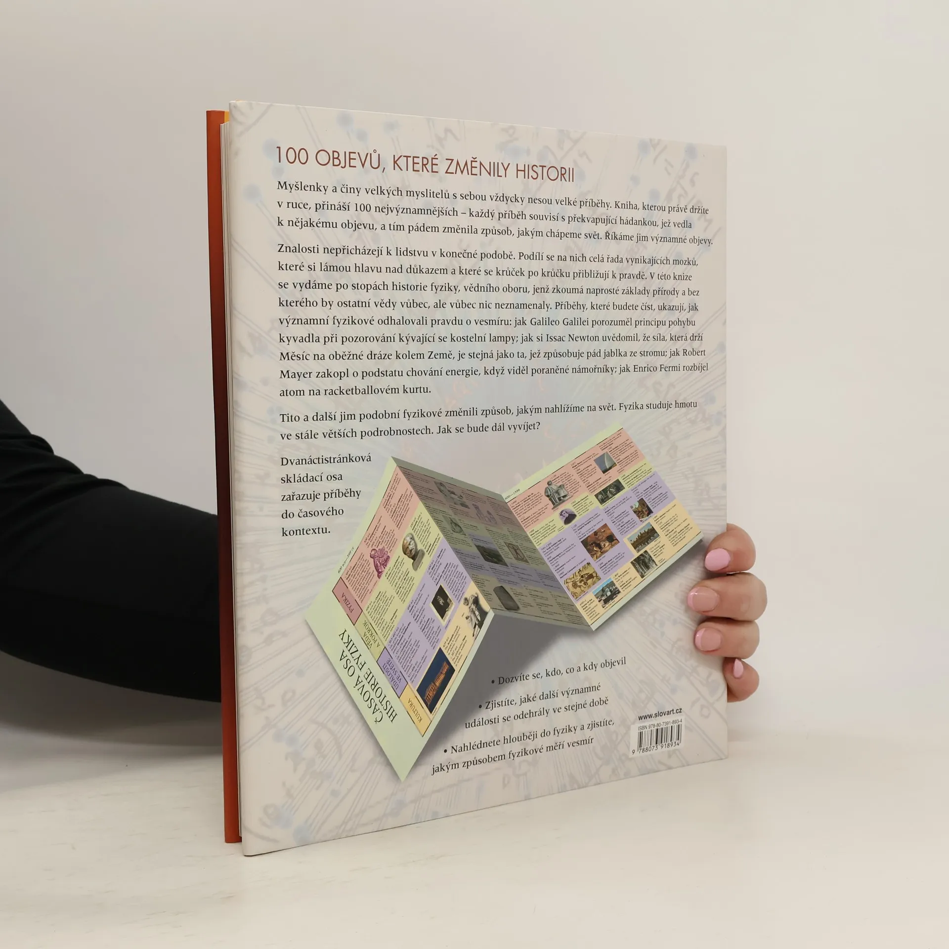 V této knize se vydáme po stopách historie fyziky, vědního oboru, jenž zkoumá naprosté základy přírody a bez kterého by ostatní vědy vůbec, ale vůbec nic neznamenaly. Příběhy, které budete číst, ukazují, jak významní fyzikové odhalovali pravdu o vesmíru: jak Galileo Galilei odhalil principy pohybu kyvadla při pozorování kývající se kostelní lampy; jak si Issac Newton uvědomil, že síla, která drží Měsíc na oběžné dráze kolem Země, je stejná jako ta, jež způsobuje pád jablka ze stromu; jak Julius Mayer zakopl o podstatu chování energie, když zašíval poranění námořníka; jak Richard Feynman vyřešil chování subatomových částic, zatímco pozoroval studenta, jak točí talířem. Tito a další jim podobní fyzikové změnili způsob, jakým nahlížíme na svět. Fyzika studuje hmotu ve stále větších podrobnostech. Jak se bude dál vyvíjet? Kniha obsahuje i rozkládací časovou osu, která zařazuje příběhy do dějinného kontextu.