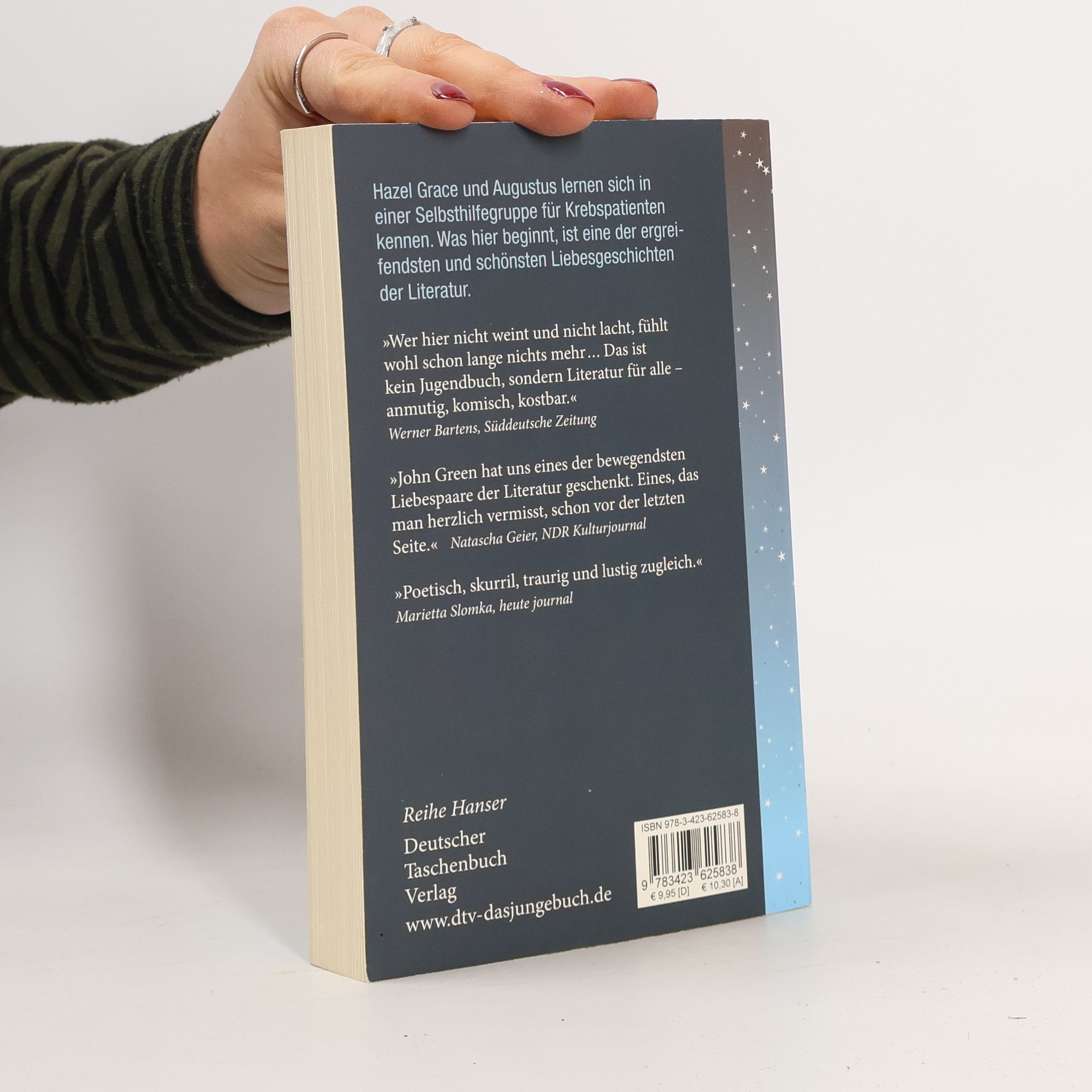 „Krebsbücher sind doof“, sagt die 16-jährige Hazel, die selbst Krebs hat. Sie will auf gar keinen Fall bemitleidet werden und kann mit Selbsthilfegruppen nichts anfangen. Bis sie in einer Gruppe auf den intelligenten, gut aussehenden und umwerfend schlagfertigen Gus trifft. Der geht offensiv mit seiner Krankheit um. Hazel und Gus diskutieren Bücher, hören Musik, sehen Filme und verlieben sich ineinander - trotz ihrer Handicaps und Unerfahrenheit. Gus macht Hazels großen Traum wahr: Gemeinsam fliegen sie nach Amsterdam, um dort Peter Van Houten zu treffen, den Autor von Hazels absolutem Lieblingsbuch. Ein tiefgründiges, emotionales und zugleich freches Jugendbuch über Krankheit, Liebe und Tod. Ausgezeichnet mit dem Deutschen Jugendliteraturpreis 2013 (Preis der Jugendjury).