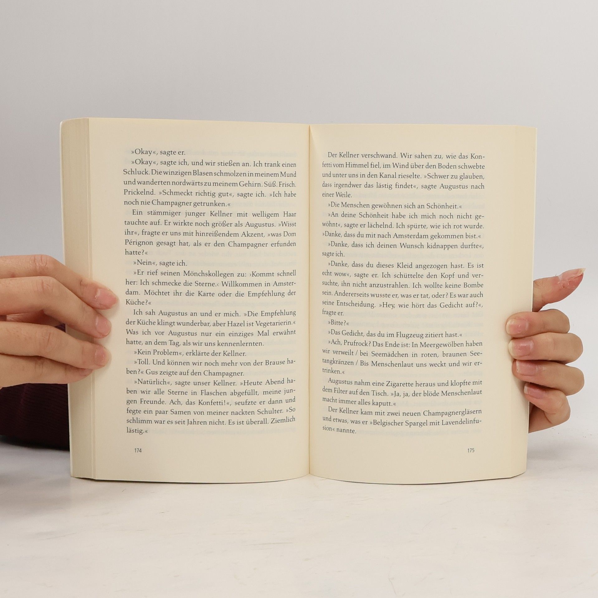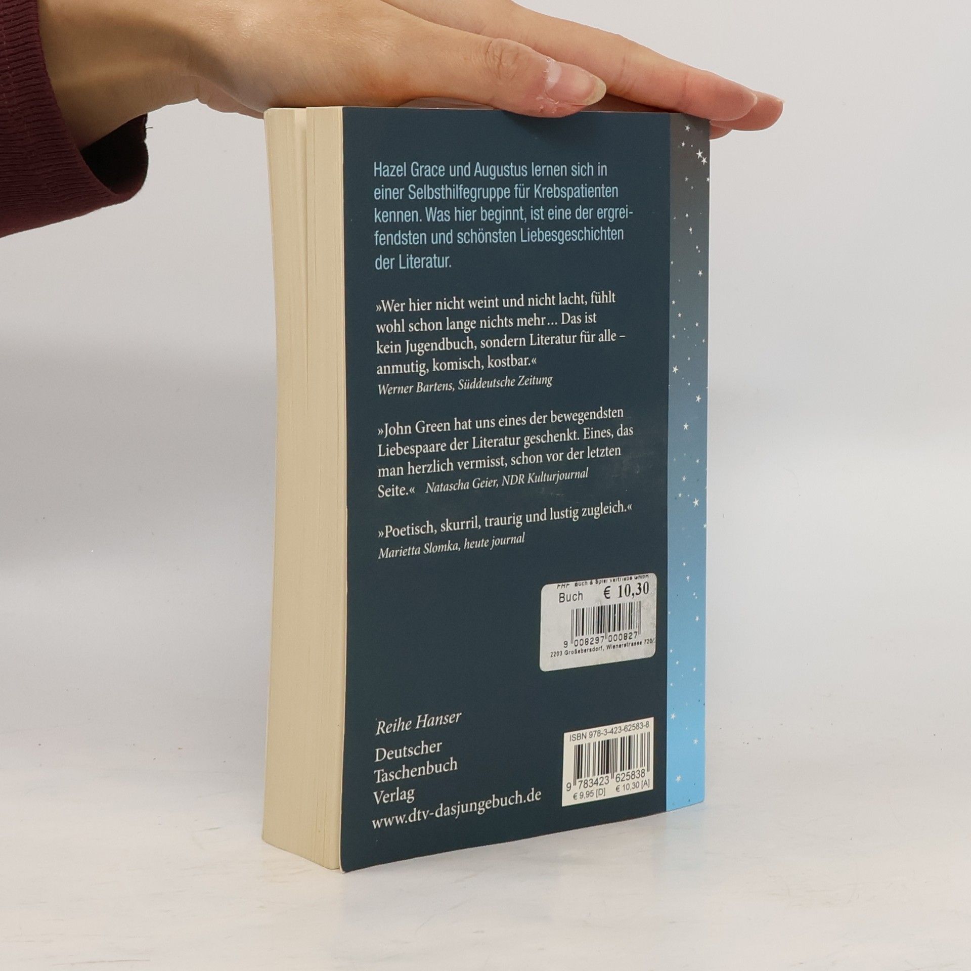 „Krebsbücher sind doof“, sagt die 16-jährige Hazel, die selbst Krebs hat. Sie will auf gar keinen Fall bemitleidet werden und kann mit Selbsthilfegruppen nichts anfangen. Bis sie in einer Gruppe auf den intelligenten, gut aussehenden und umwerfend schlagfertigen Gus trifft. Der geht offensiv mit seiner Krankheit um. Hazel und Gus diskutieren Bücher, hören Musik, sehen Filme und verlieben sich ineinander - trotz ihrer Handicaps und Unerfahrenheit. Gus macht Hazels großen Traum wahr: Gemeinsam fliegen sie nach Amsterdam, um dort Peter Van Houten zu treffen, den Autor von Hazels absolutem Lieblingsbuch. Ein tiefgründiges, emotionales und zugleich freches Jugendbuch über Krankheit, Liebe und Tod. Ausgezeichnet mit dem Deutschen Jugendliteraturpreis 2013 (Preis der Jugendjury).