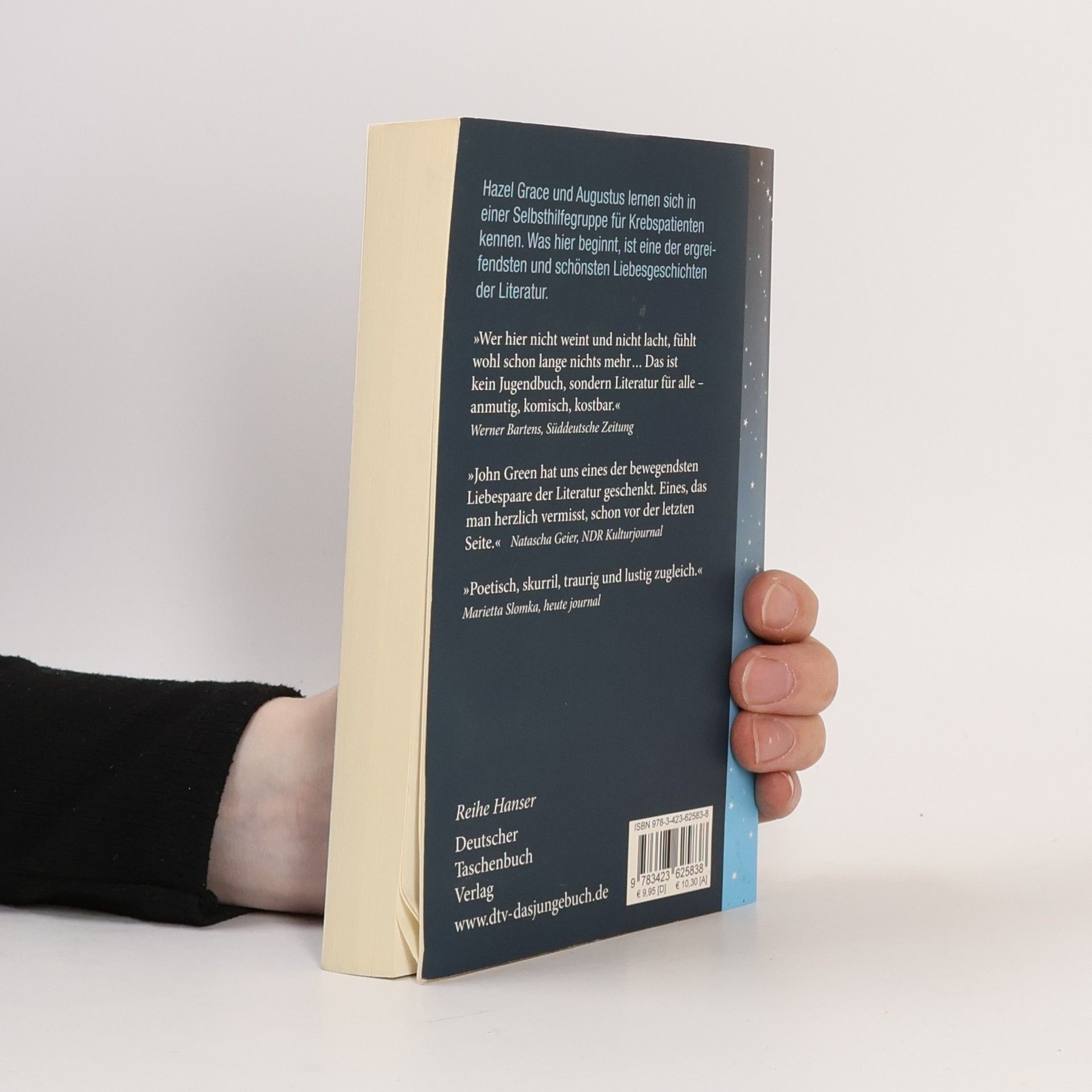 „Krebsbücher sind doof“, sagt die 16-jährige Hazel, die selbst Krebs hat. Sie will auf gar keinen Fall bemitleidet werden und kann mit Selbsthilfegruppen nichts anfangen. Bis sie in einer Gruppe auf den intelligenten, gut aussehenden und umwerfend schlagfertigen Gus trifft. Der geht offensiv mit seiner Krankheit um. Hazel und Gus diskutieren Bücher, hören Musik, sehen Filme und verlieben sich ineinander - trotz ihrer Handicaps und Unerfahrenheit. Gus macht Hazels großen Traum wahr: Gemeinsam fliegen sie nach Amsterdam, um dort Peter Van Houten zu treffen, den Autor von Hazels absolutem Lieblingsbuch. Ein tiefgründiges, emotionales und zugleich freches Jugendbuch über Krankheit, Liebe und Tod. Ausgezeichnet mit dem Deutschen Jugendliteraturpreis 2013 (Preis der Jugendjury).