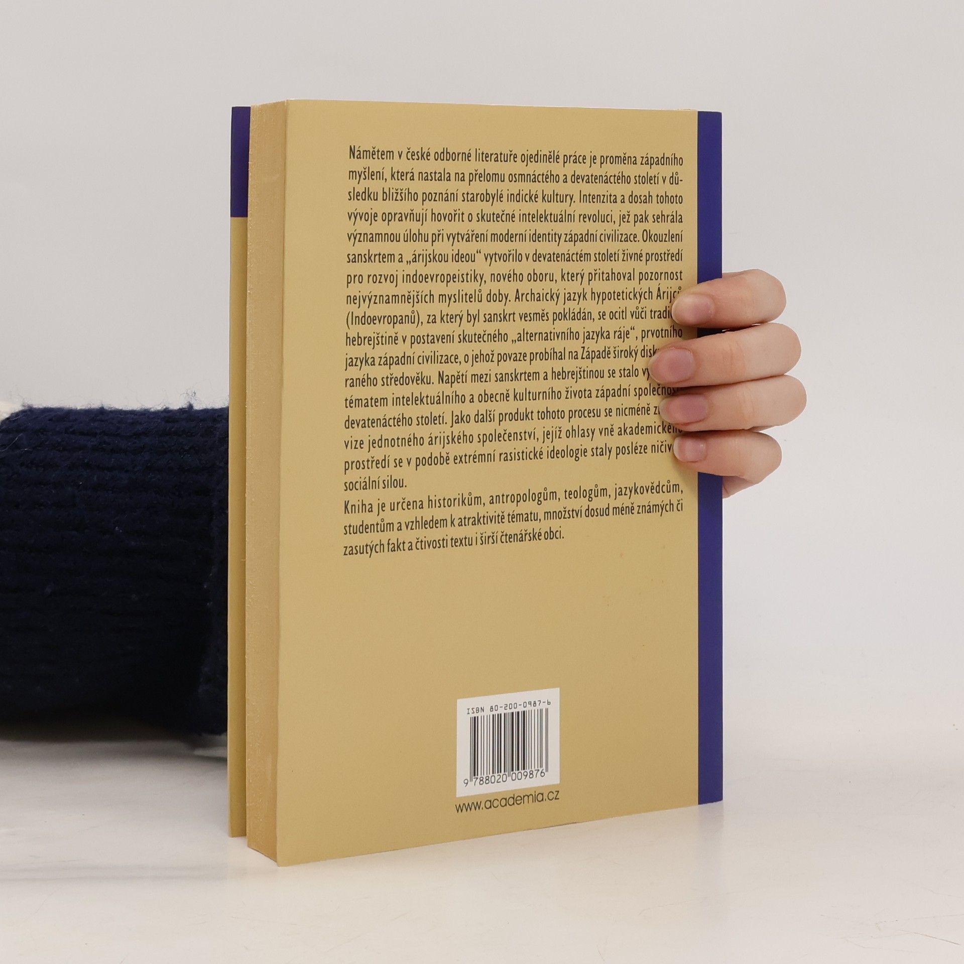 Utváření novověké západní identity v kontextu orientální renesance Kniha se zaměřuje na proměnu západního myšlení, která nastala na přelomu 18. a 19. století v důsledku poznávání starobylé indické kultury. Napětí mezi sanskrtem a hebrejštinou bylo výrazným tématem intelektuálního života tehdejší západní společnosti. Zrodila se vize jednotného árijského (indoevropského) společenství, jež byla shledána nosnou pro konstrukci moderní identity západní civilizace.