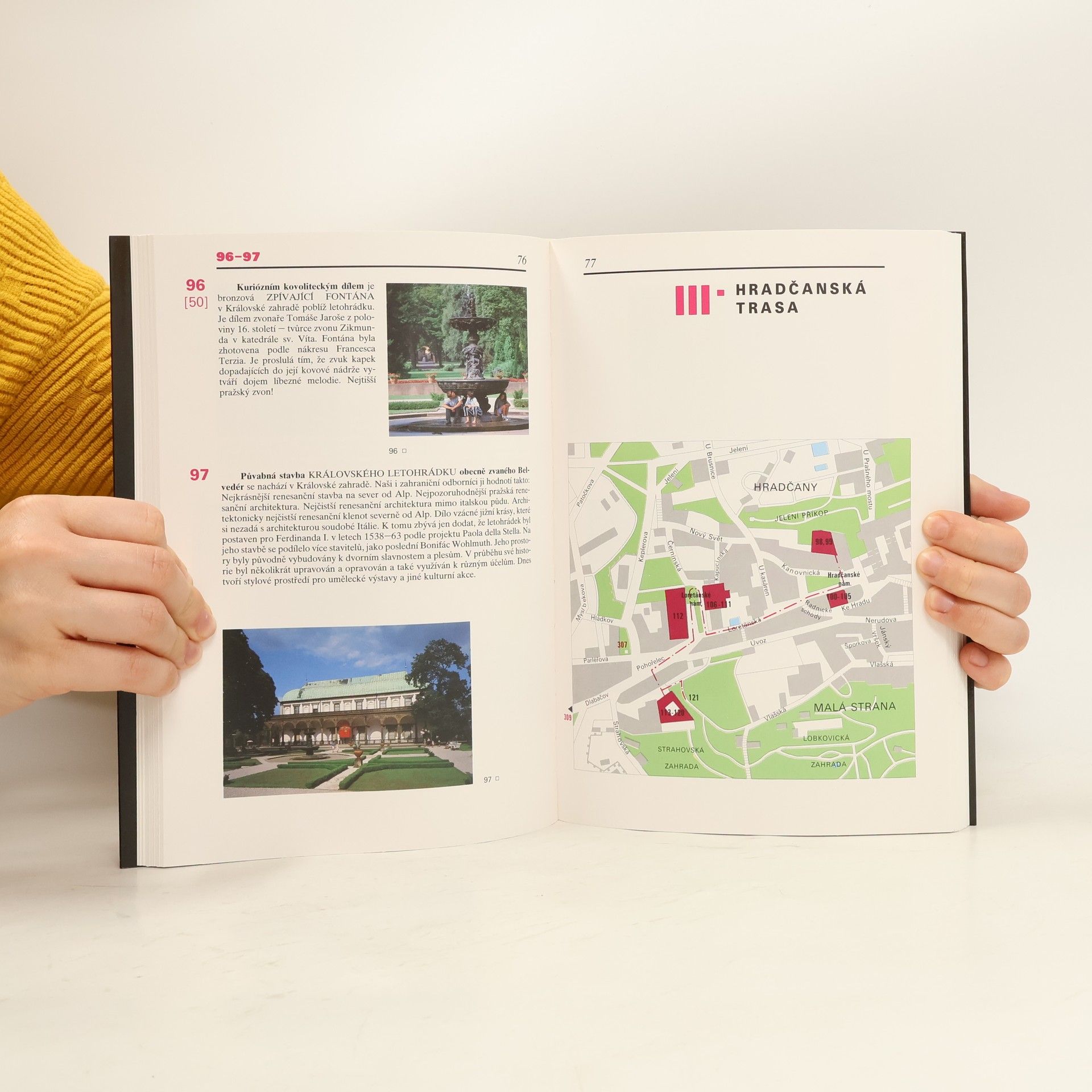 Autor usiluje o to, co se žádnému pořadateli s definitivní platností podařit nemůže: pátrá v této množině a vybírá z ní objekty s absolutním prvenstvím. Měří výšky věží, přepočítává drahokamy nejrůznějších pražských pokladů, ze šera muzeí loví na světlo unikáty podle svého originálního třídění, jinde zas poutavě vypráví svým čtenářům pravdivé příběhy i legendy, na něž se v jiných pražských průvodcích nedostalo. Ale je tu ještě něco navíc: téměř poslepu je autor vyvede na řadu vyhlídek, aby doširoka otevřeli oči teprve tam, aby si z různých úhlů opakovaně četli v pražských monumentech a tak si zapamatovali Prahu nejen zevnitř, ale také zvenčí.