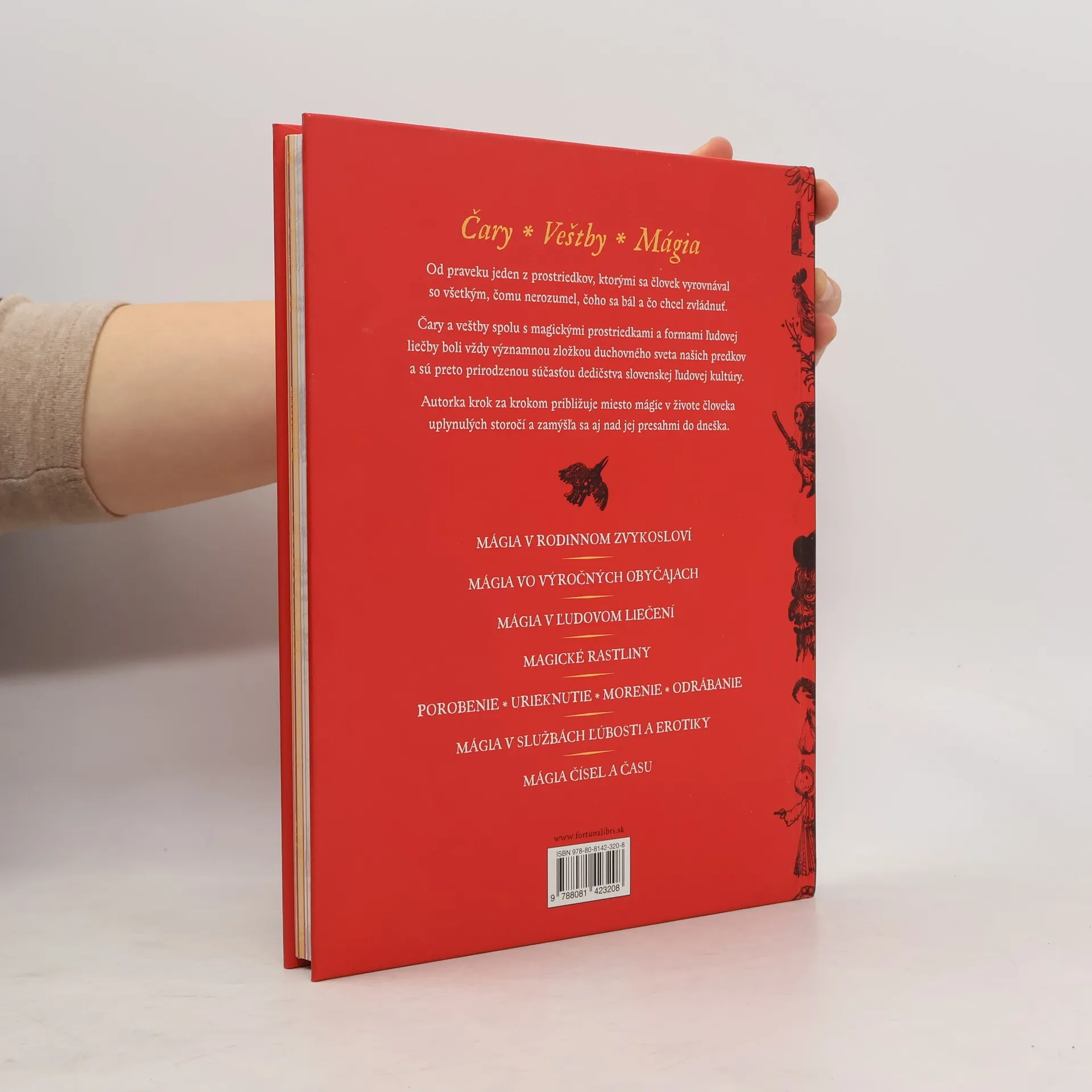 Čary a veštby. Mágia v ľudovej kultúre Slovenska opäť začiera do nevyčerpateľnej studnice našej tradičnej kultúry, pričom svojsky nadväzuje na tematiku prvého diela - Slovenský rok. Čary a veštby spolu s magickými prostriedkami a formami ľudovej liečby boli vždy významnou zložkou duchovného sveta našich predkov a prirodzenou súčasťou dedičstva slovenskej ľudovej kultúry. Autorka predstavuje mágiu v rodinnom zvykosloví, vo výročných obyčajach, v ľudovom liečení, mágiu v službách ľúbosti a erotiky, magické rastliny či mágiu čísel a času. Krok za krokom približuje miesto mágie v živote človeka uplynulých storočí a zamýšľa sa aj nad jej presahmi do dneška. Text dopĺňajú a konkretizujú ukážky ľudovej slovesnosti a sprevádzajú invenčné ilustrácie Martina Kellenbergera.
