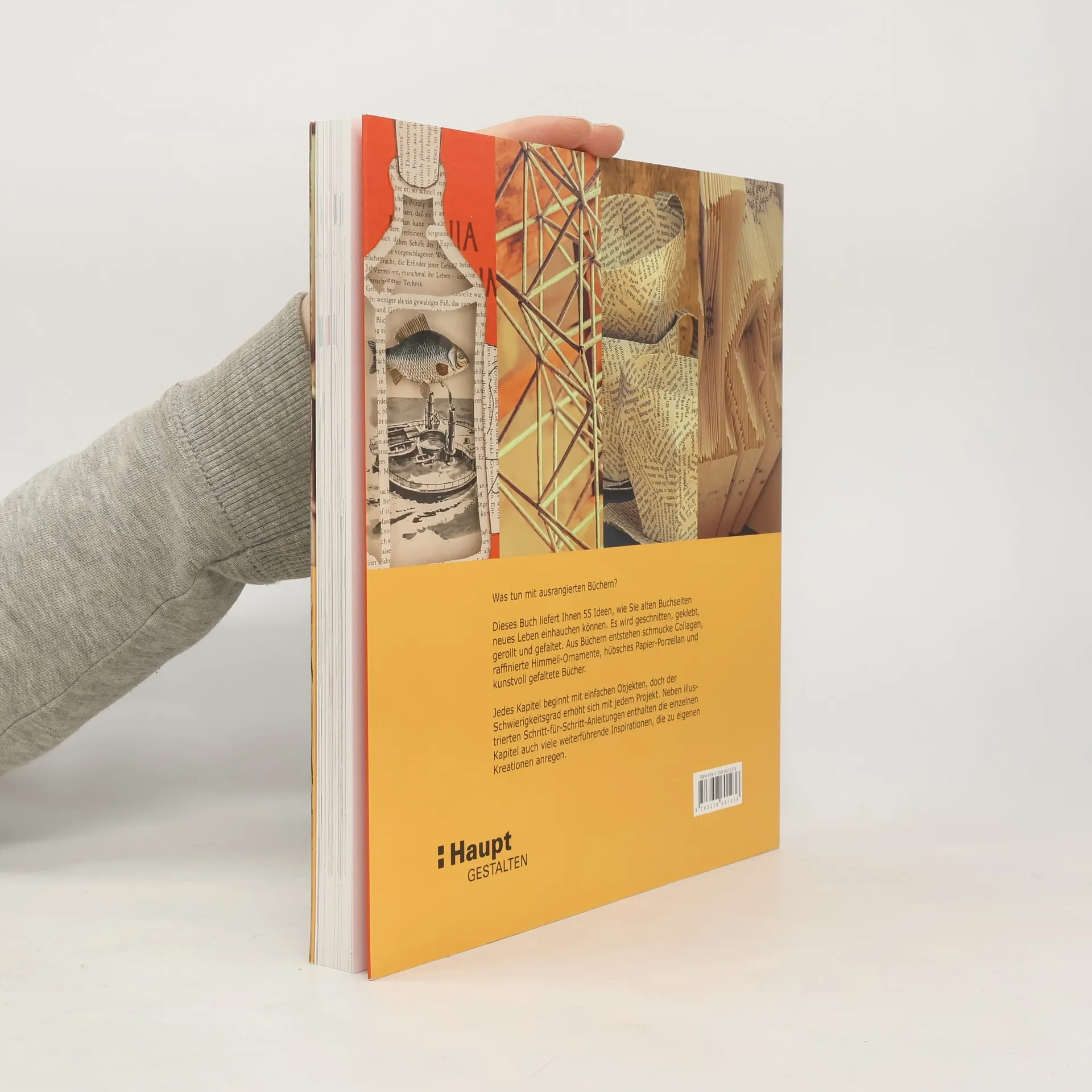 Das neue HauptBuch zum Trendthema «Kunst aus Büchern»: 55 Projekte von einfach bis raffiniert Klare Schritt-für-Schritt-Anleitungen und viele Kopiervorlagen Collagen, Himmeli, Papierporzellan, Faltobjekte in vielen Variationen Was tun mit ausrangierten Büchern? «Papier-Objekte aus alten Büchern» gibt mit 55 Projekten Ideen, wie den alten Buchseiten neues Leben eingehaucht wird. Es wird geschnitten, geklebt, gerollt und gefaltet. Aus den alten Buchseiten entstehen schmucke Collagen zum Aufkleben, raffinierte Himmeli-Ornamente zum Aufhängen, hübsches Papier-Porzellan und -Besteck und kunstvoll gefaltete Bücher zum Ausstellen. Jedes Kapitel beginnt mit einfachen Objekten, doch der Schwierigkeitsgrad steigt von Projekt zu Projekt. Neben illustrierten Schritt-für-Schritt-Anleitungen enthalten die einzelnen Kapitel auch weiterführende Inspirationen und Projektideen. Zahlreiche Kopiervorlagen für die Projekte ergänzen das Buch.