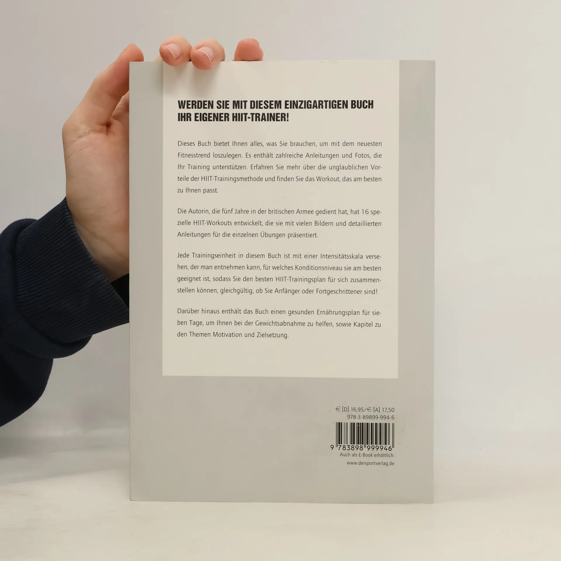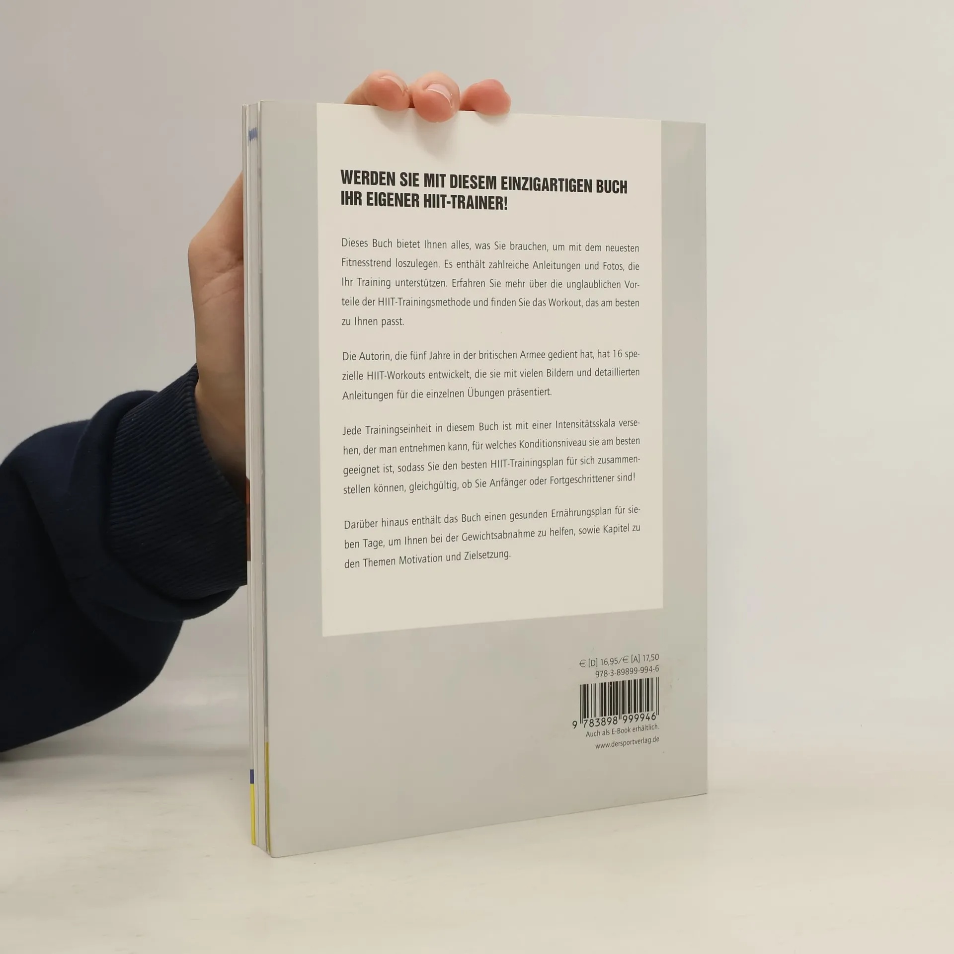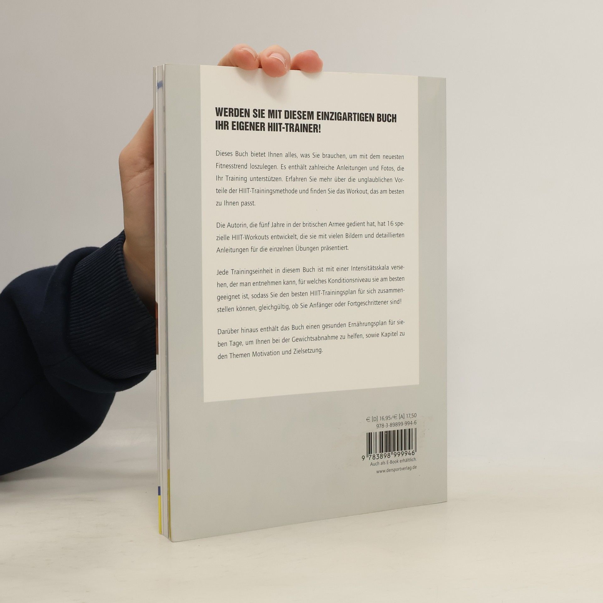 Dieses Buch bietet Ihnen alles, was Sie brauchen, um mit dem neuesten Fitnesstrend loszulegen. Es enthält zahlreiche Anleitungen und Fotos, die Ihr Training unterstützen. Erfahren Sie mehr über die unglaublichen Vorteile der HIIT-Trainingsmethode und finden Sie das Workout, das am besten zu Ihnen passt. Die Autorin, die fünf Jahre in der britischen Armee gedient hat, hat 16 spezielle HIIT-Workouts entwickelt, die sie mit vielen Bildern und detaillierten Anleitungen für die einzelnen Übungen präsentiert. Jede Trainingseinheit in diesem Buch ist mit einer Intensitätsskala versehen, der man entnehmen kann, für welches Konditionsniveau sie am besten geeignet ist, sodass Sie den besten HIIT-Trainingsplan für sich zusammenstellen können, gleichgültig, ob Sie Anfänger oder Fortgeschrittener sind! Darüber hinaus enthält das Buch einen gesunden Ernährungsplan für sieben Tage, um Ihnen bei der Gewichtsabnahme zu helfen, sowie Kapitel zu den Themen Motivation und Zielsetzung.