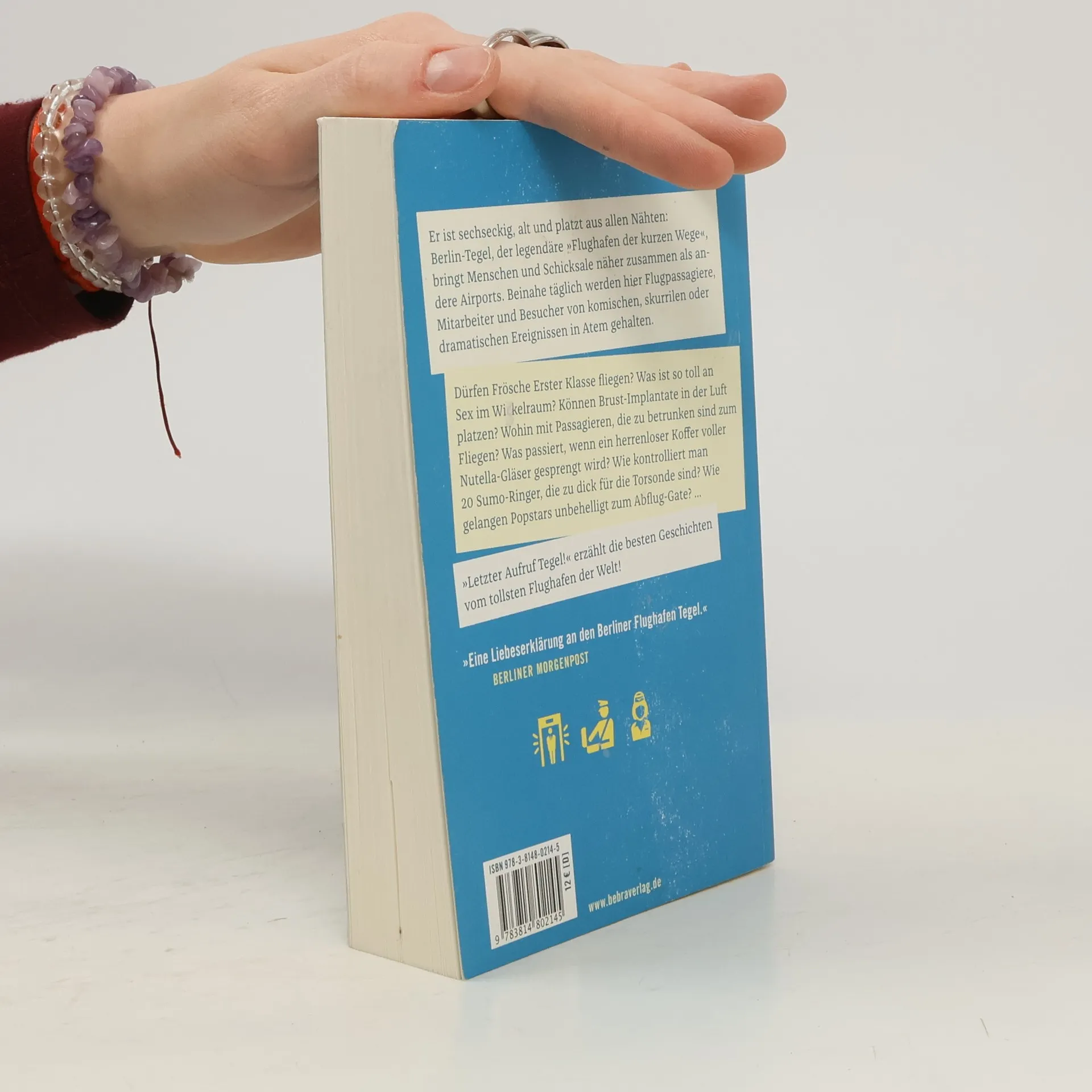 Er ist sechseckig, alt und platzt aus allen Nähten: Berlin-Tegel, der legendäre „Flughafen der kurzen Wege“, bringt Menschen und Schicksale näher zusammen als andere Airports. Beinahe täglich werden hier Flugpassagiere, Mitarbeiter und Besucher von komischen, skurrilen oder dramatischen Ereignissen in Atem gehalten. Dürfen Frösche Erster Klasse fliegen? Was ist so toll an Sex im Wickelraum? Können Brust-Implantate in der Luft platzen? Wohin mit Passagieren, die zu betrunken sind zum Fliegen? Was passiert, wenn ein herrenloser Koffer voller Nutella-Gläser gesprengt wird? Wie kontrolliert man einen Sumo-Ringer, der zu dick für die Torsonde ist? Wie gelangen Popstars unbehelligt zum Abflug-Gate? … Letzter Aufruf Tegel erzählt die besten Geschichten vom tollsten Flughafen der Welt! „Eine Liebeserklärung an den Berliner Flughafen Tegel.“ Berliner Morgenpost