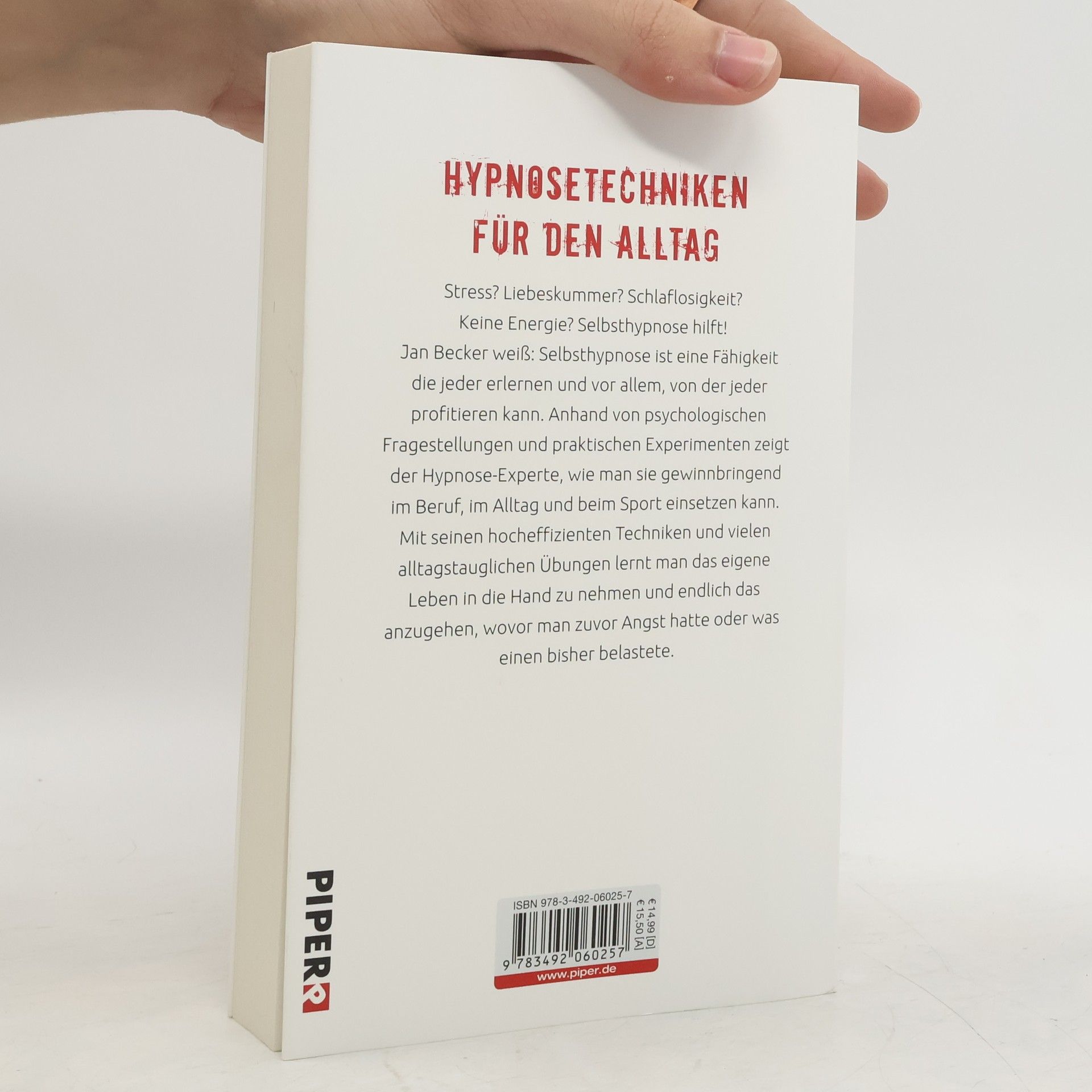 Der Hypnose-Experte Jan Becker erklärt in seinem neuen Buch die Kunst der Selbsthypnose und zeigt anhand von verschiedenen psychologischen Fragestellungen, wie man sie gewinnbringend im Beruf, im Alltag und beim Sport einsetzen kann, z. B. bei Stress, Liebeskummer, Schlaflosigkeit, Niedergeschlagenheit, fehlendem Antrieb, aber auch Konzentrationsschwäche, lästigen Gewohnheiten oder Vorhaben, die uns besonders fordern. Mit seinen hocheffizienten Techniken kann man sein eigenes Leben in die Hand nehmen und endlich angehen, wovor man zuvor Angst hatte oder was einen bisher belastete. Mit vielen praktischen Übungen.