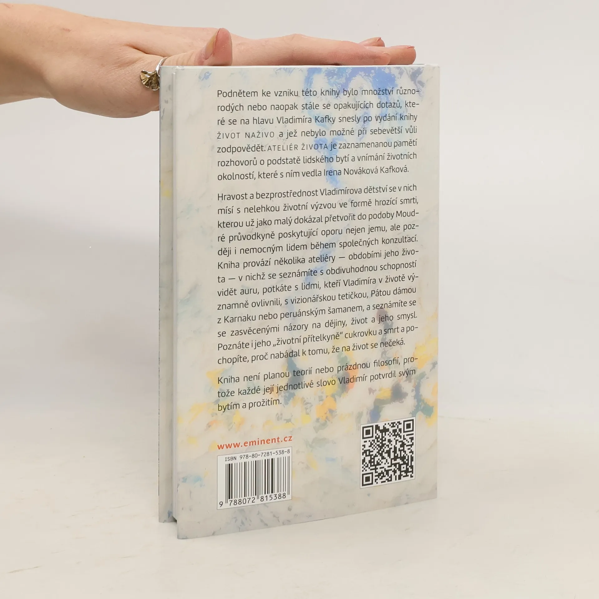 Tak pravil Vladimír Kafka. Za vznikem knihy stála řada různorodých nebo stále se opakujících otázek, které se na Vladimíra Kafku snesly po vydání knihy Život naživo a jež nebylo možné při sebevětší vůli zodpovědět. Kniha je pamětí rozhovorů o podstatě bytí a vnímání životních okolností, které s ním vedla Irena Nováková Kafková. Mísí se v nich hravost Vladimírova dětství s nelehkou životní výzvou ve formě hrozící smrti, kterou už jako malý dokázal přetvořit do podoby Moudré průvodkyně poskytující oporu nejen jemu, ale později i nemocným lidem během konzultací. Provází několika ateliéry - obdobími jeho života, v nichž se seznámíte se schopností vidět auru, potkáte s lidmi, kteří ho ovlivnili, vizionářskou tetičkou, Pátou dámou z Karnaku nebo peruánským šamanem, a seznámíte se s názory na dějiny, život a jeho smysl. Poznáte i jeho "životní přítelkyně" cukrovku a smrt a pochopíte, proč nabádal k tomu, že na život se nečeká.