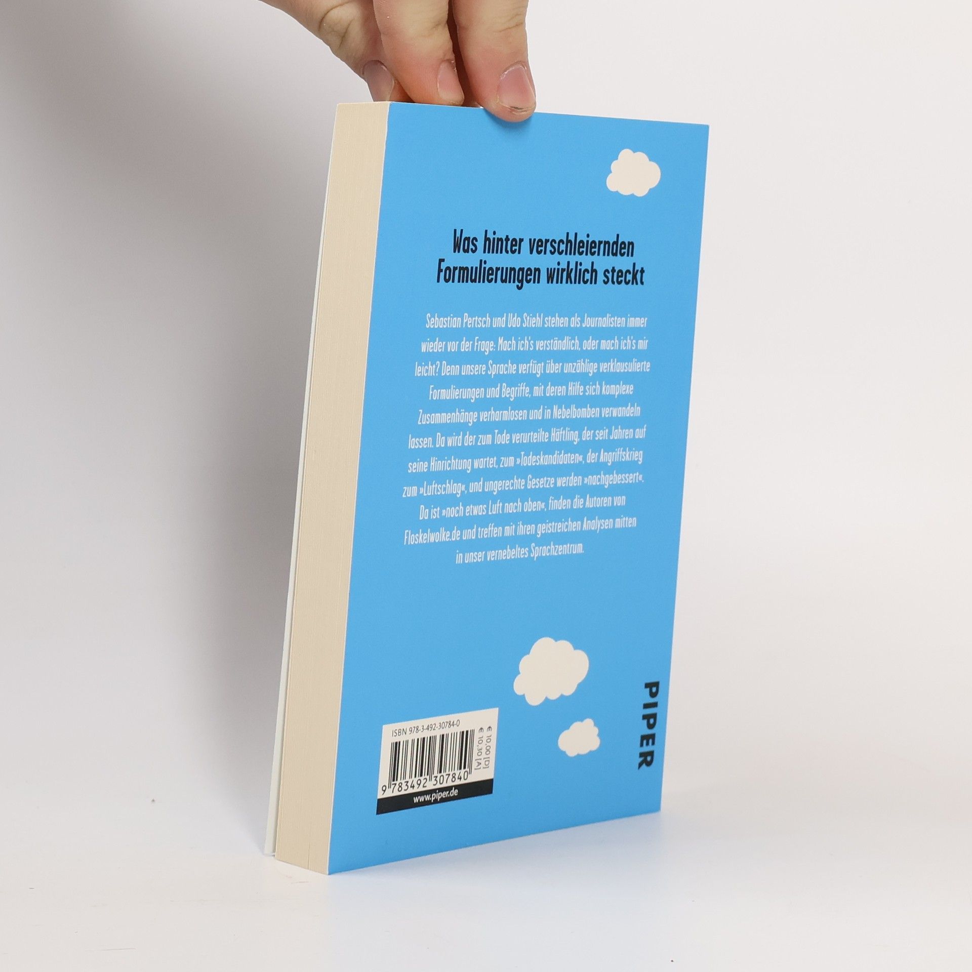 Sebastian Pertsch und Udo Stiehl stehen als Journalisten immer wieder vor der Frage: Mach ich´s verständlich, oder mach ich´s mir leicht? Denn unsere Sprache verfügt über unzählige klausulierte Formulierungen und Begriffe, mit deren Hilfe sich komplexe Zusammenhänge verharmlosen und in Nebelbomben verwandeln lassen. Da wird der zum Tode verurteilte Häftling, der seit Jahren auf seine Hinrichtung wartet, zum „Todeskandidaten“, der Angriffskrieg zum „Luftschlag“ und ungerechte Gesetze werden „nachgebessert“. Da ist „noch etwas Luft nach oben“ finden die Autoren von Floskelwolke. de und treffen mit ihren geistreichen Analysen mitten in unser vernebeltes Sprachzentrum.
