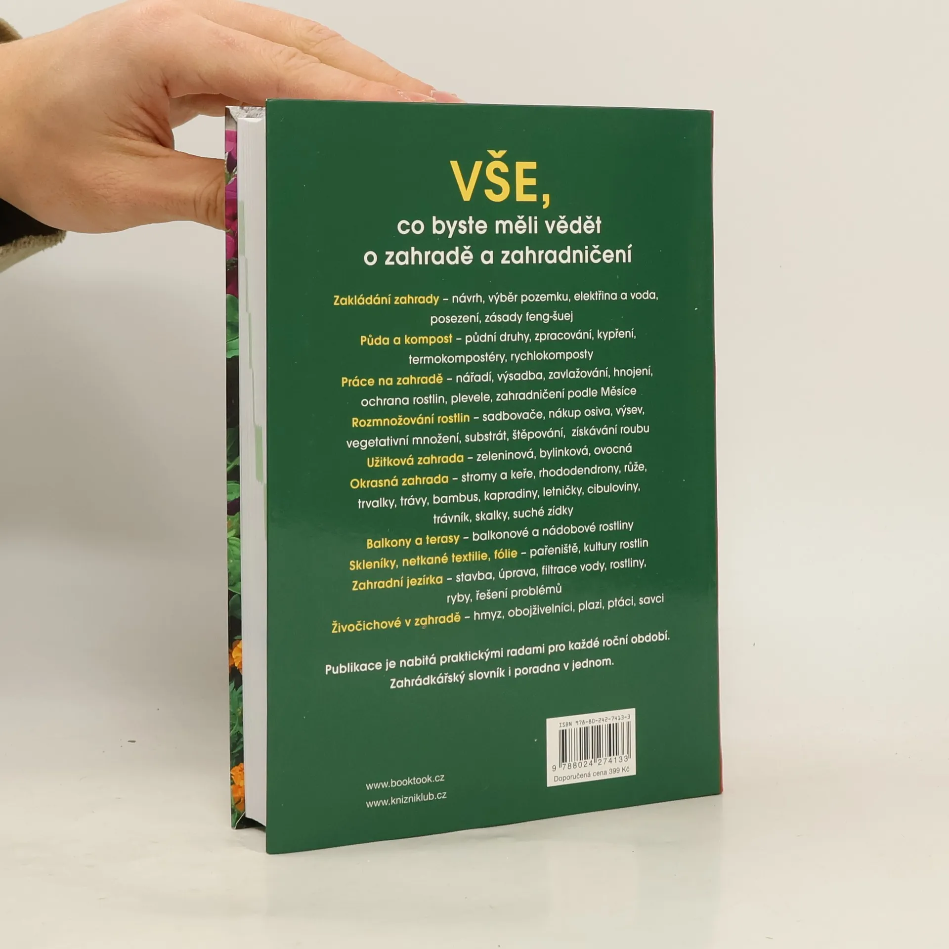 Vše, co byste měli vědět o zahradě a zahradničení: zakládání zahrady - návrh, výběr pozemku, elektřina a voda, posezení, zásady feng-šuej; půda a kompost - půdní druhy, zpracování, kypření, termokompostéry, rychlokomposty; práce na zahradě - nářadí, výsadba, zavlažování, hnojení, ochrana rostlin, plevele, zahradničení podle Měsíce; rozmnožování rostlin - sadbovače, nákup osiva, výsev, vegetativní množení, substrát, štěpování, získávání roubu; užitková zahrada - zeleninová, bylinková, ovocná; okrasná zahrada - stromy a keře, rhododendrony, růže, trvalky, trávy, bambus, kapradiny, letničky, cibuloviny, trávník, skalky, suché zídky; balkony a terasy - balkonové a nádobové rostliny; skleníky, netkané textilie, fólie - pařeniště, kultury rostlin; zahradní jezírka - stavba, úprava, filtrace vody, rostliny, ryby, řešení problémů; živočichové v zahradě - hmyz, obojživelníci, plazi, ptáci, savci. Publikace je nabitá praktickými radami pro každé roční období. Zahrádkářský slovník i poradna v jednom.