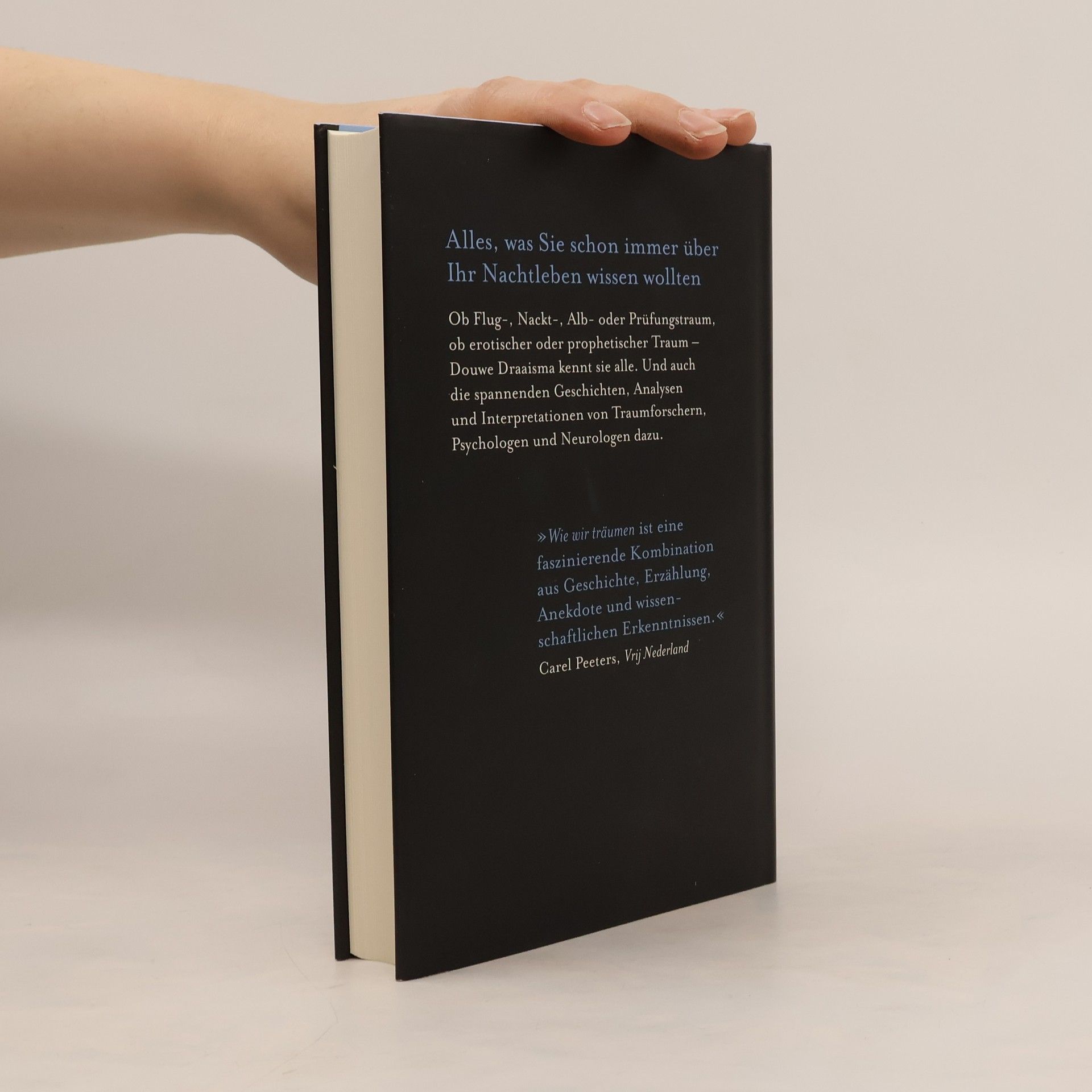 Alles, was Sie schon immer über Ihr Nachtleben wissen wollten. Ob Flug-, Nackt-, Alb- oder Prüfungstraum, ob erotischer oder prophetischer Traum – Douwe Draaisma kennt sie alle. Und auch die spannenden Geschichten, Analysen und Interpretationen von Traumforschern, Psychologen und Neurologen dazu. Manche Teile unseres Gehirns müssen wachen, während wir schlafen. Sie fangen an, seltsame Geschichten zu spinnen: Eine Prüfung muss wiederholt werden, die man schon vor Jahren bestanden hat. Man trifft Menschen, die nicht mehr leben. Plötzlich steht man nackt zwischen Kollegen, die sich darüber aber überhaupt nicht wundern. Oder man springt von einem steilen Felsen und kann wie ein Adler fliegen. Viele dieser Geschichten lösen sich beim Erwachen in Luft auf und sind schnell vergessen. Oft jedoch werfen sie Fragen auf und beschäftigen einen noch tagelang: Warum muss man im Traum immer durch Examen fallen, die man im wahren Leben längst bestanden hat? Wie kommt es zu der peinlichen Vorstellung, plötzlich irgendwo nackt herumzustehen? Weshalb träumt man, dass man fliegen kann? Douwe Draaisma durchquerte entschlossen alle möglichen Traumlandschaften. Auch ihn beschäftigte die Frage, was Träume bedeuten, ob sie etwas über den Träumenden aussagen, ja ob man sie vielleicht sogar steuern kann. Er durchstöberte ganze Bibliotheken von Schlaf- und Traumforschern, von Psychologen und Neurologen. Und stieß dabei auf immer noch spannendere Themen
