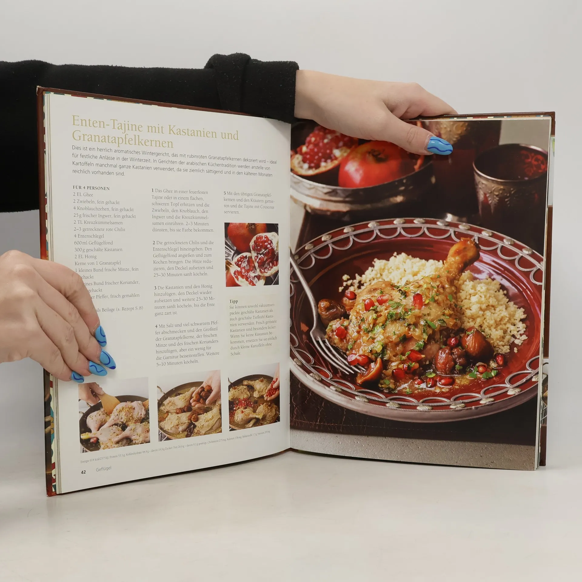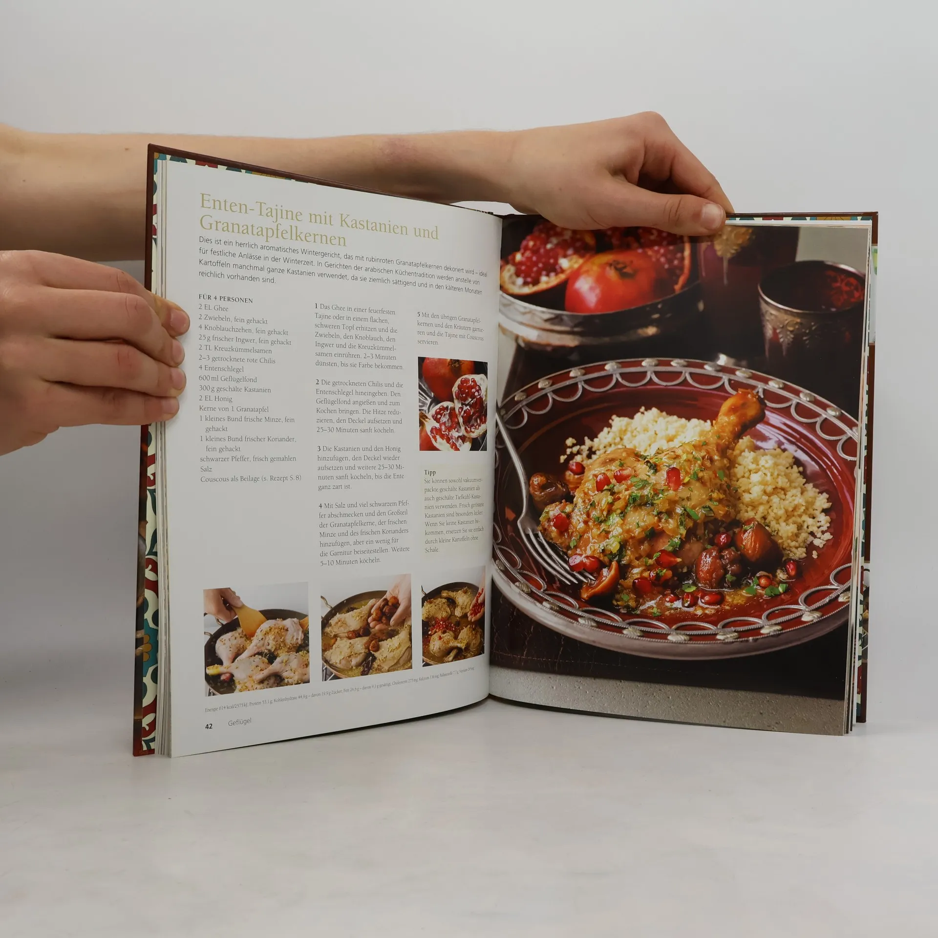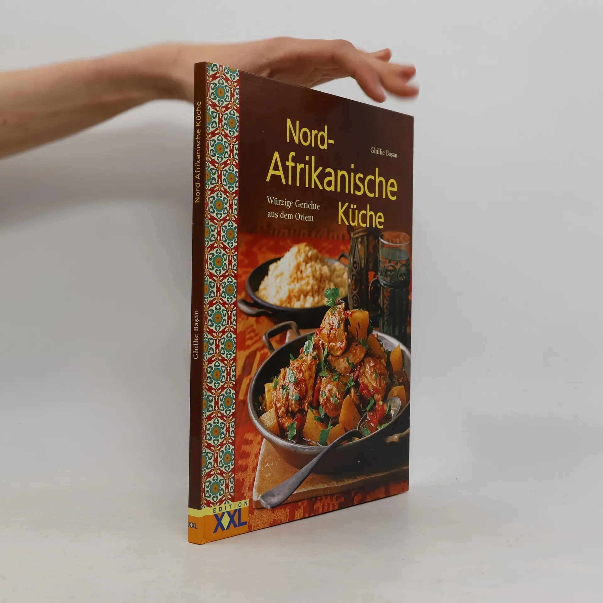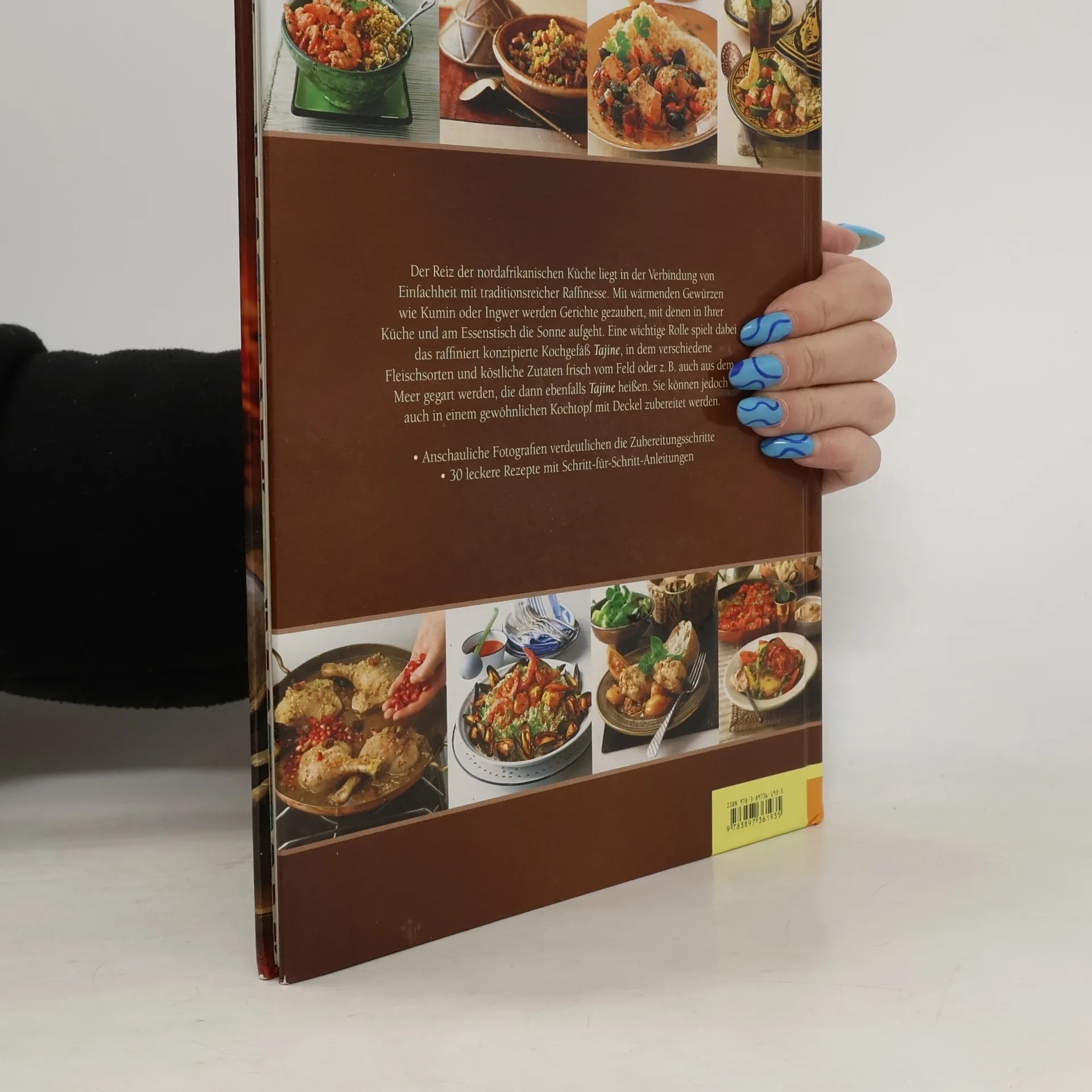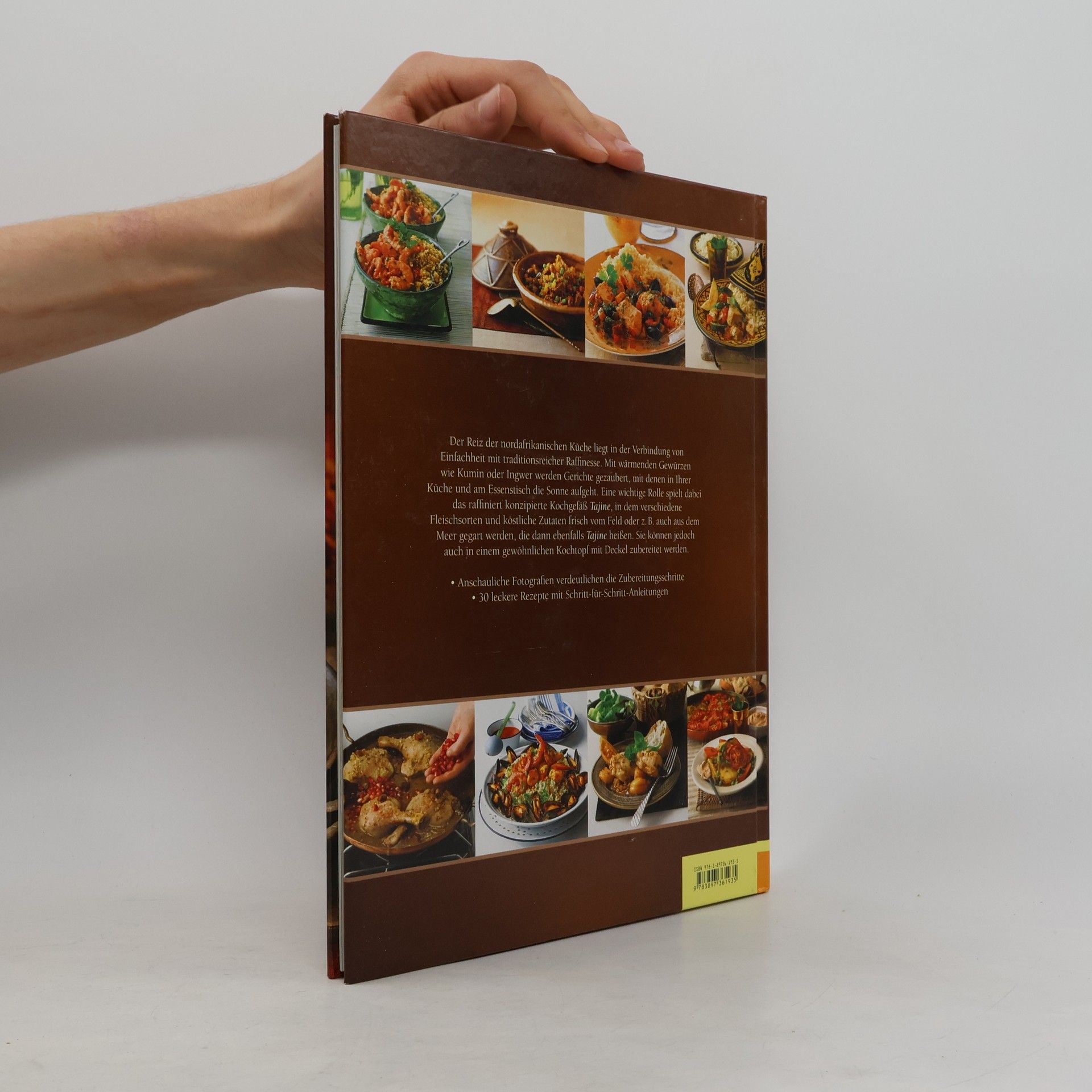 Der Reiz der nordafrikanischen Küche liegt in der Verbindung von Einfachheit mit traditionsreicher Raffinesse. Mit wärmenden Gewürzen wie Kumin oder Ingwer werden Gerichte gezaubert, mit denen in Ihrer Küche und am Essenstisch die Sonne aufgeht. Eine wichtige Rolle spielt dabei das raffiniert konzipierte Kochgefäß Tajine, in dem verschiedene Fleischsorten und köstliche Zutaten frisch vom Feld oder z. B. auch aus dem Meer gegart werden, die dann ebenfalls Tajine heißen. Sie können jedoch auch in einem gewöhnlichen Kochtopf mit Deckel zubereitet werden. Cover mit partieller Goldfolienprägung