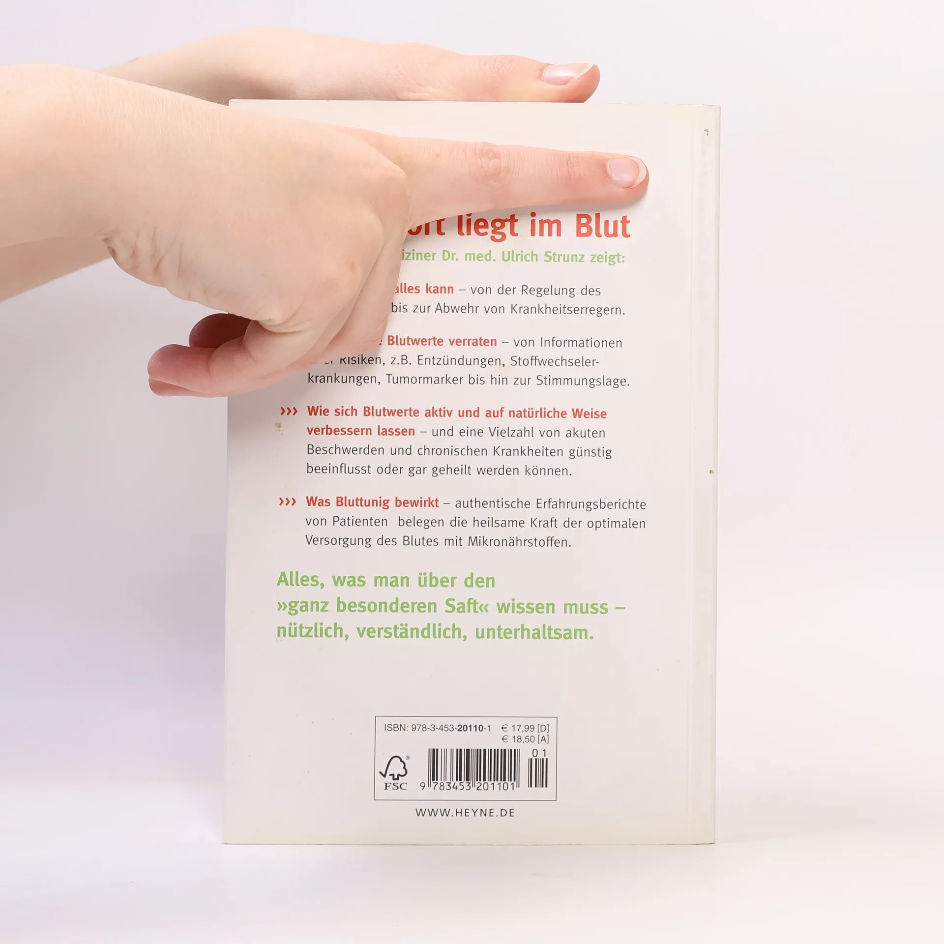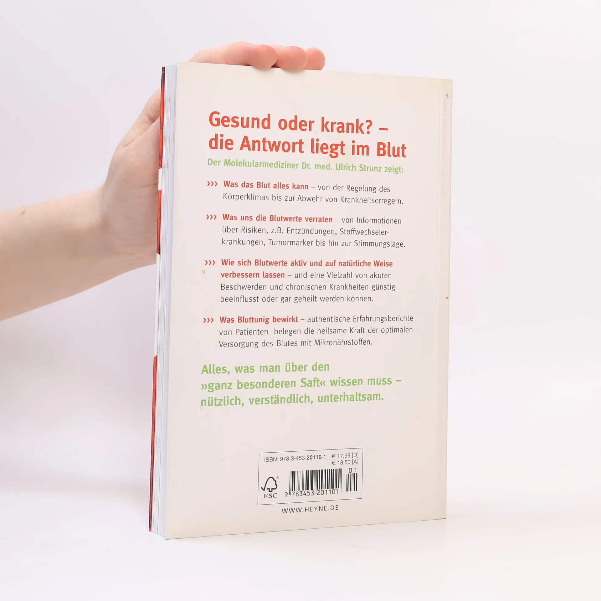 Gesundheit oder Krankheit – wir haben die Antwort im Blut »Ich zeige, welche Spitzenleistungen das Blut in unserem Körper vollbringt – wenn man ihm die richtigen Bausteine gönnt. Ich erzähle Geschichten aus meiner Praxis, die sich anhören wie Wunderheilungen, tatsächlich aber nichts anderes als das Ergebnis gesunder Blutwerte sind. Und ich erkläre, wie sich gesunde Blutwerte erreichen lassen – durch einfaches ›Bluttuning‹ mit Mikronährstoffen.« Ulrich Strunz Der Molekularmediziner verrät:• Was das Blut alles kann – von der Regelung des Körperklimas bis zur Abwehr von Krankheitserregern.• Was uns die Blutwerte verraten – von Informationen über Risiken (Entzündungen, Stoffwechselerkrankungen, Tumormarker etc.) bis zur Stimmungslage.• Wie sich Blutwerte aktiv verbessern lassen – und eine Vielzahl von Beschwerden und Krankheiten positiv beeinflusst oder gar geheilt werden kann.Alles Wissenswerte über den »ganz besonderen Saft« – gut recherchiert, gut lesbar, unterhaltsam und nützlich. Ausstattung: durchgehend 2c