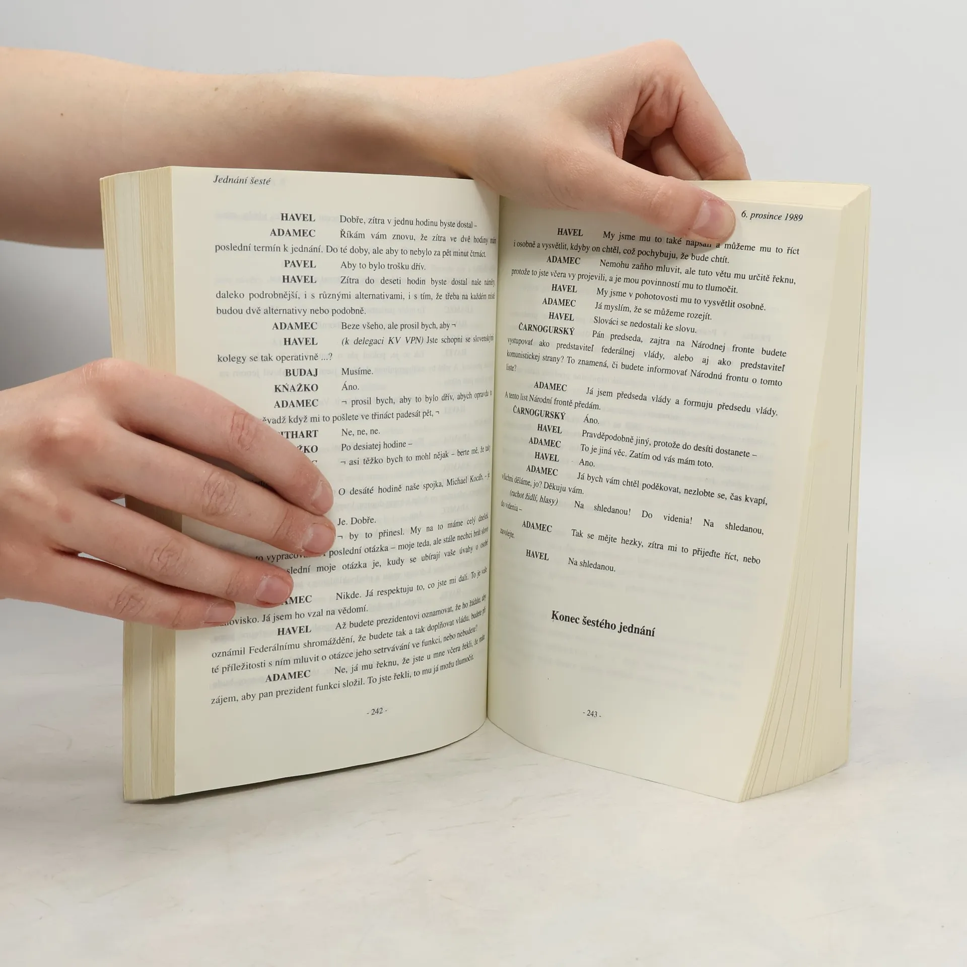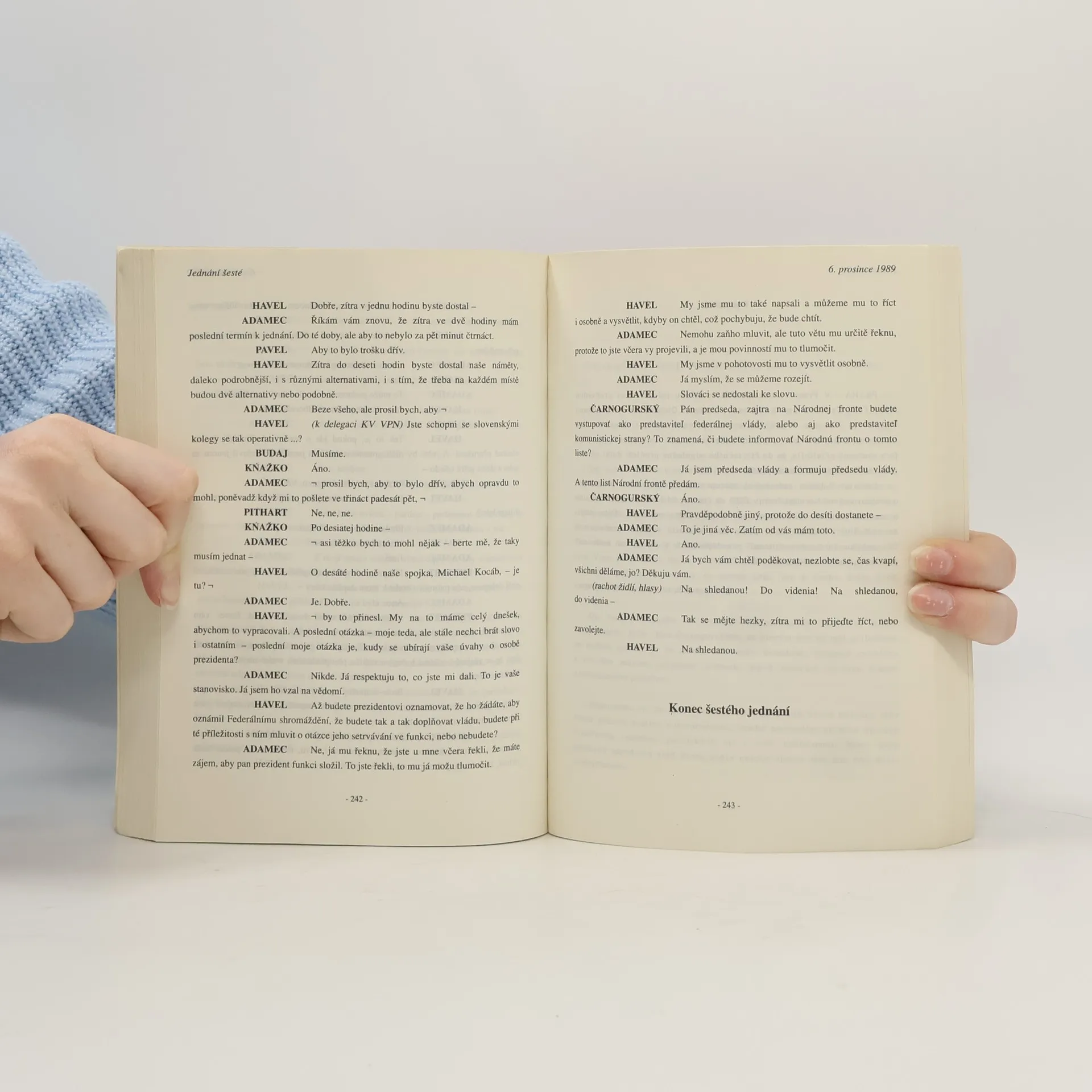 Vladimír Hanzel byl společně s Václavem Havlem jako jediný přítomen všem rozhovorům nastupujících demokratických sil s představiteli hroutícího se totoalitního režimu a pořídil jejich zvukový záznam. Jako jediný může podat vyčerpávající a úplné svědectví o rozhodujících momentechlistopadových a prosincových událostí roku 1989. Strhující výpověď z jednání představitelů státní moci s delegacemi hnutí Občanské fórum a Verejnosť proti násiliu přepsaná z autentických magnetofonových záznamů přibližuje tehdejší atmosféru, osobní postoje a charakteristiky i překvapivé reakce jednotlivých aktérů.