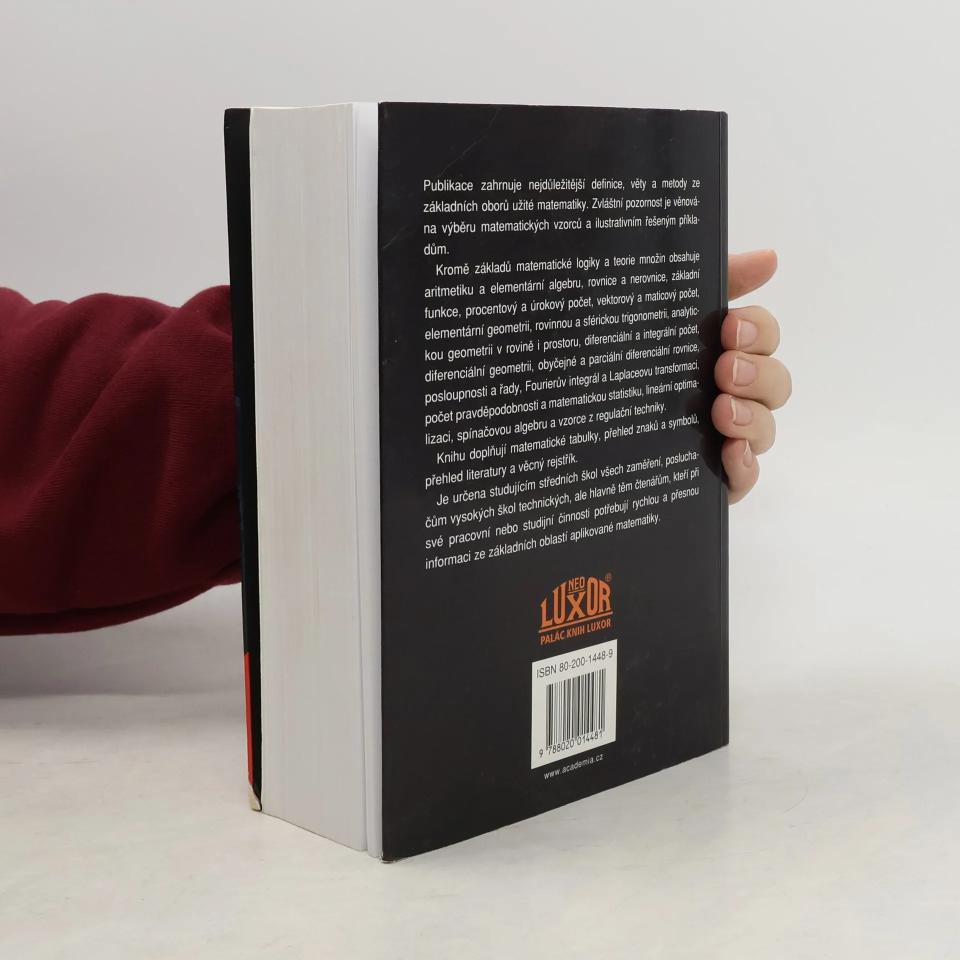 Publikace zahrnuje nejdůležitější definice, věty a metody ze základních oborů užité matematiky. Zvláštní pozornost je věnována výběru matematických vzorců a ilustrativním řešeným příkladům. Kromě základů matematické logiky a teorie množin obsahuje aritmetiku a elementární algebru, rovnice a nerovnice, základní funkce, procentový a úrokový počet, vektorový a maticový počet, elementární geometrii, rovinnou a sférickou trigonometrii, analytickou geometrii v rovině a prostoru, diferenciální a integrální počet, diferenciální geometrii, obyčejné a parciální diferenciální rovnice, posloupnosti a řady, Fourierův integrál a Laplaceovu transformaci, počet pravděpodobnosti a matematickou statistiku, lineární optimalizaci, spínačovou algebru a vzorce z regulační techniky. Knihu doplňují matematické tabulky, přehled znaků a symbolů, přehled literatury a věcný rejstřík. Je určena studujícím středních škol všech zaměření, posluchačům vysokých škol technických, ale hlavně těm čtenářům, kteří při své pracovní nebo studijní činnosti potřebují rychlou a přesnou informaci ze základní oblasti aplikované matematiky.