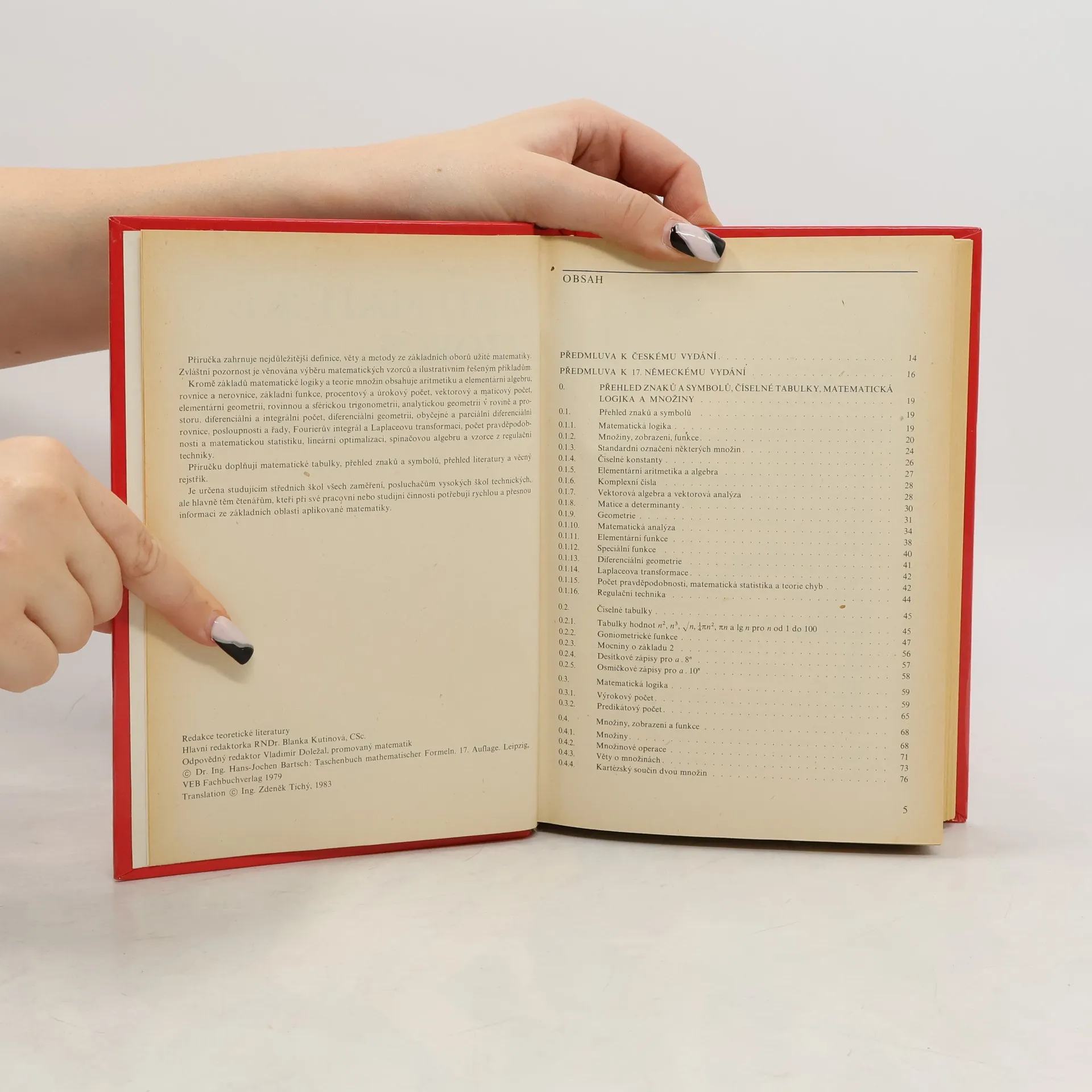 Publikace zahrnuje nejdůležitější definice, věty a metody ze základních oborů užité matematiky. Zvláštní pozornost je věnována výběru matematických vzorců a ilustrativním řešeným příkladům. Kromě základů matematické logiky a teorie množin obsahuje aritmetiku a elementární algebru, rovnice a nerovnice, základní funkce, procentový a úrokový počet, vektorový a maticový počet, elementární geometrii, rovinnou a sférickou trigonometrii, analytickou geometrii v rovině a prostoru, diferenciální a integrální počet, diferenciální geometrii, obyčejné a parciální diferenciální rovnice, posloupnosti a řady, Fourierův integrál a Laplaceovu transformaci, počet pravděpodobnosti a matematickou statistiku, lineární optimalizaci, spínačovou algebru a vzorce z regulační techniky. Knihu doplňují matematické tabulky, přehled znaků a symbolů, přehled literatury a věcný rejstřík. Je určena studujícím středních škol všech zaměření, posluchačům vysokých škol technických, ale hlavně těm čtenářům, kteří při své pracovní nebo studijní činnosti potřebují rychlou a přesnou informaci ze základní oblasti aplikované matematiky.