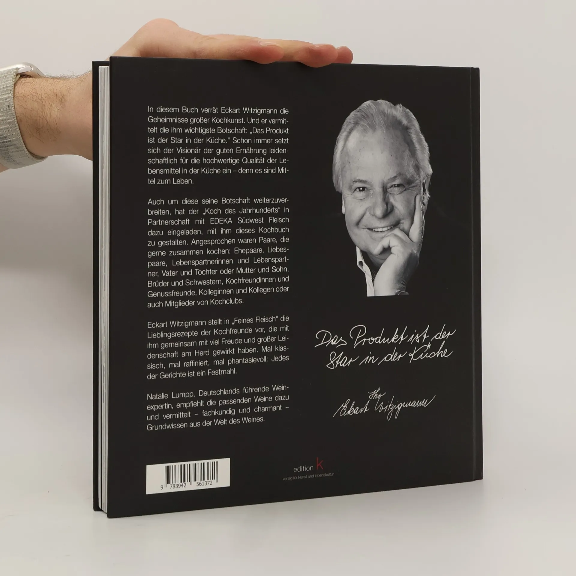 In diesem Buch verrät Eckart Witzigmann die Geheimnisse großer Kochkunst. Und er vermittelt die ihm wichtigste Botschaft: „Das Produkt ist der Star in der Küche.“ Schon immer setzt sich der Visionär der guten Ernährung leidenschaftlich für die hochwertige Qualität der Lebensmittel in der Küche ein – denn es sind Mittel zum Leben. Auch um diese seine Botschaft weiterzuverbreiten, hat der „Koch des Jahrhunderts“ in Partnerschaft mit EDEKA Südwest Fleisch dazu eingeladen, mit ihm dieses Kochbuch zu gestalten. Angesprochen waren Paare, die gerne zusammen kochen: Ehepaare, Liebespaare, Lebenspartnerinnen und Lebenspartner, Vater und Tochter oder Mutter und Sohn, Brüder und Schwestern, Kochfreundinnen und Genussfreunde, Kolleginnen und Kollegen oder auch Mitglieder von Kochclubs. Eckart Witzigmann stellt in „Feines Fleisch“ die Lieblingsrezepte der Kochfreunde vor, die mit ihm gemeinsam mit viel Freude und großer Leidenschaft am Herd gewirkt haben. Mal klassisch, mal raffiniert, mal phantasievoll: Jedes der Gerichte ist ein Festmahl. Natalie Lumpp, Deutschlands führende Weinexpertin, empfiehlt die passenden Weine dazu und vermittelt – fachkundig und charmant – Grundwissen aus der Welt des Weines.