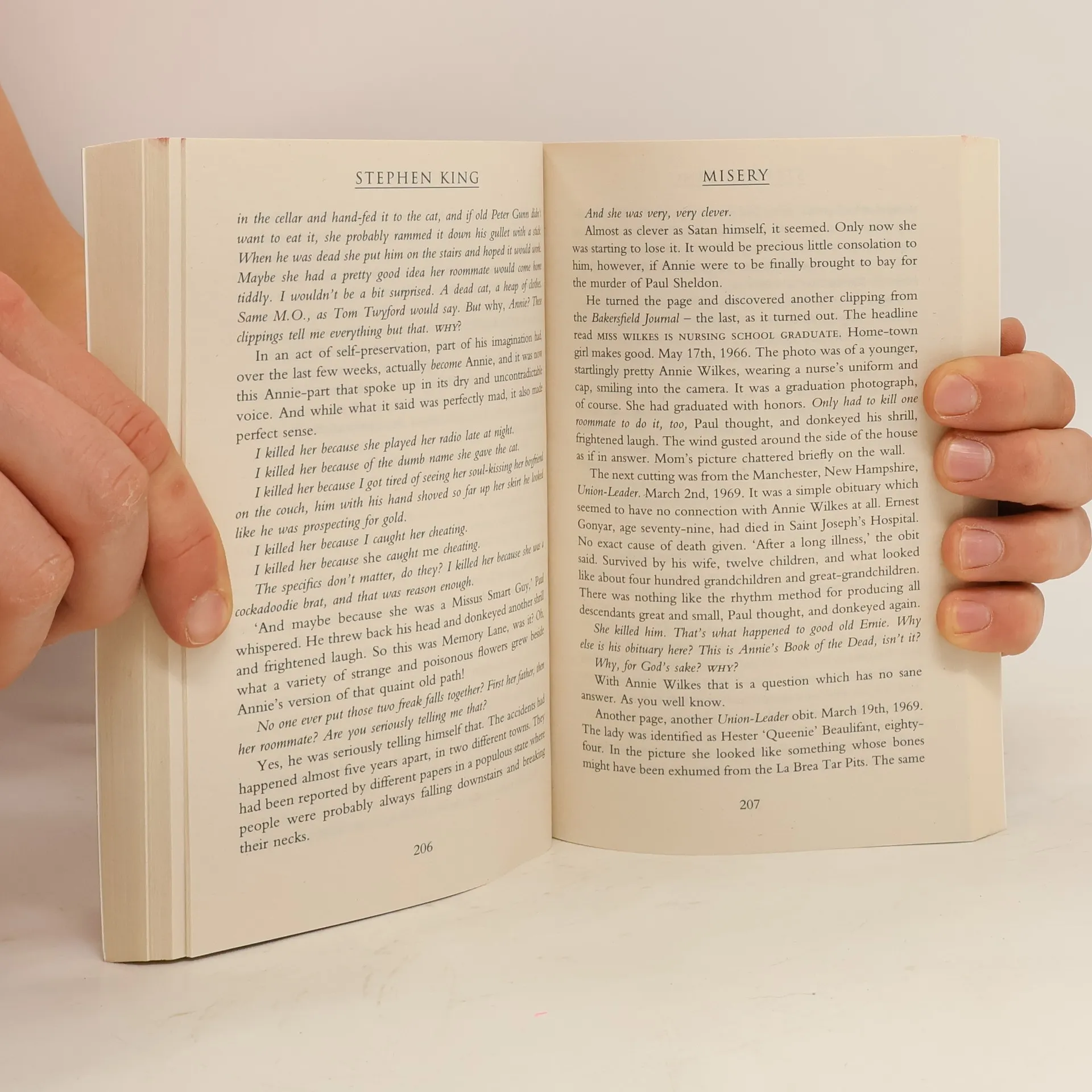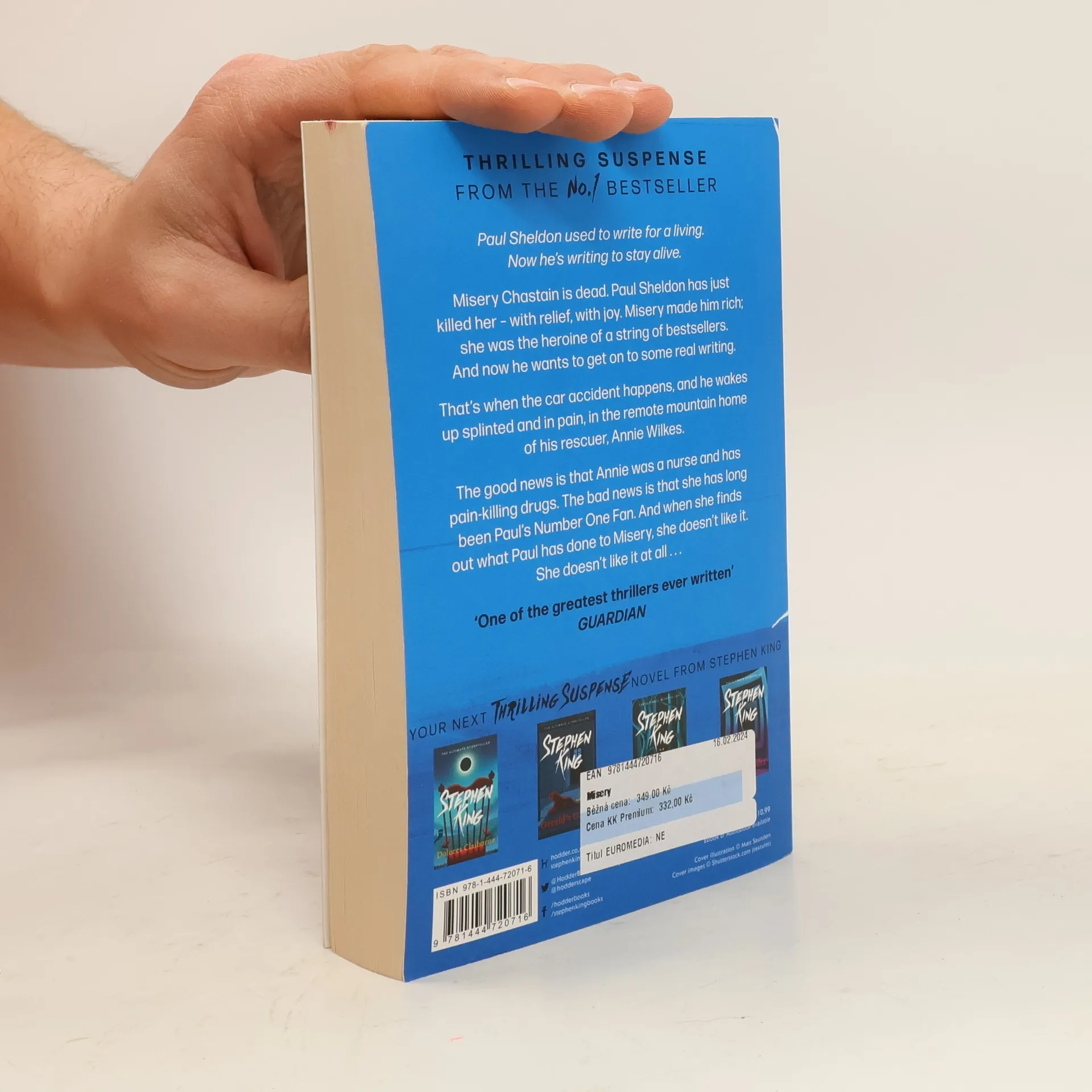 One of the true classics of psychological suspense, about a writer and his No. 1 fan, now with a stunning new cover look. Paul Sheldon used to write for a living. Now he's writing to stay alive. Misery Chastain is dead. Paul Sheldon has just killed her - with relief, with joy. Misery made him rich; she was the heroine of a string of bestsellers. And now he wants to get on to some real writing. That's when the car accident happens, and he wakes up splinted and in pain, in the remote mountain home of his rescuer, Annie Wilkes. The good news is that Annie was a nurse and has pain-killing drugs. The bad news is that she has long been Paul's Number One Fan. And when she finds out what Paul has done to Misery, she doesn't like it. She doesn't like it at all . . .